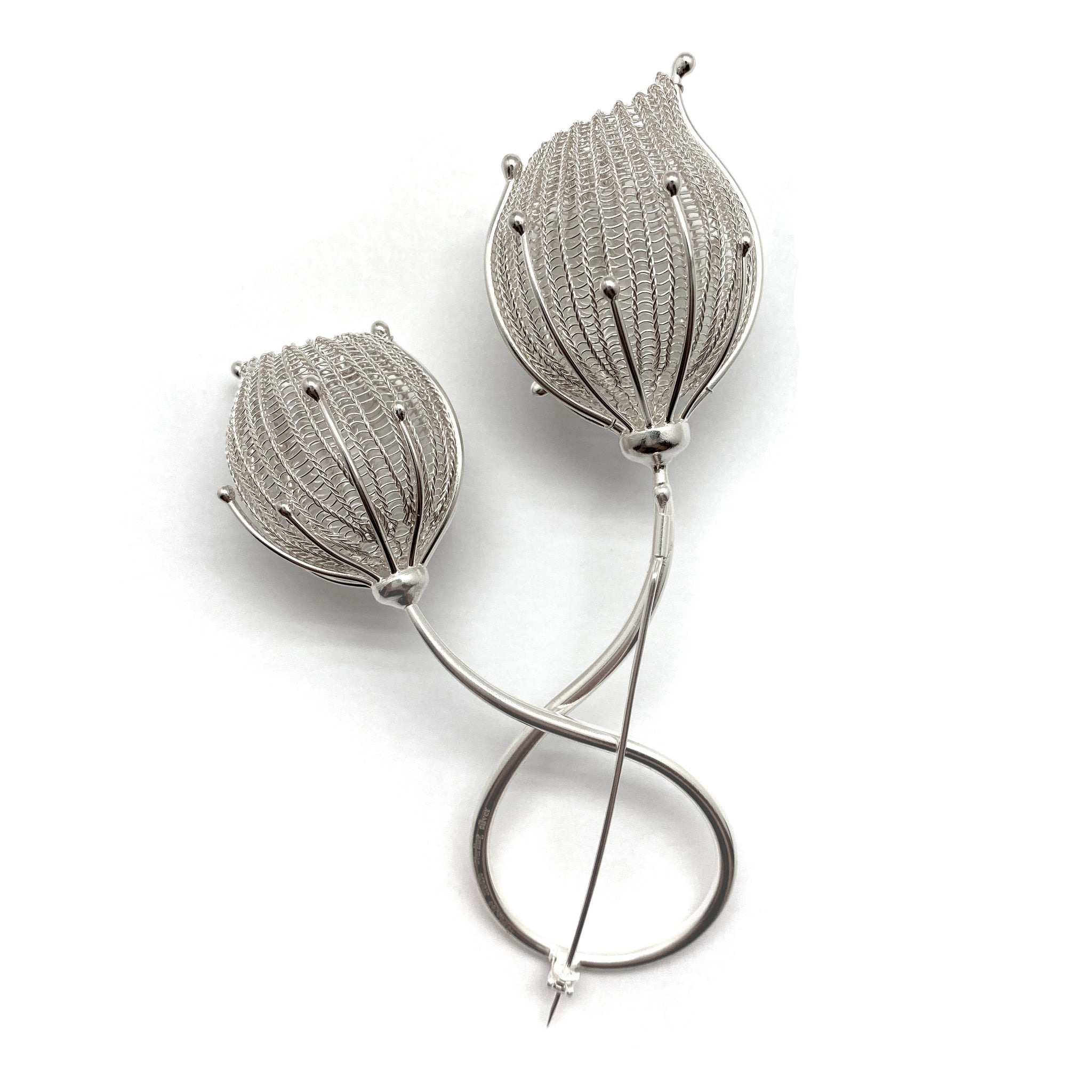 This twirling pin from Korean artist Sowon Joo stars two delicate dew drops. Made with a mix of cast and crocheted sterling silver, this piece will bring a bit of nature to every season.