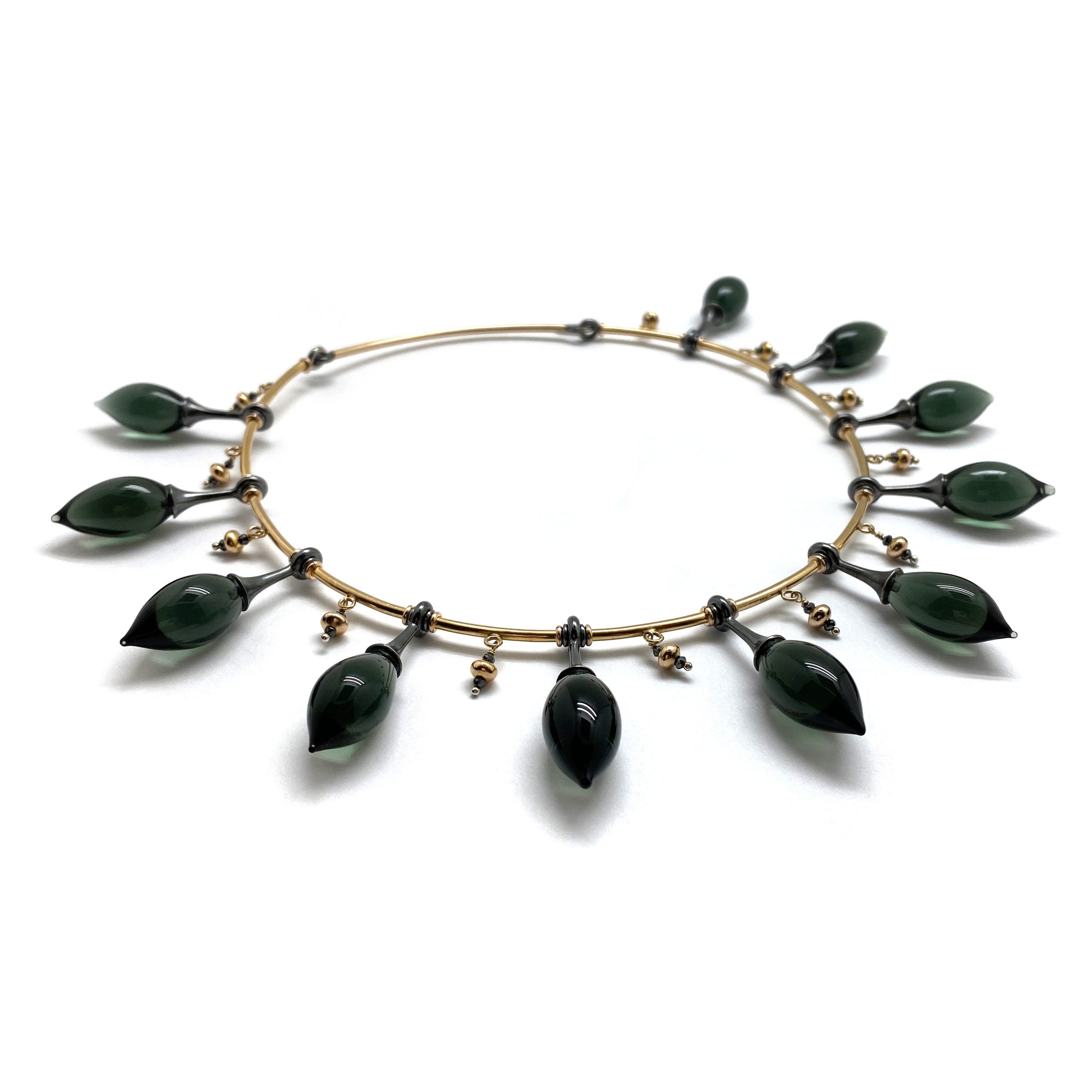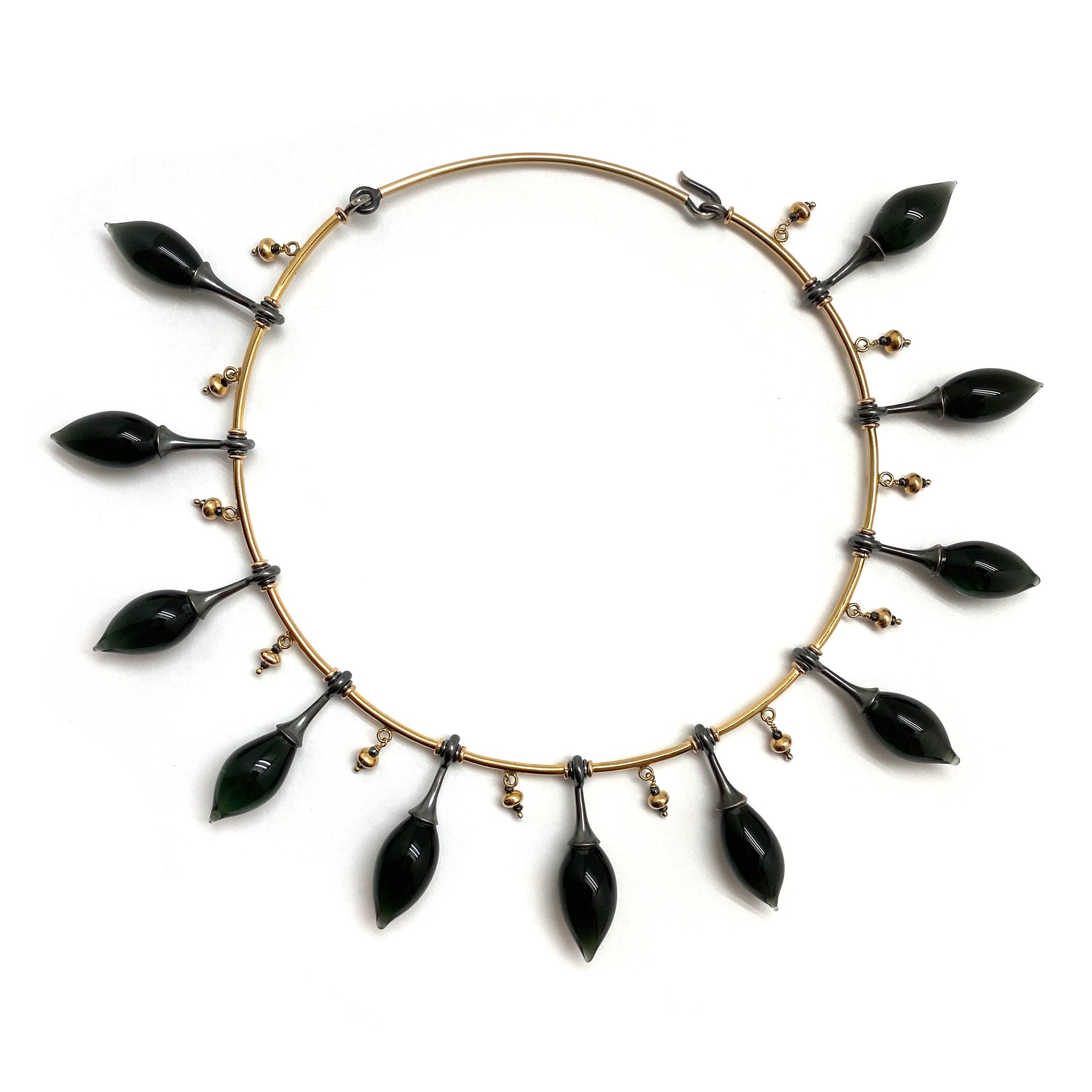 This spectacular necklace by Sowon Joo is a beautiful mix of fine art and fine jewelry. The pointed pieces of dark green glass extended from the gold fill collar in a dramatic fashion and are accented with black diamond beads for extra eyecatching shine.