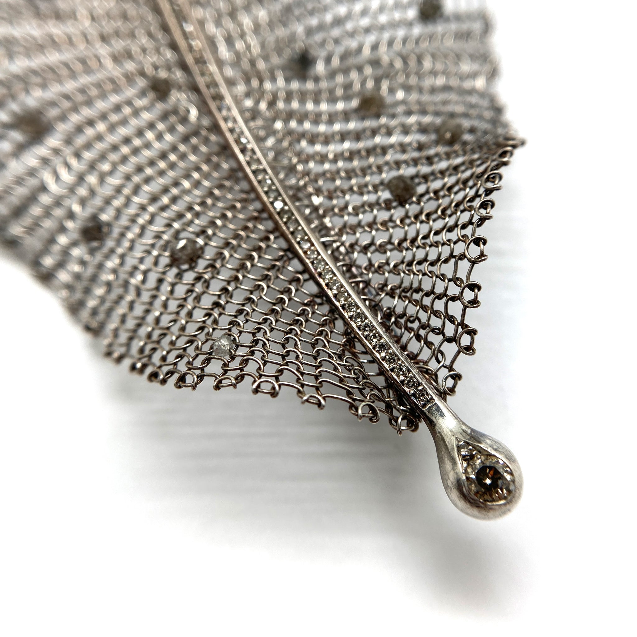 Made with crocheted sterling silver, this luxurious brooch is a dressy dream. This pin features a row of grey diamonds down the center and accents of rough diamonds throughout.