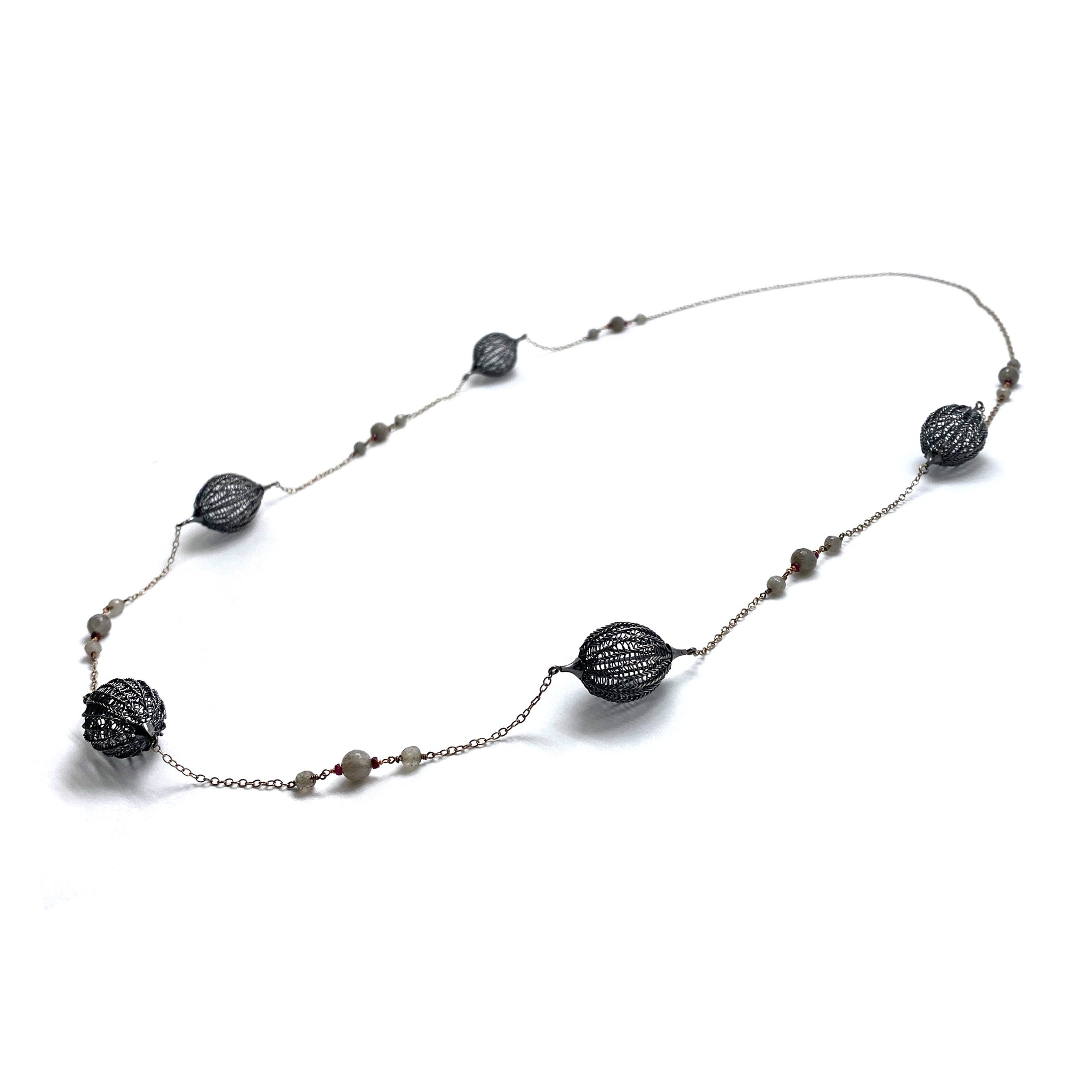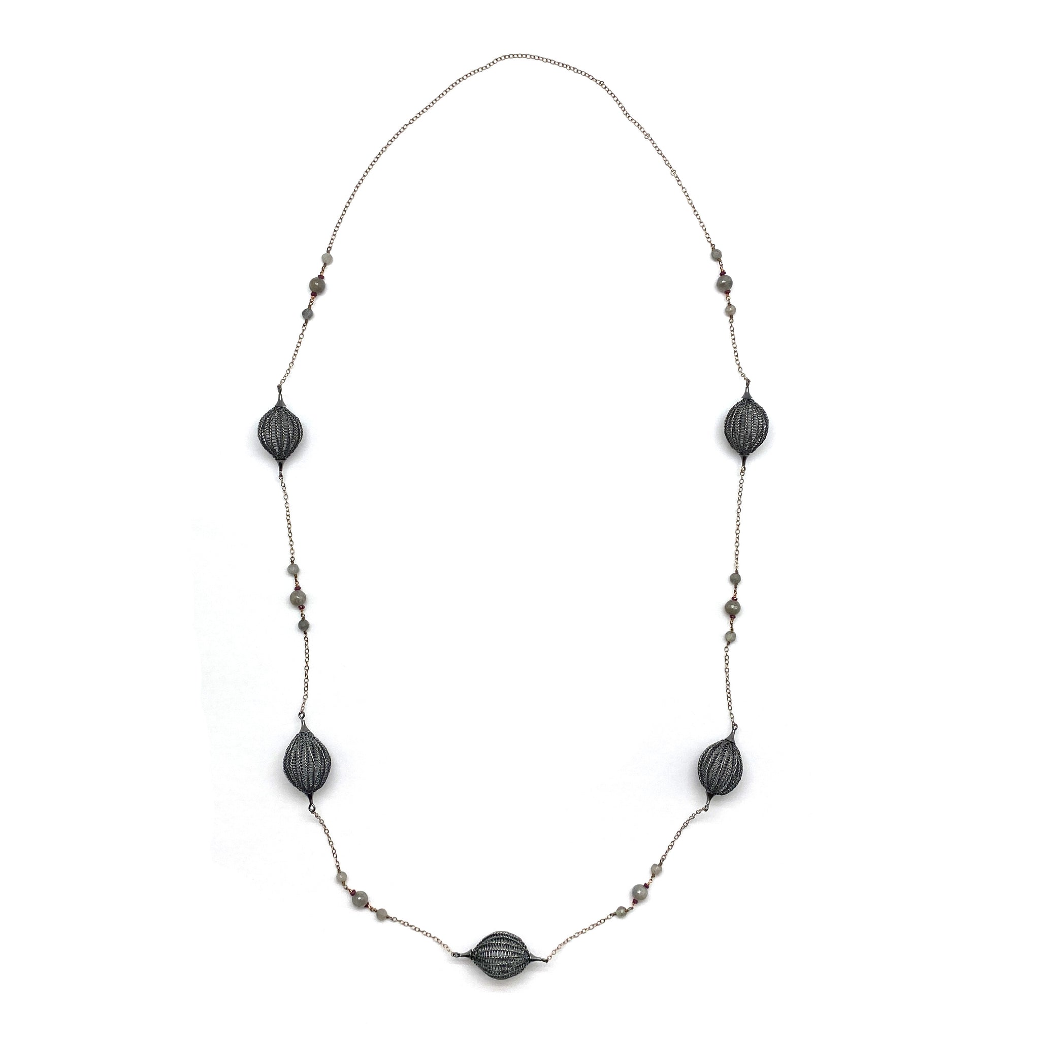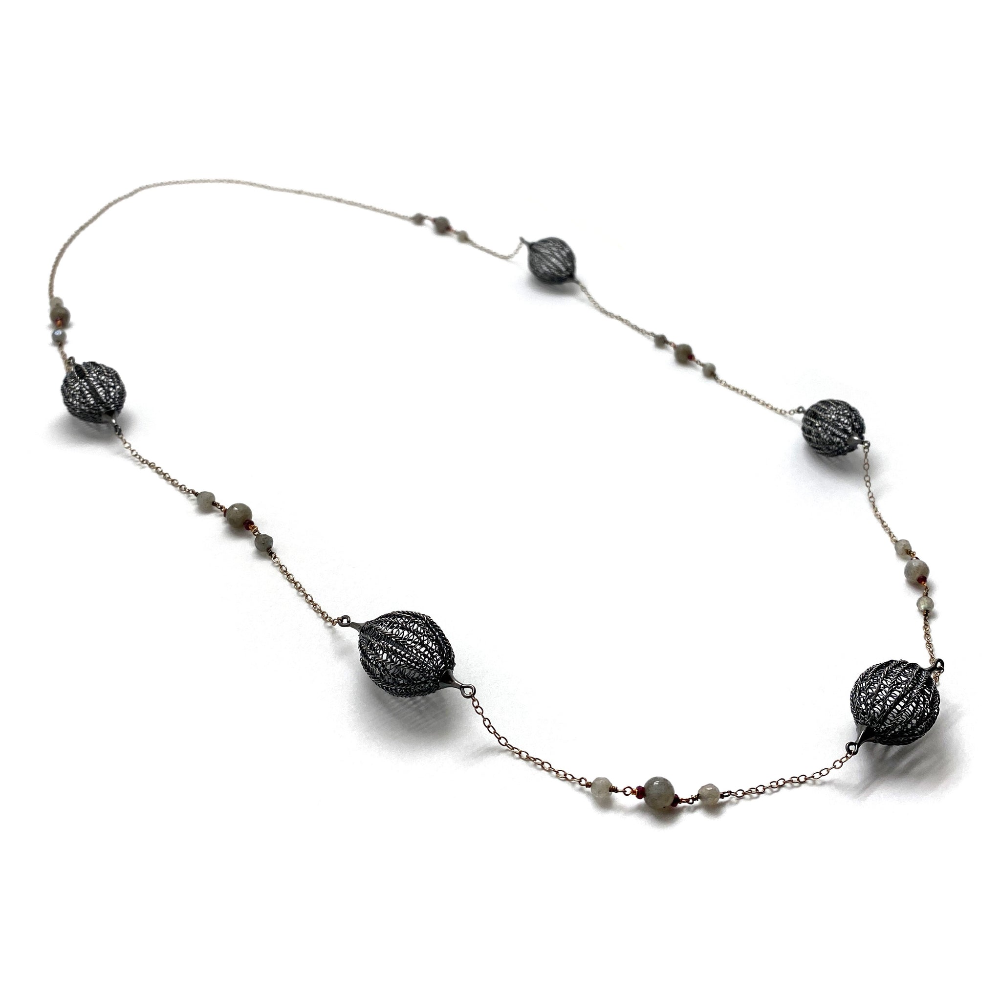 Add a touch of elegance to your every day with this gorgeous necklace from Sowon Joo.  With a mix of oxidized sterling silver crocheted bulbs, garnets and labradorites on a sterling silver chain, this necklace easily slips over the head with no clasp.