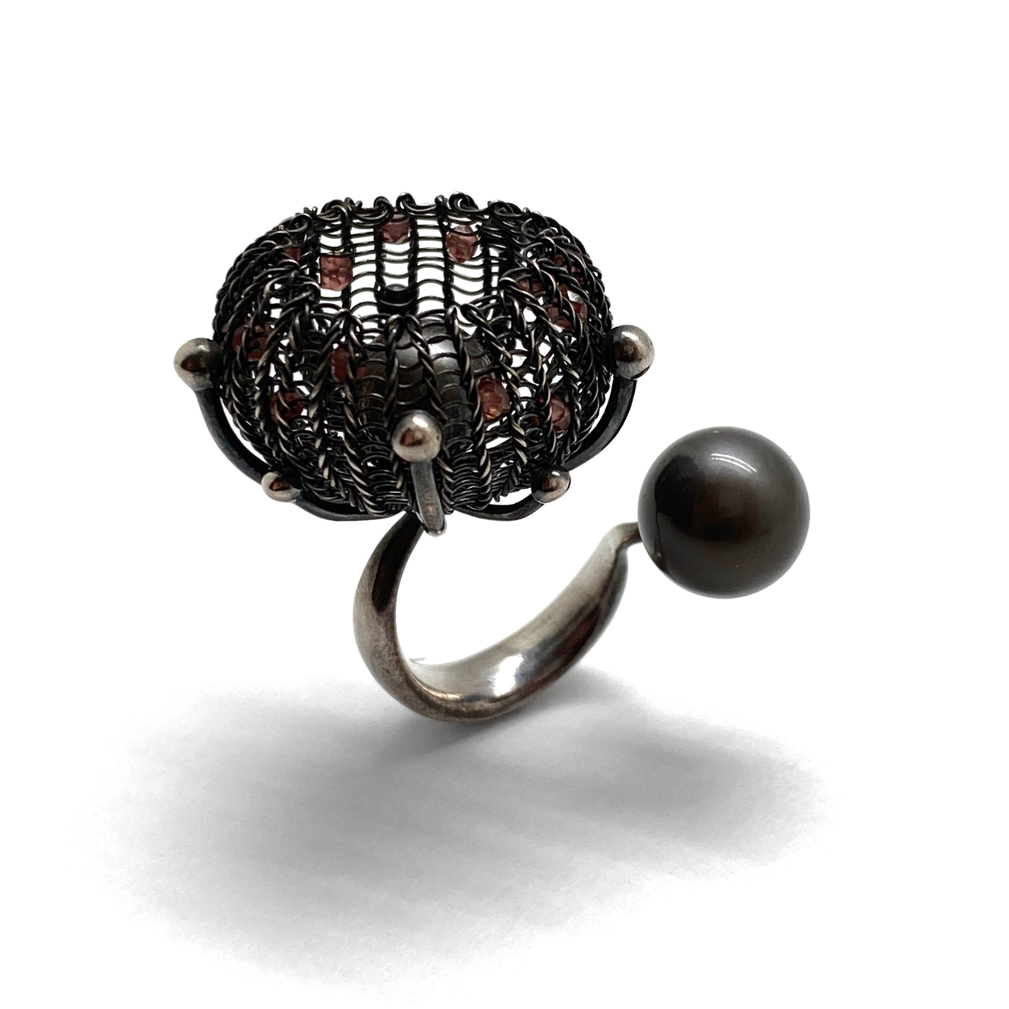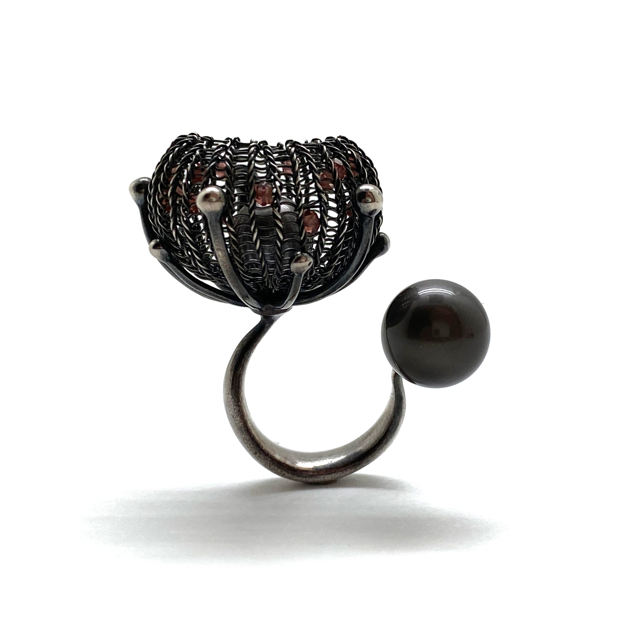 Make a statement with this handmade crotchet ring! This piece is made with an open design and features a black pearl and garnet beads for a subtle sparkle.