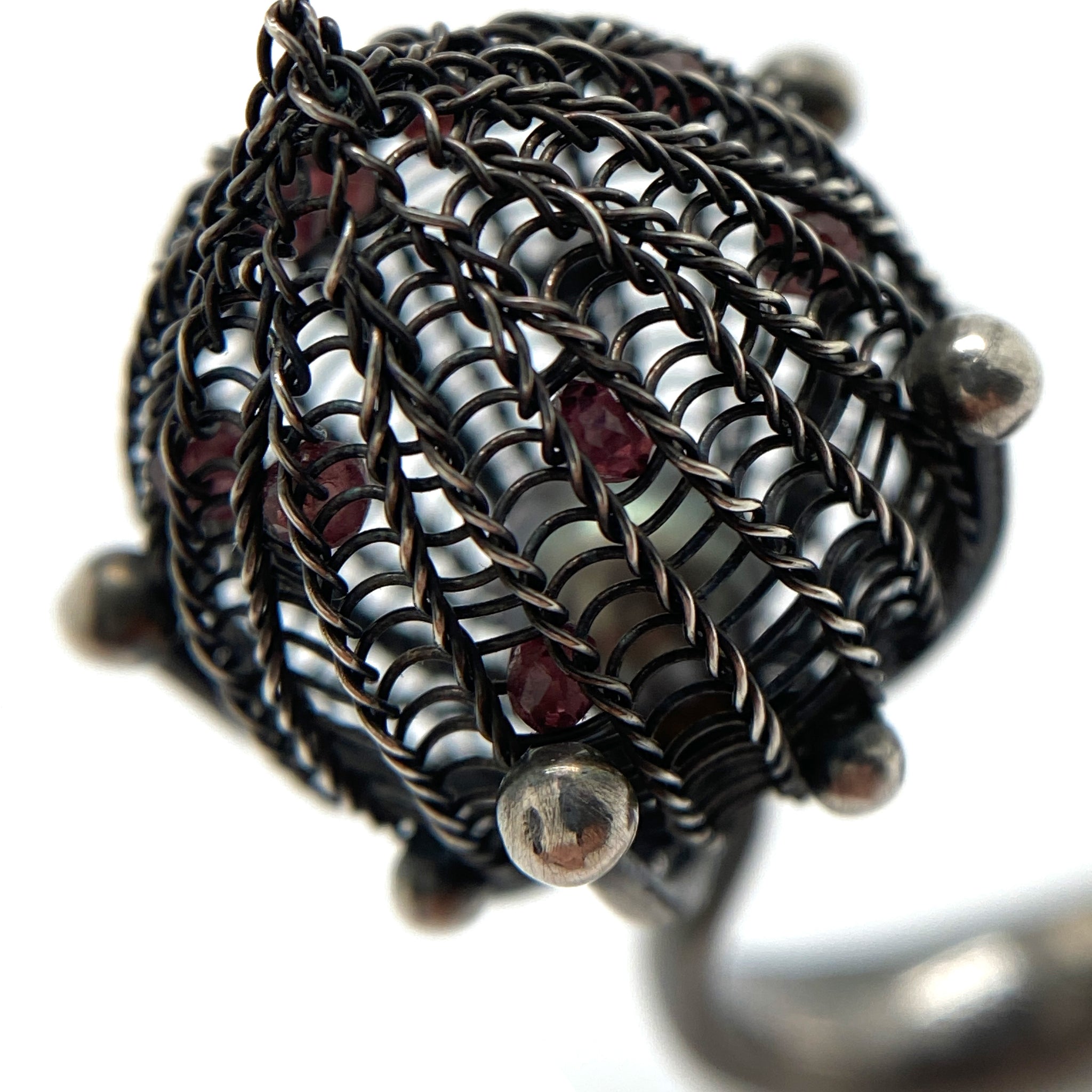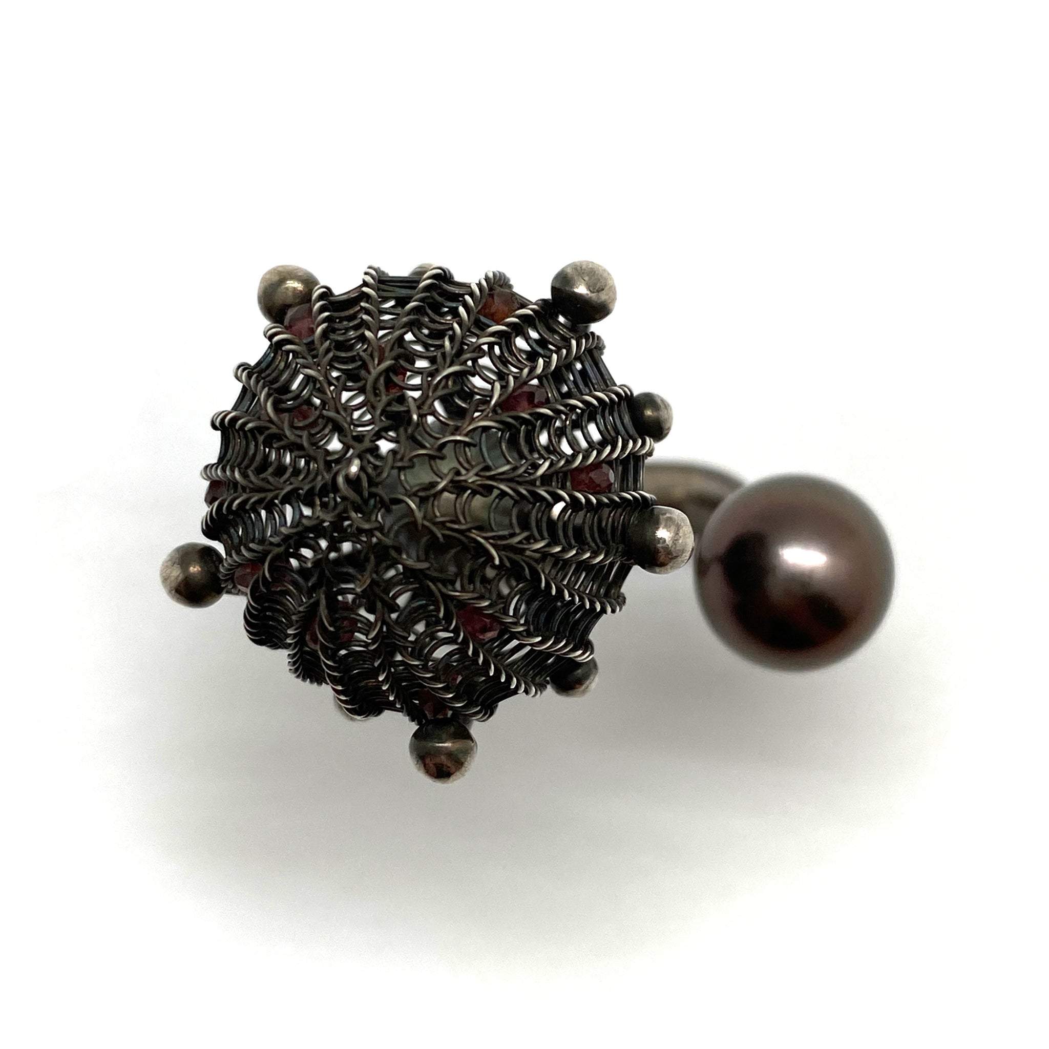 Rock this comfortable statement ring for your next night out. Made with crocheted sterling silver, this piece features a black pearl and garnet beads for a subtle sparkle.