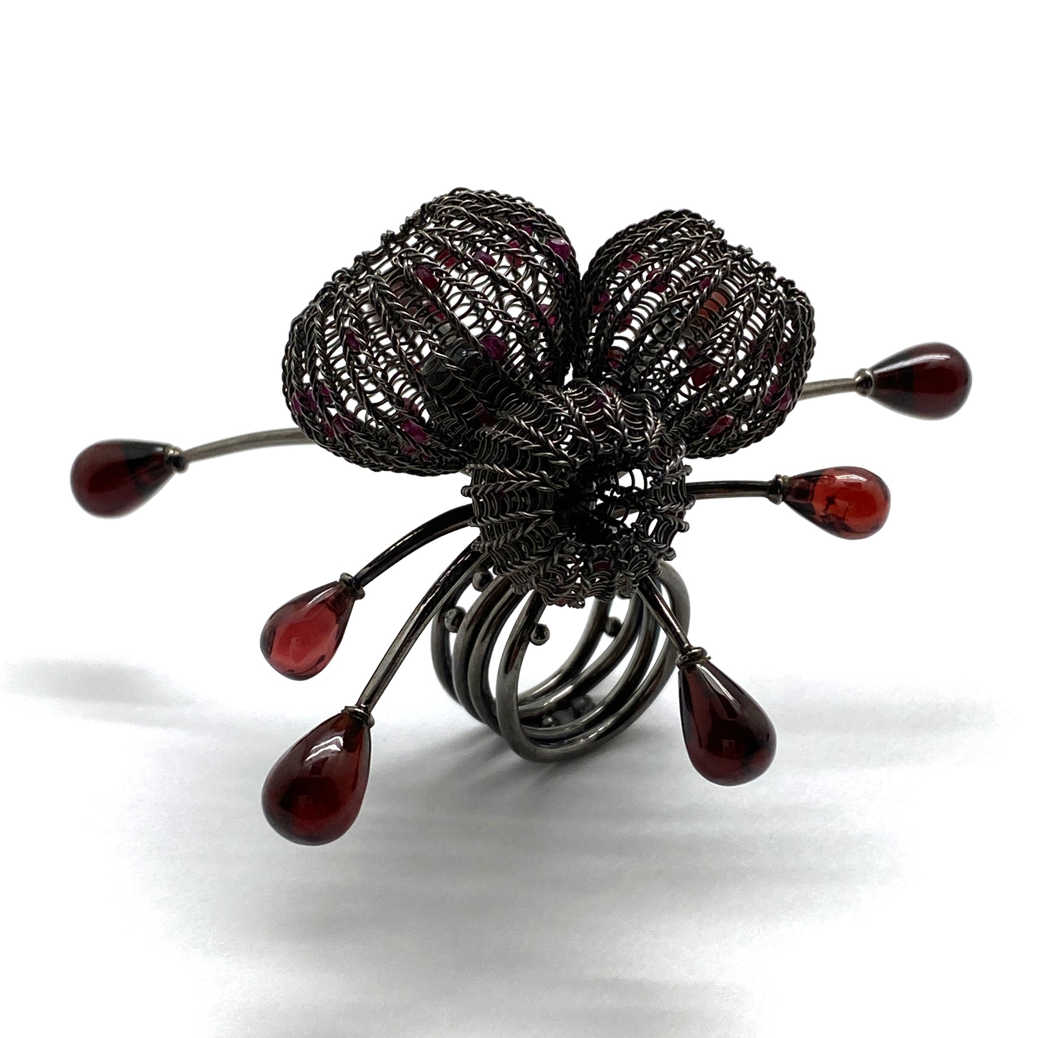 A wearable work of art, this ring is perfect for the bold jewelry lover. Made with crocheted sterling silver bulbs and accented with blooming branches of garnets, this ring will steal the show with each wear.