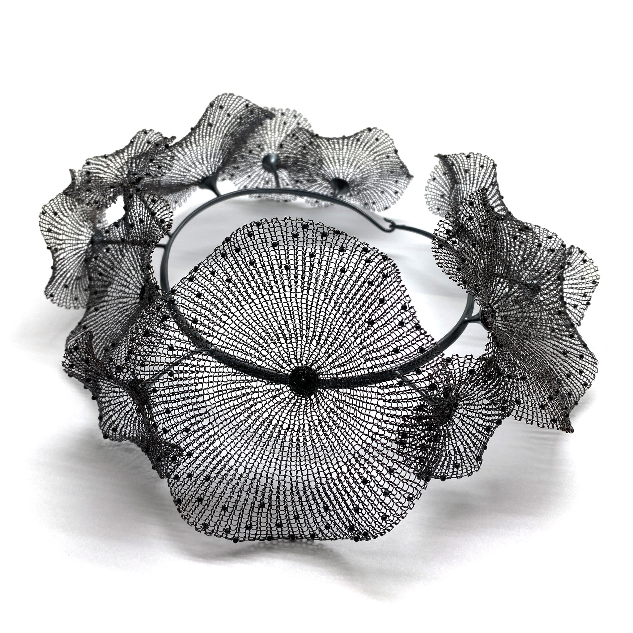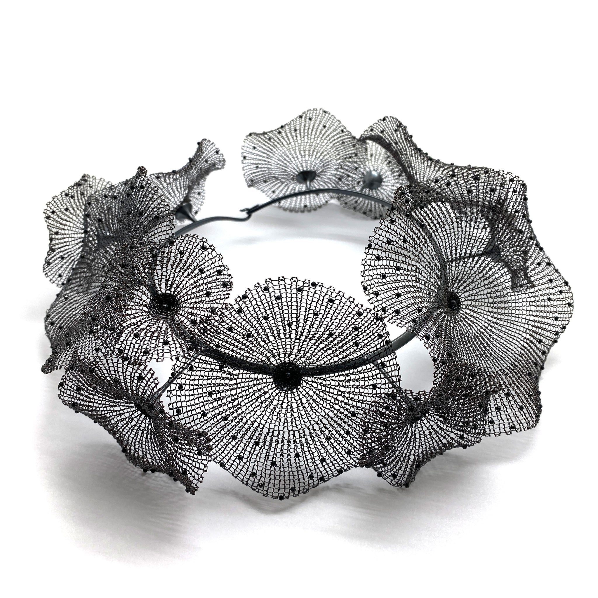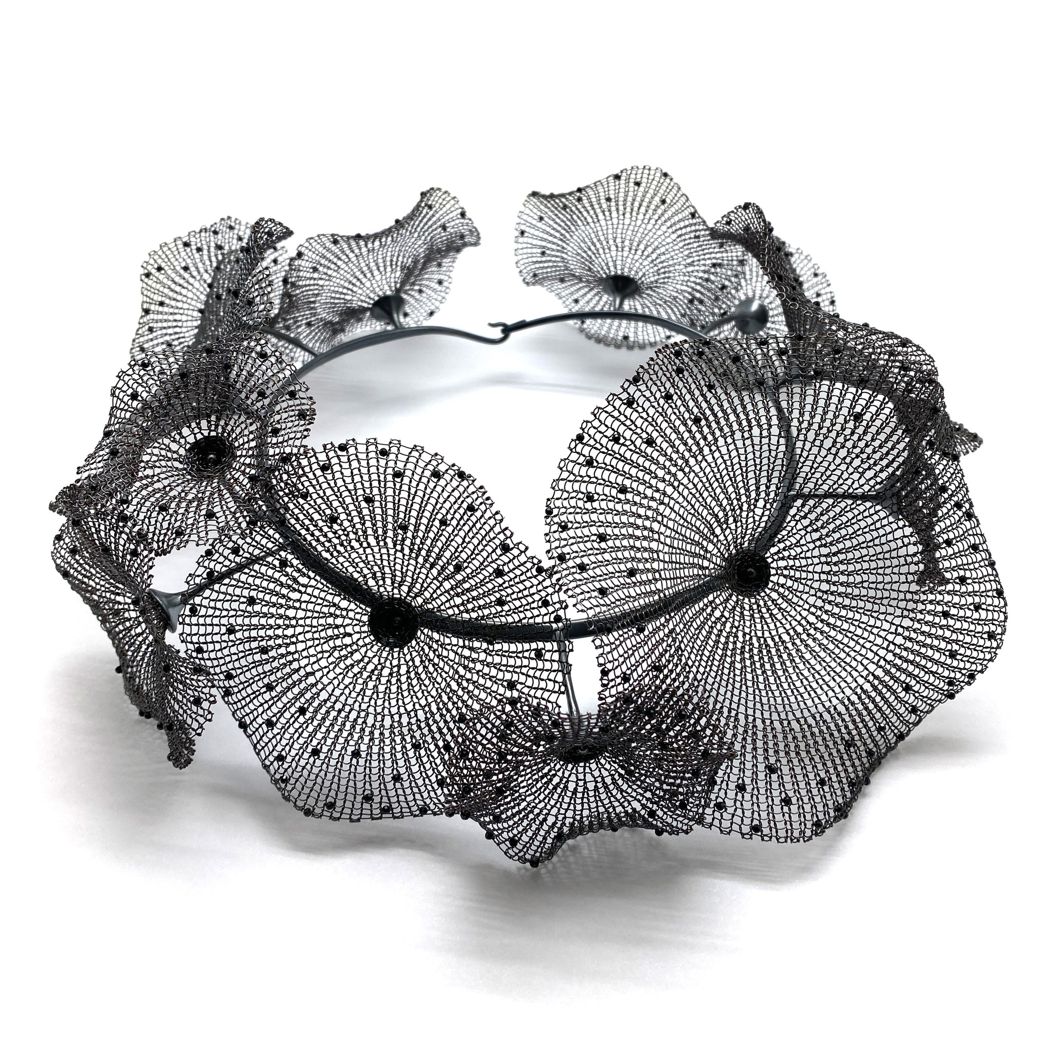 This work of art is sure to turn heads! A truly monumental collar necklace, this piece is made with crocheted oxidized sterling silver with spinel bead accents for added sparkle.