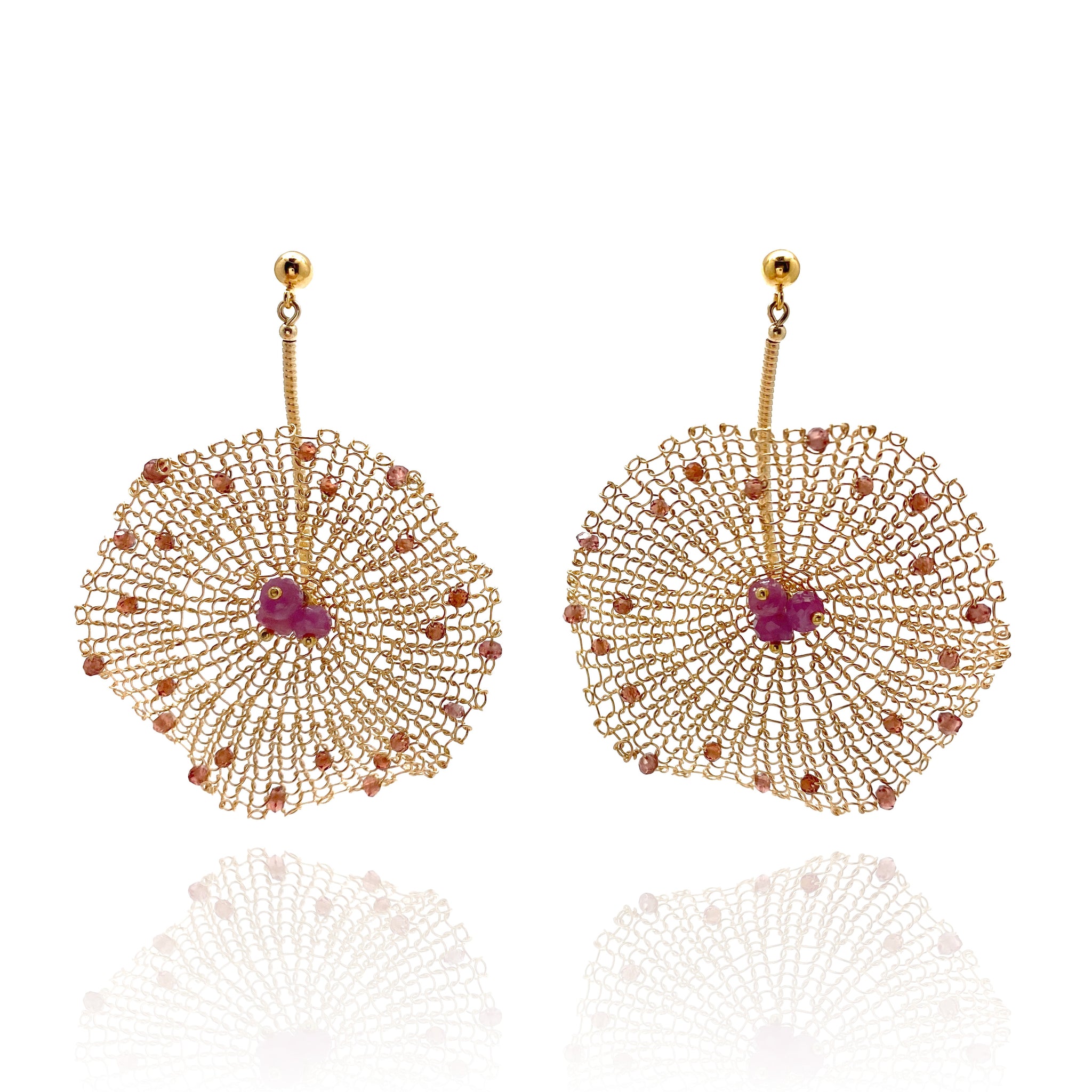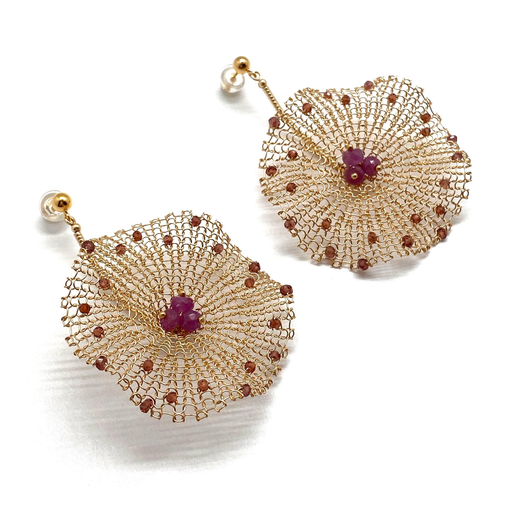 These lightweight earrings exude elegance. Acclaimed artist Sowon Joo has crocheted gold fill by hand, creating a one-of-a-kind pair that is adorned with rubies.