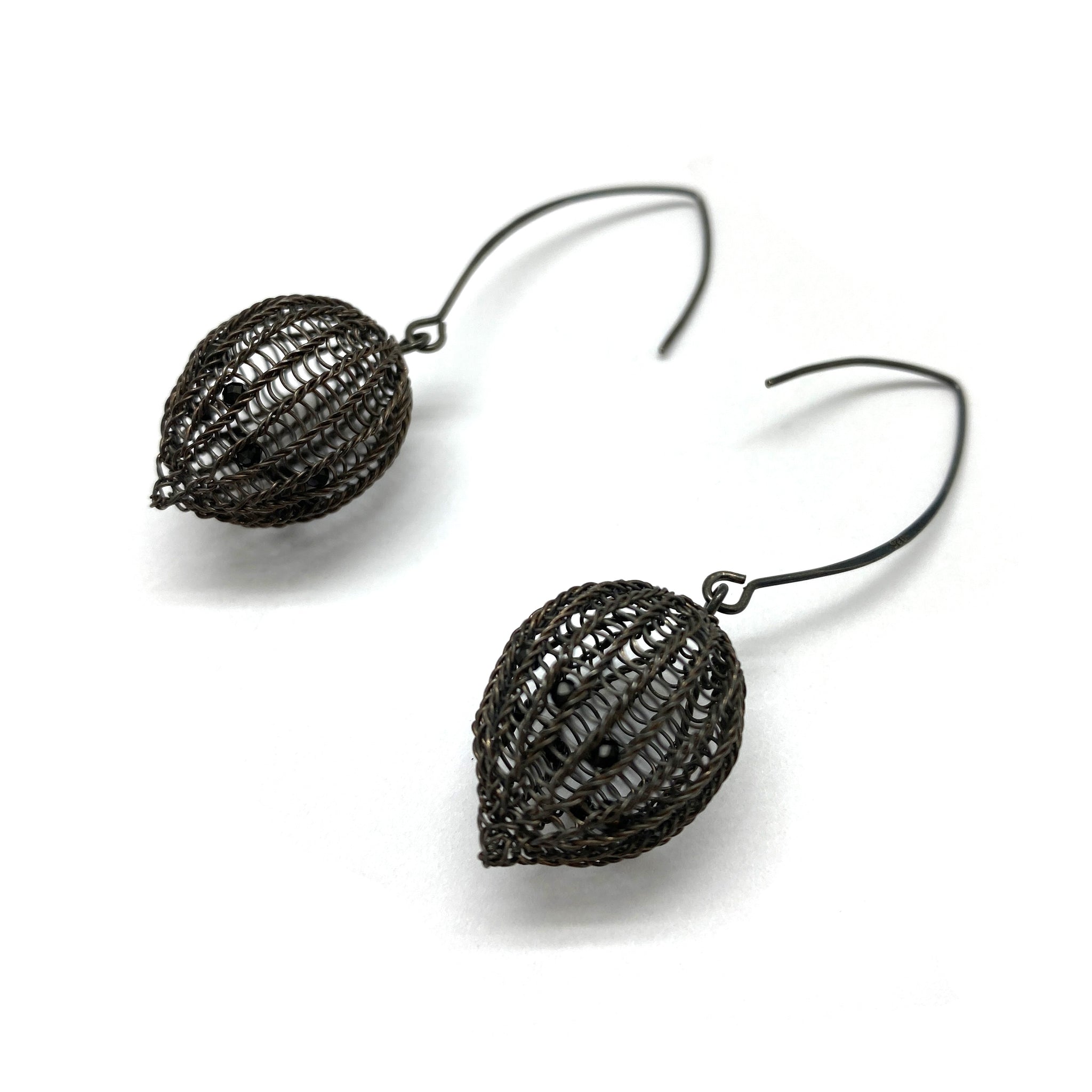 Made by Korean artist Sowon Joo, these crocheted oxidized silver dew earrings are accented with spinels. Finished with hook back ear wires, this pair are easy to wear.