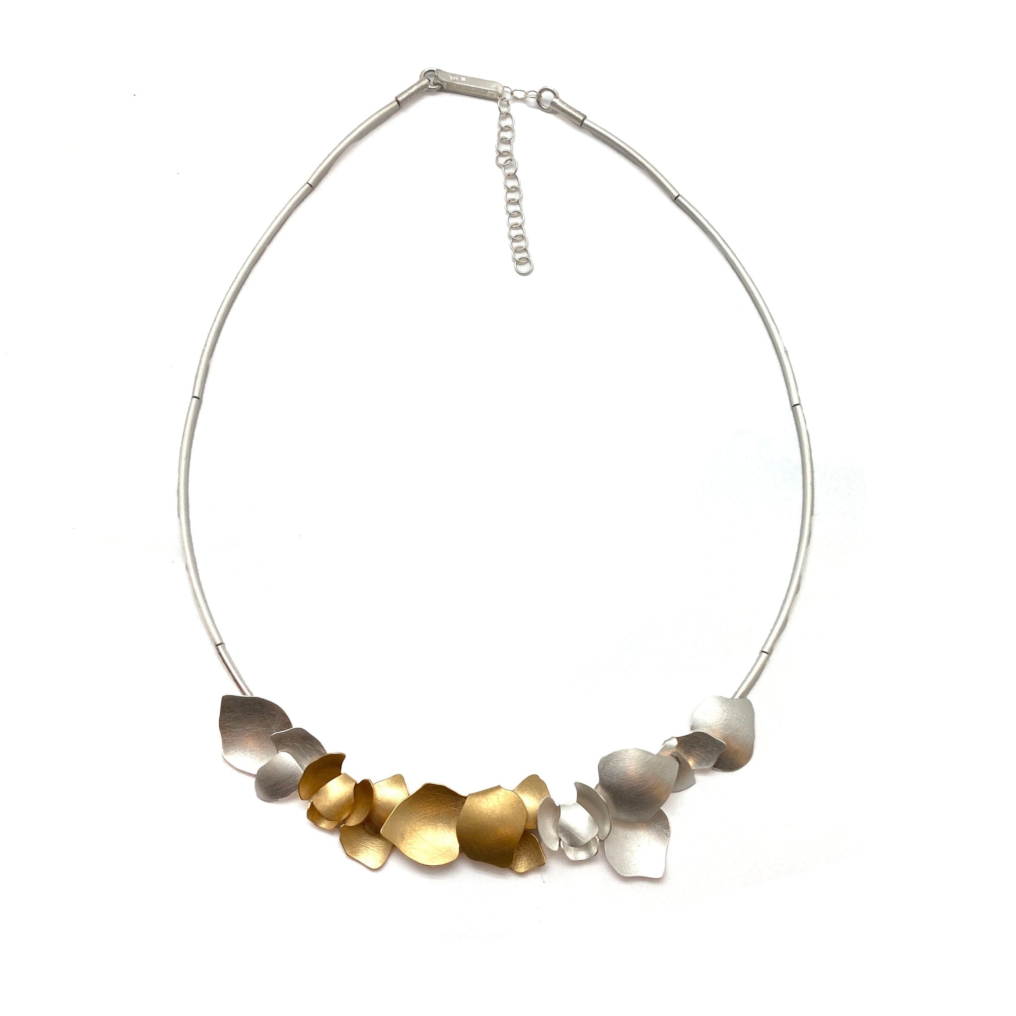 Anna Krol masterfully transforms sterling silver and gold vermeil into this abstract floral petals for this statement necklace. With a 2" chain extender, this necklace can easily adjust to flatter any neckline in your wardrobe.