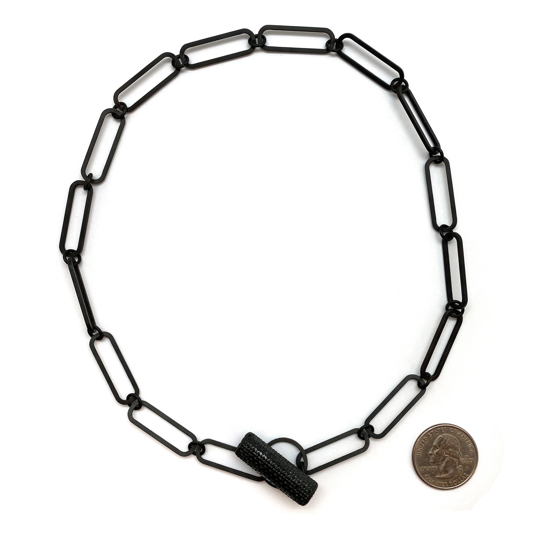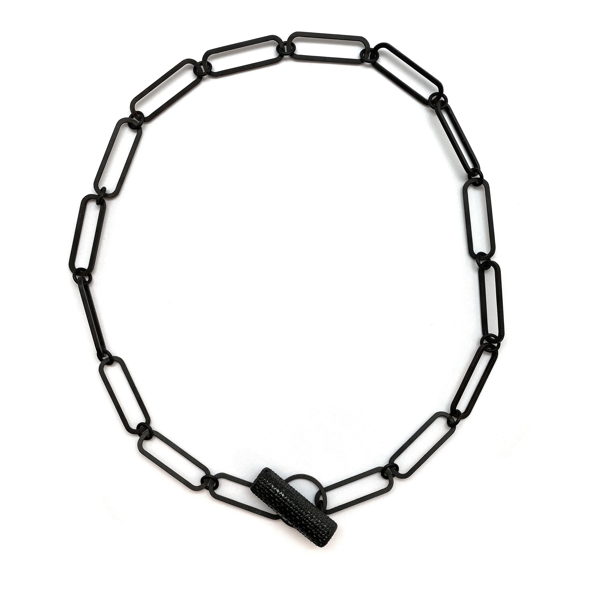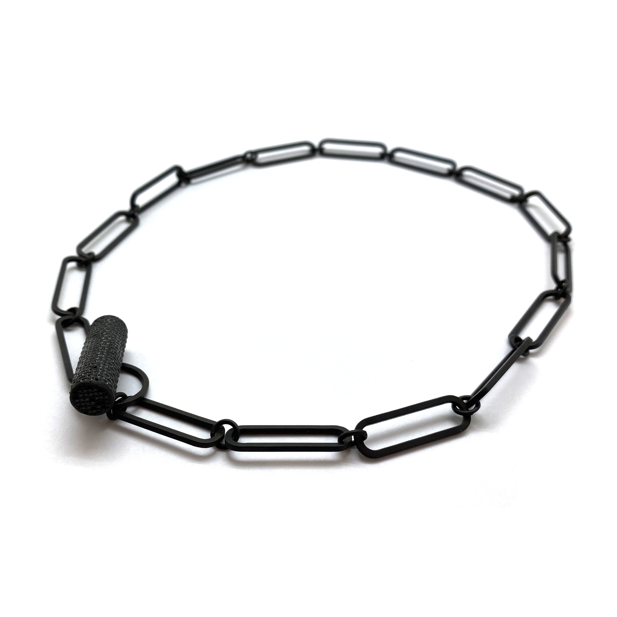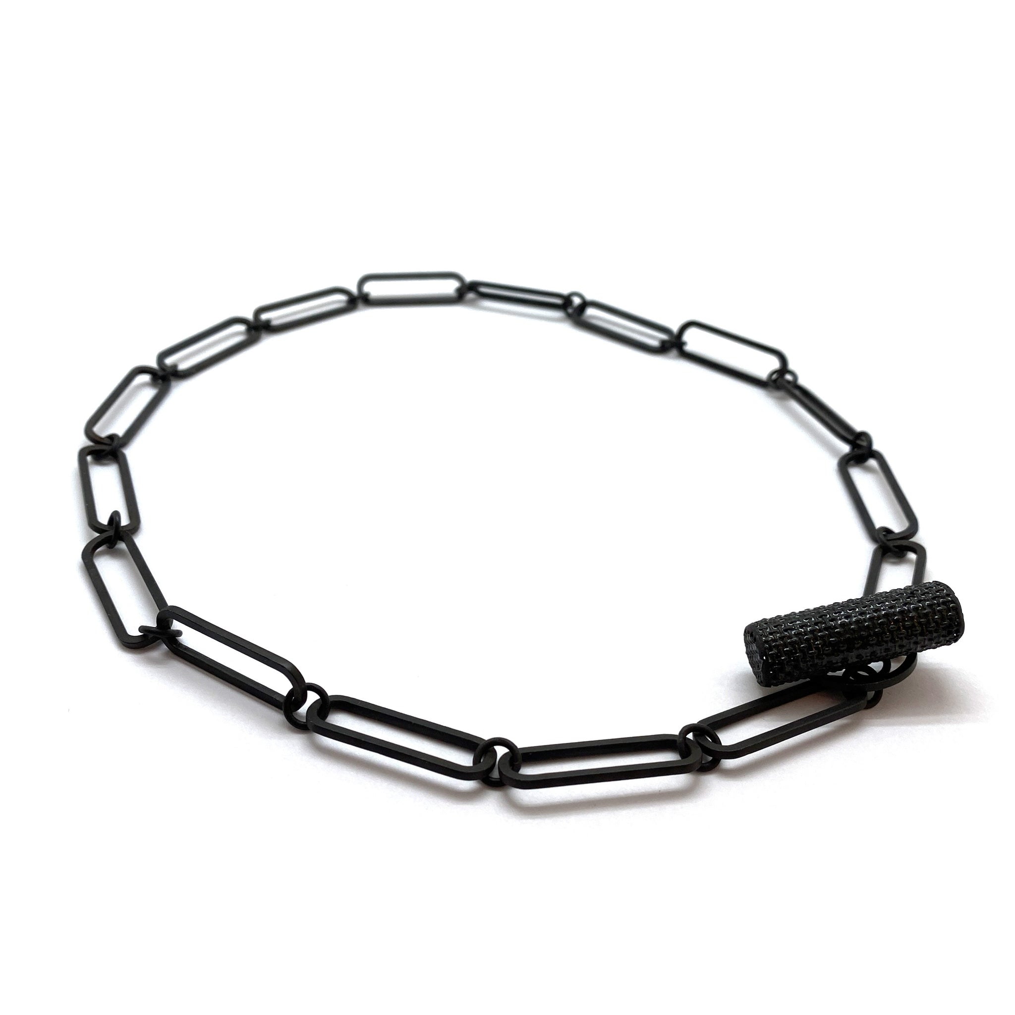 Made by Sandra Salacies, this contemporary take on the paperclip necklace is made with black steel and accented with a hollow-form mesh cylinder that serves as the clasp. The dark and daring necklace will stand out whether you pair it with a casual tee shirt or an elegant dress.