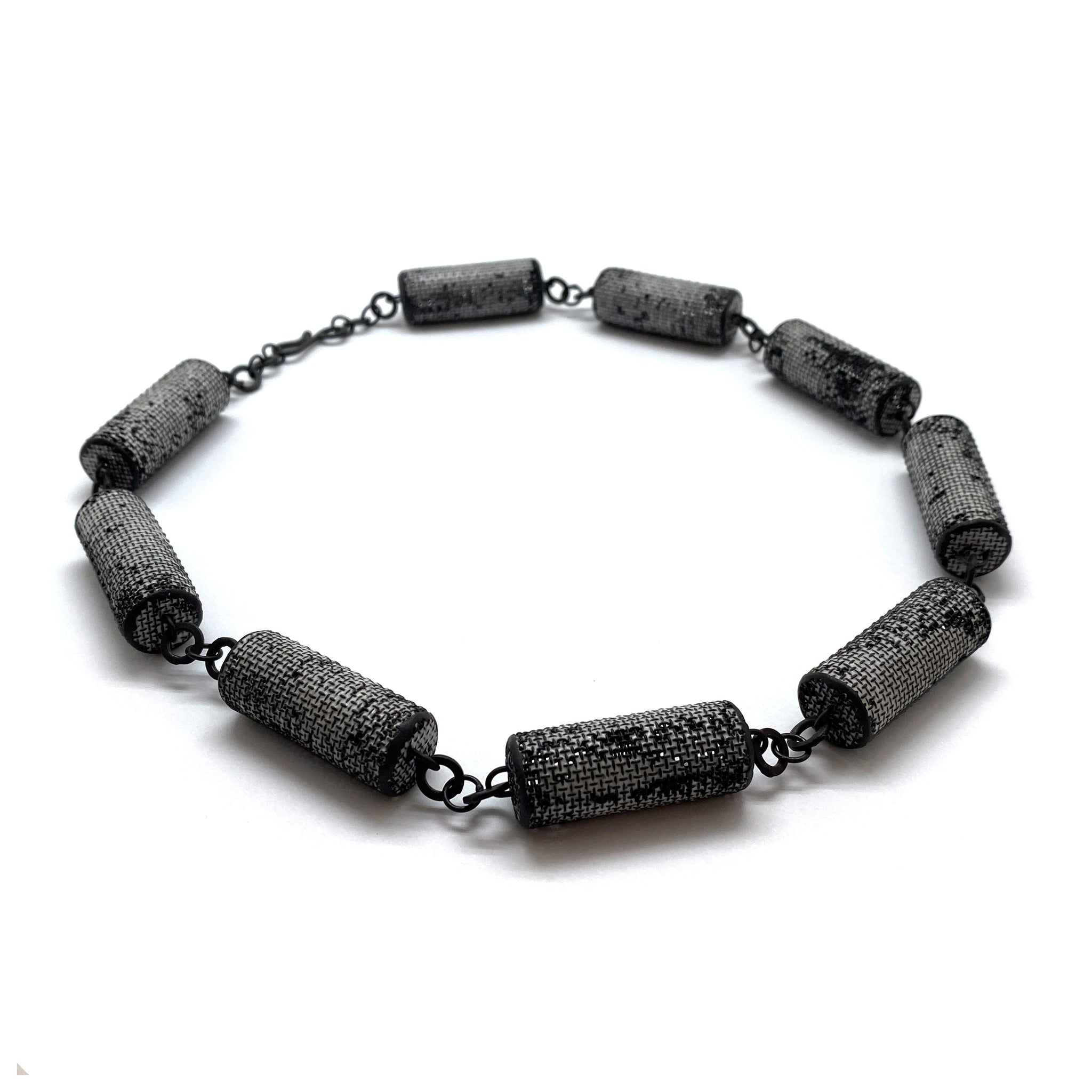 This cylindrical statement necklace from Sandra Salaices is a gallery favorite. One of a kind, this black and white piece can dress up even a simple tee shirt.