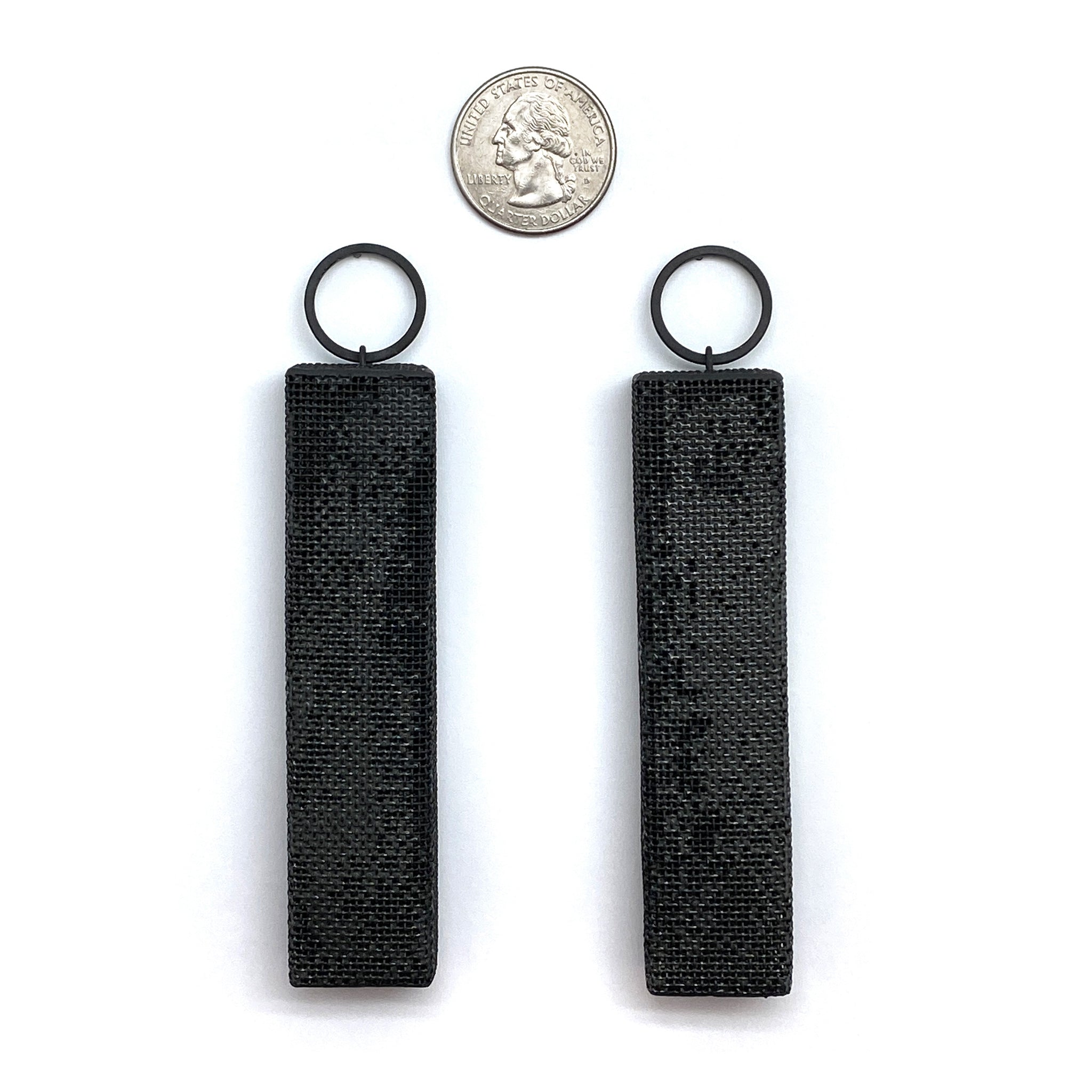 This pair from Sandra Salacies are the ultimate statement. Dramatically long, hollow-form rectangles sway from circle steel posts.