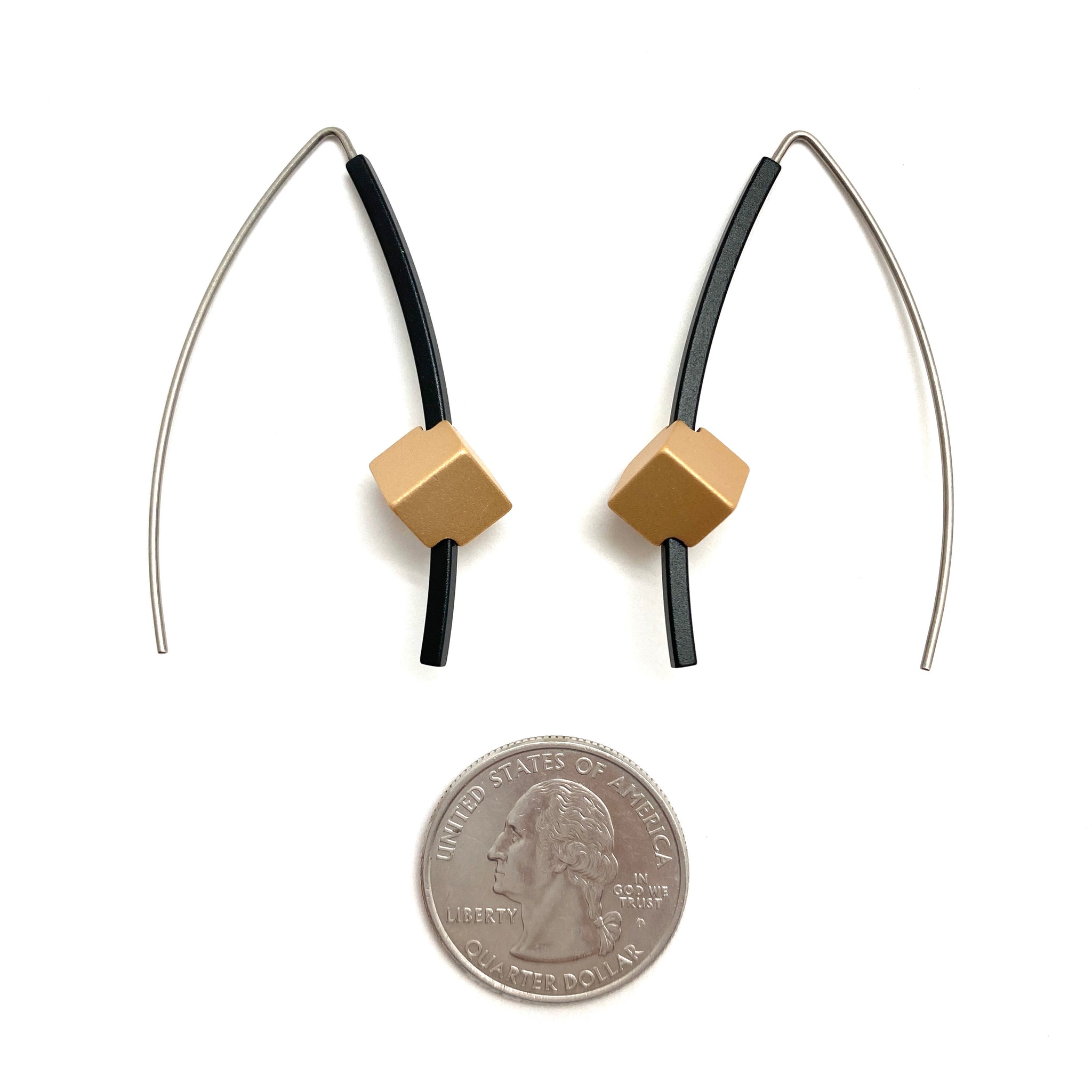 This pair are sleek and sculptural all at once. The gold anodized aluminum cube is an eyecatching addition on the dark square tube. Anodized aluminum pieces will not scratch, tarnish or fade which means these are a timeless pair of earrings!
