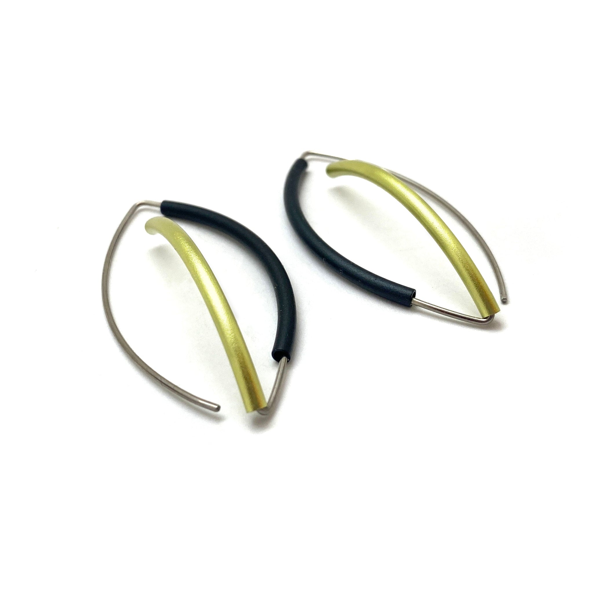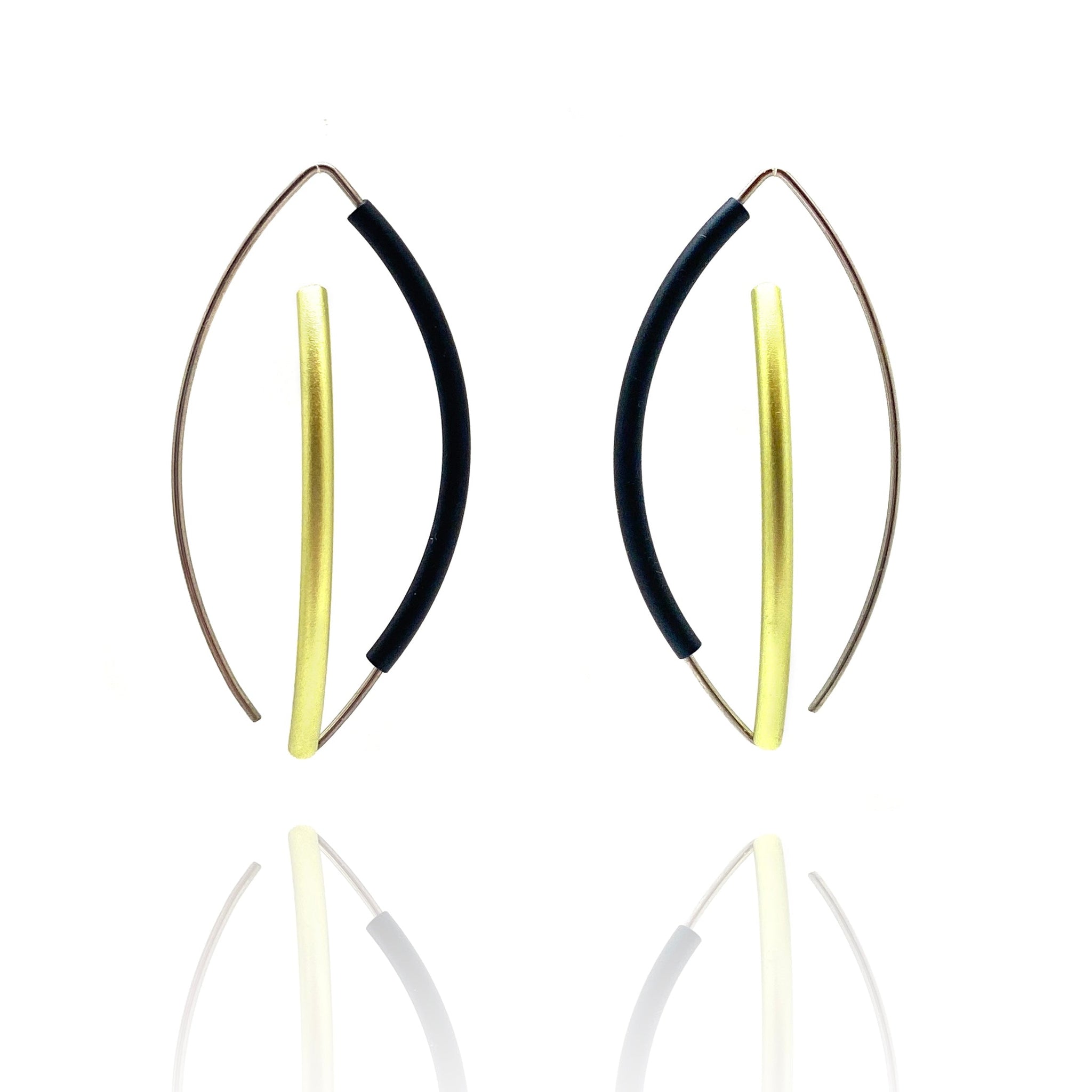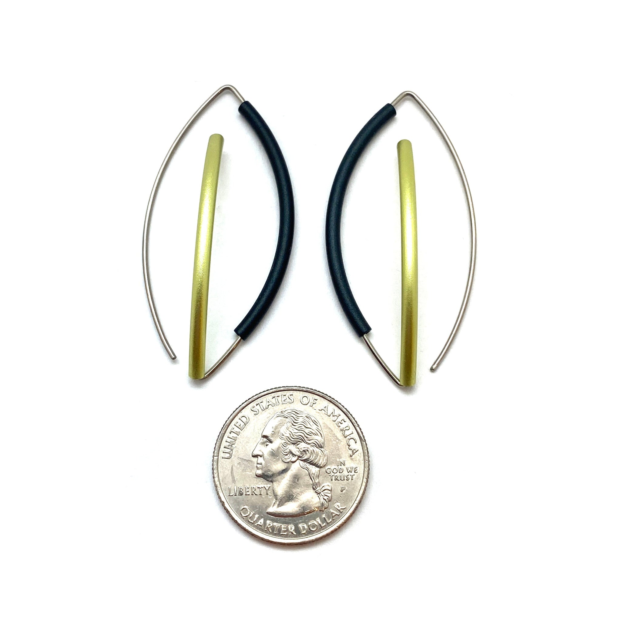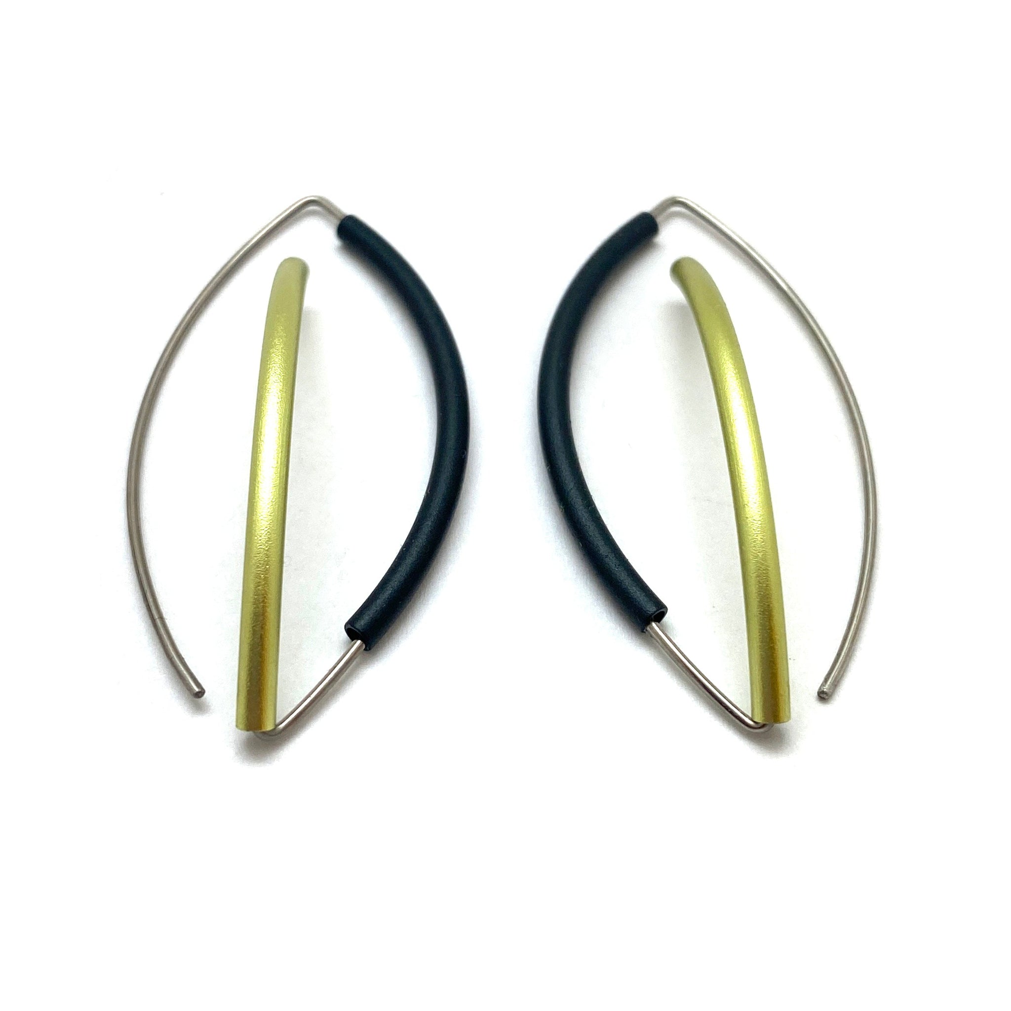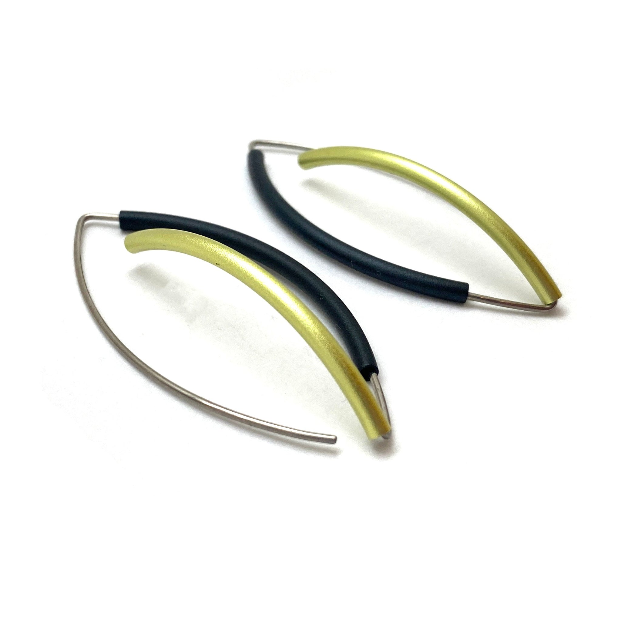 Architectural anodized aluminum stainless steel hook earrings in black and lime green colorway. Anodized aluminum pieces will not scratch, tarnish or fade which means these are a timeless pair of earrings!
