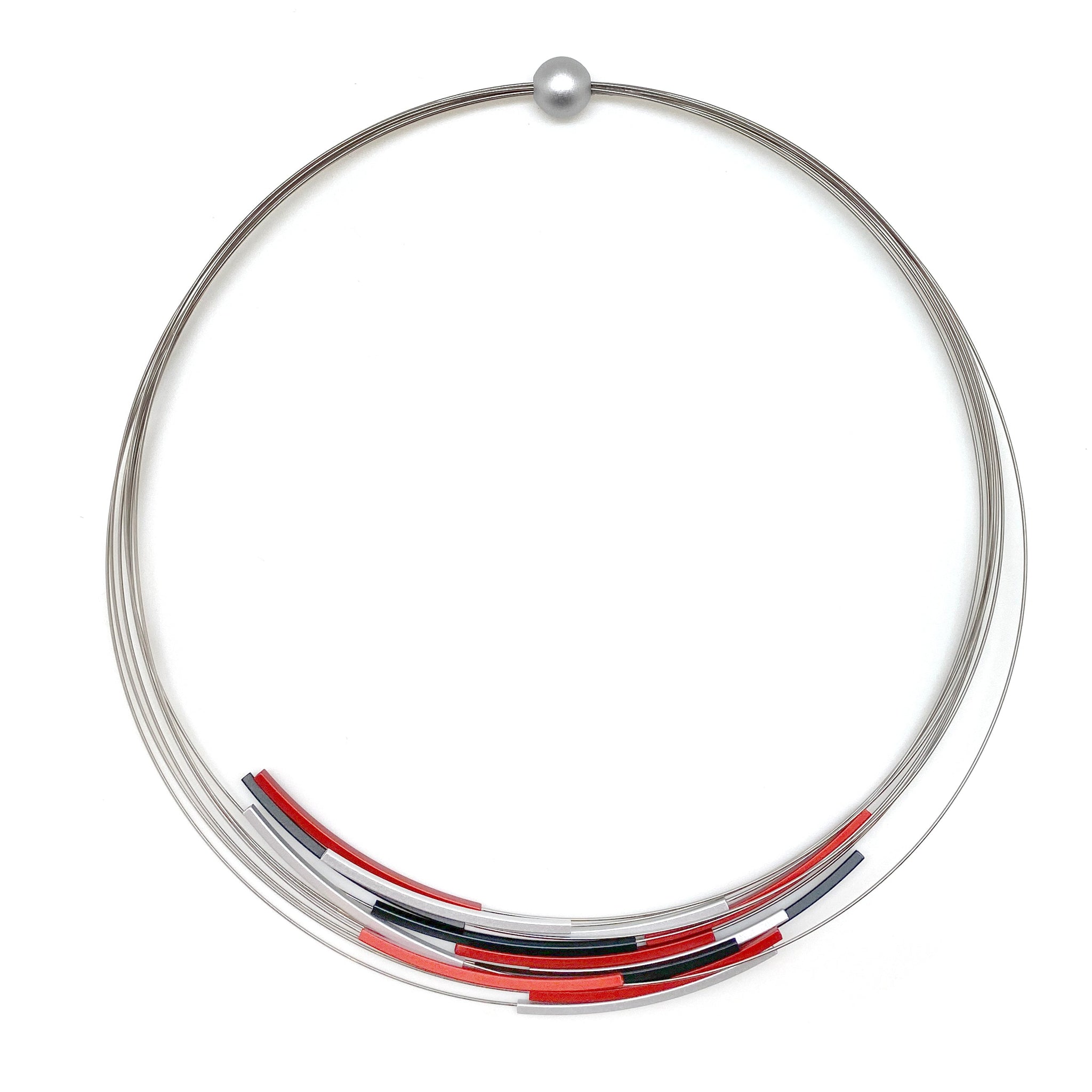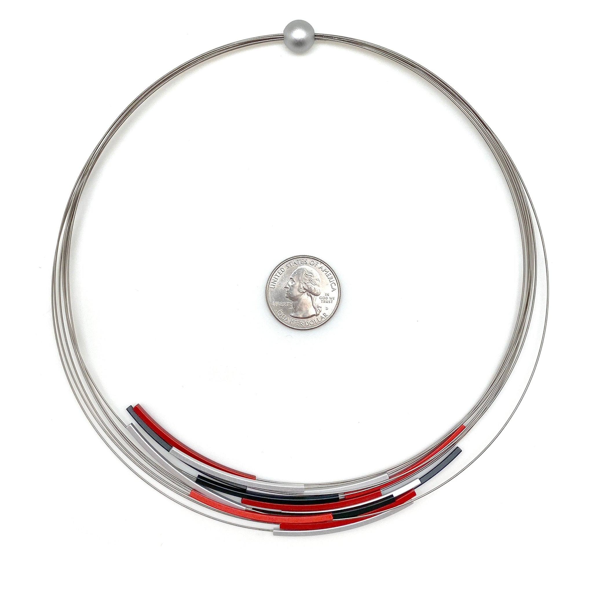 This lightweight seven-strand necklace features black, red and silver anodized aluminum bars on sterling silver, with a silver tone anodized aluminum orb that brings it all together. Circumference measures approx. 17".