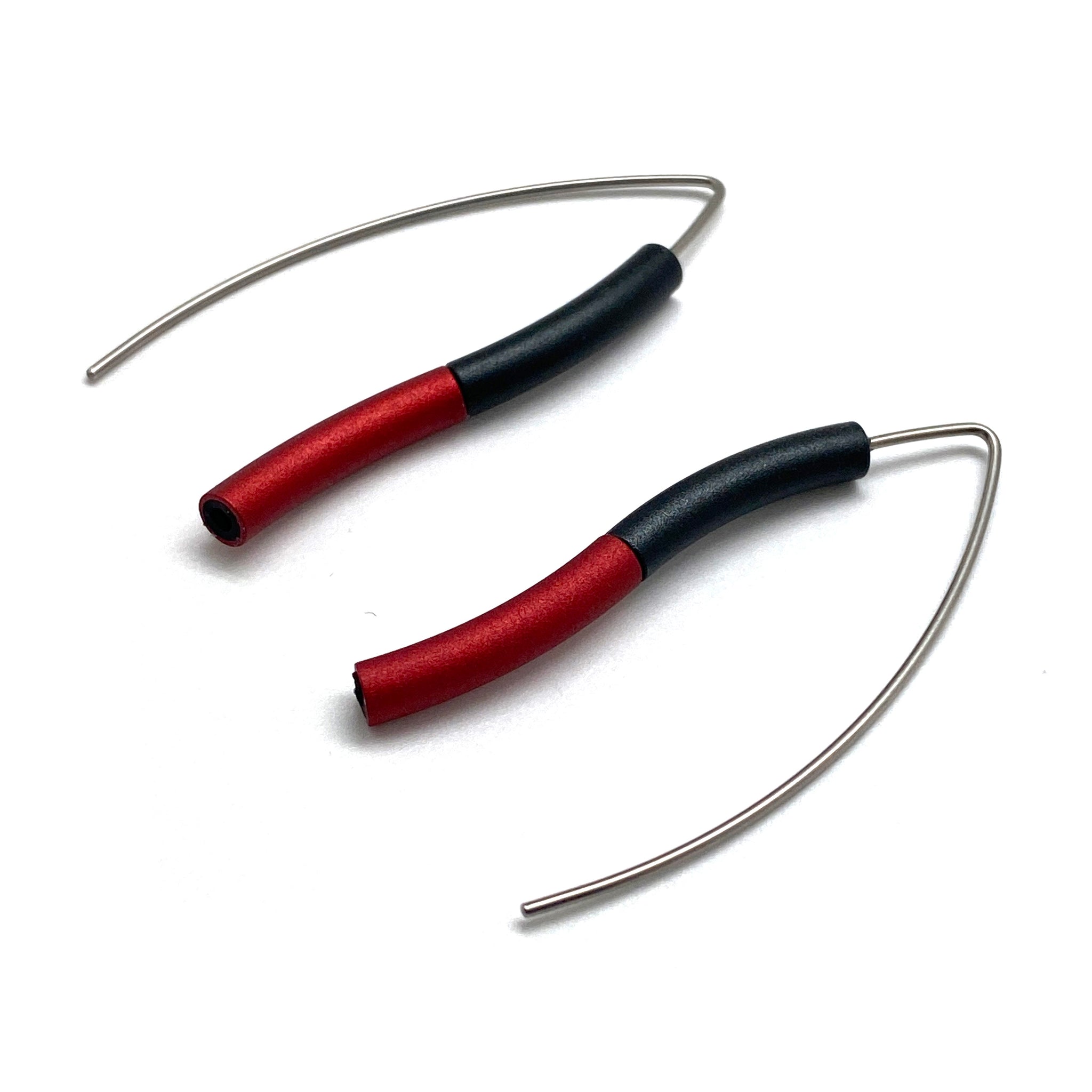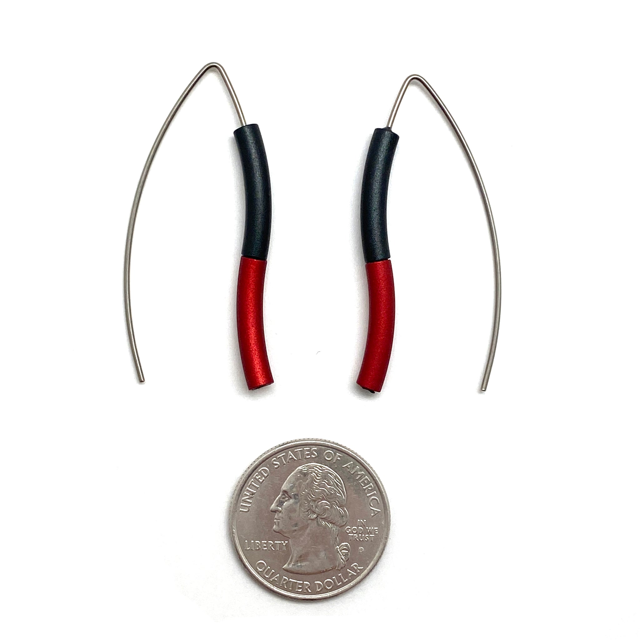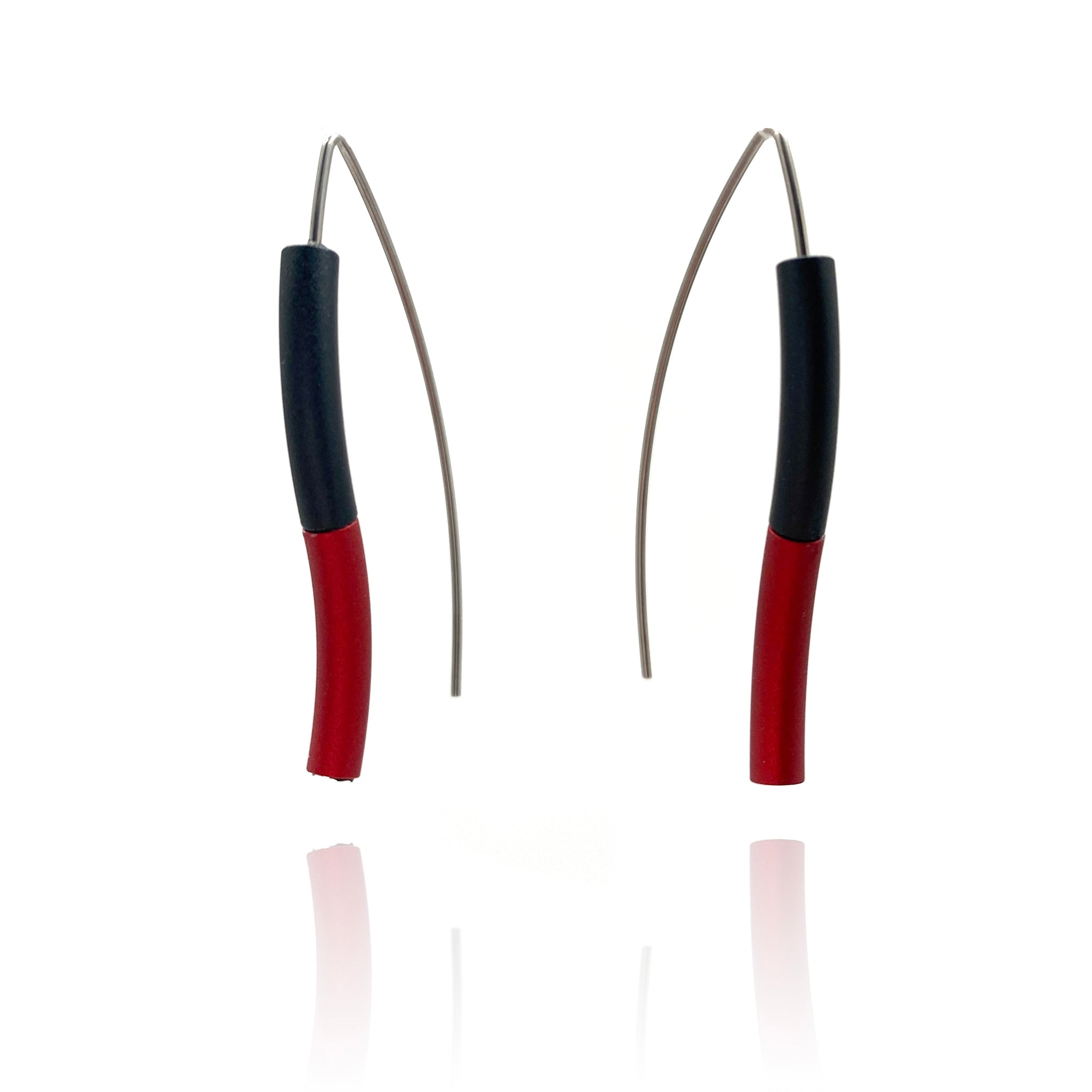 These easy to wear earrings combine black and red anodized aluminum. Anodized aluminum pieces will not scratch, tarnish or fade which means these are a timeless pair of earrings!