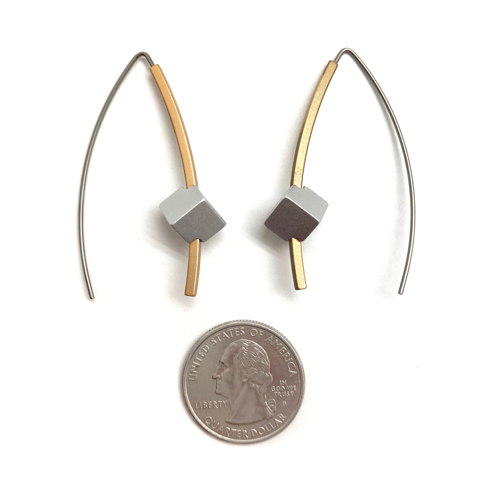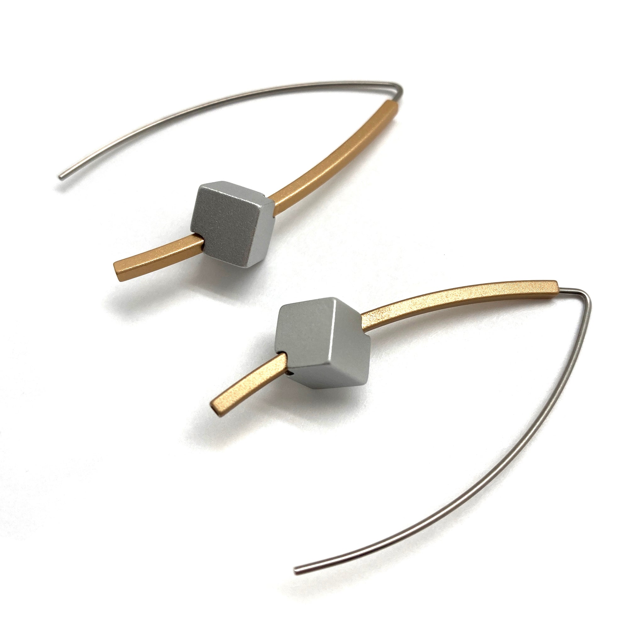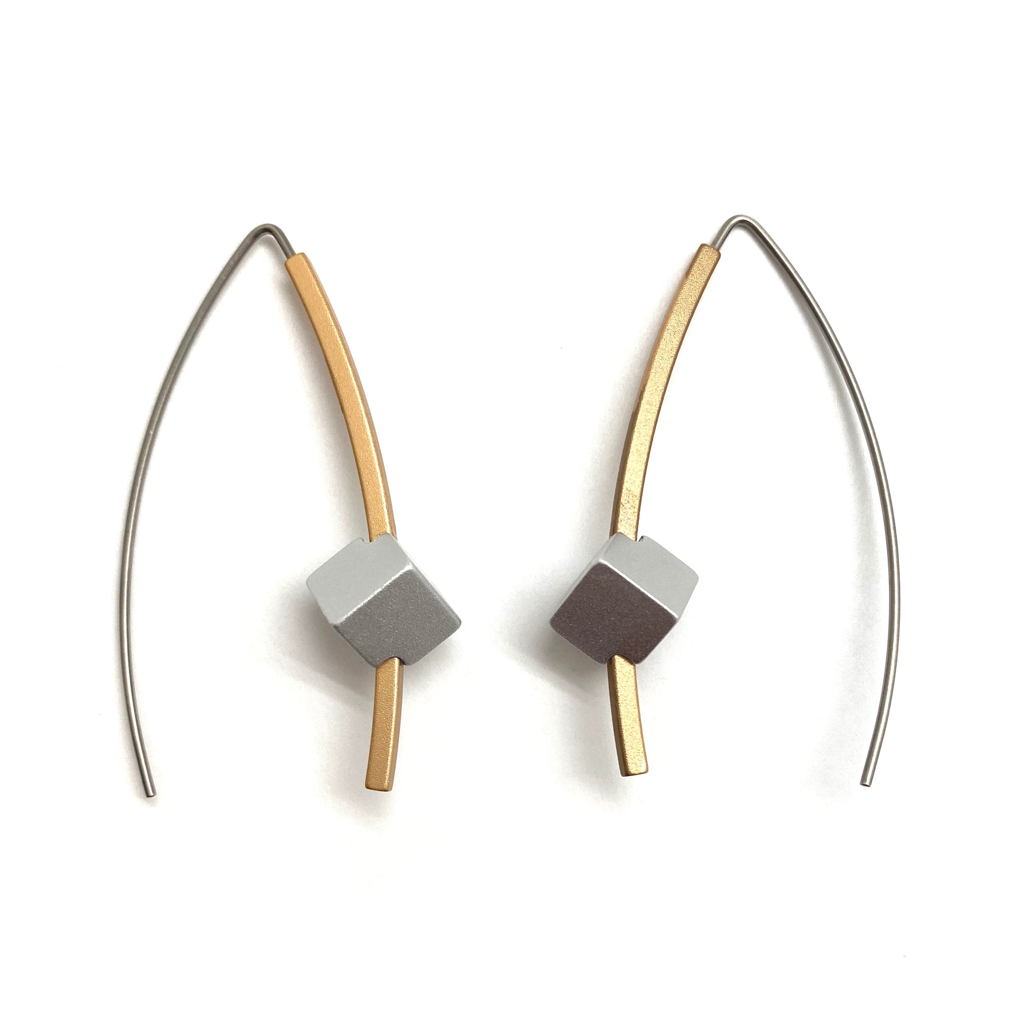 This pair are sleek and sculptural all at once. The silver anodized aluminum cube is an eyecatching addition on the gold square tube. Anodized aluminum pieces will not scratch, tarnish or fade which means these are a timeless pair of earrings!