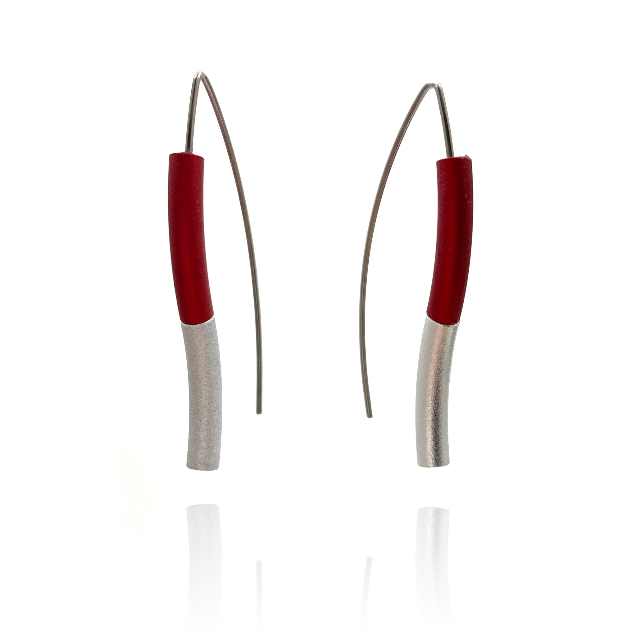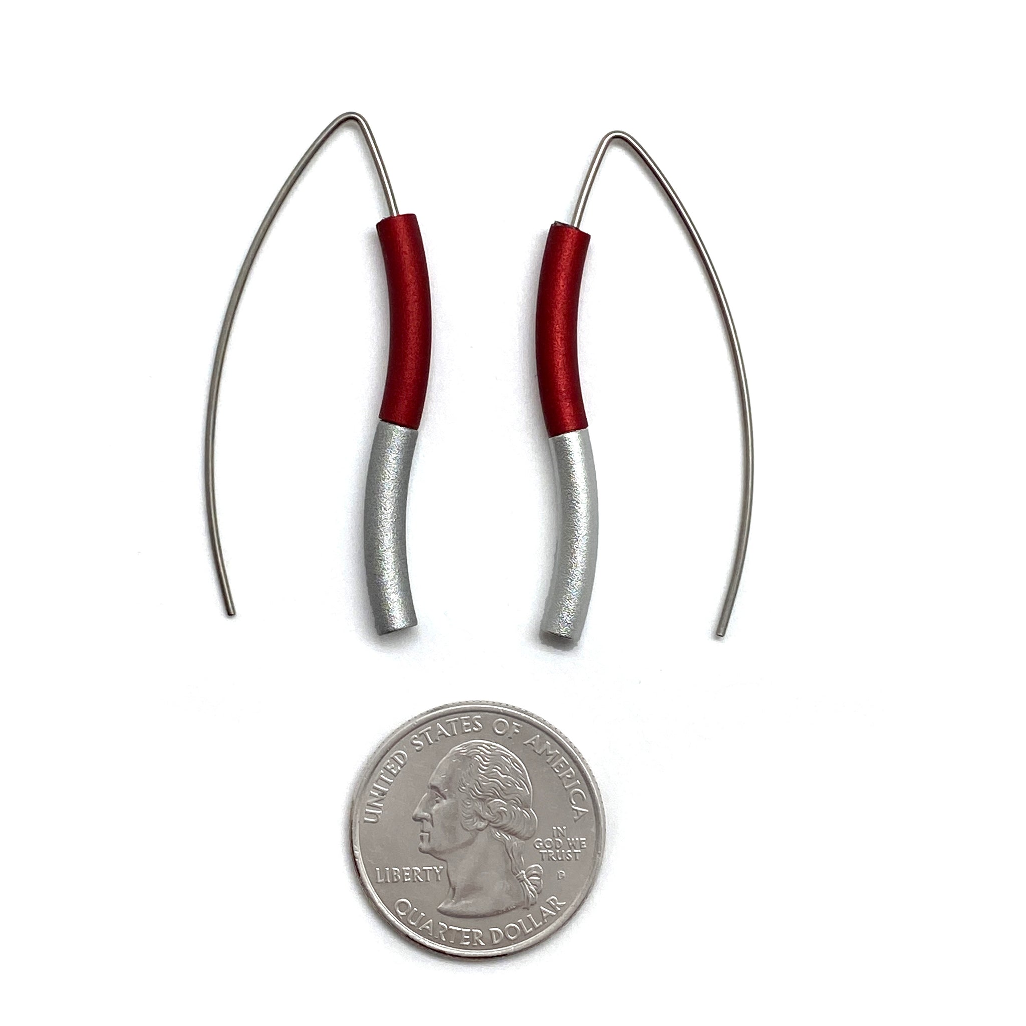 These easy to wear earrings combine red and silver anodized aluminum. Anodized aluminum pieces will not scratch, tarnish or fade which means these are a timeless pair of earrings!