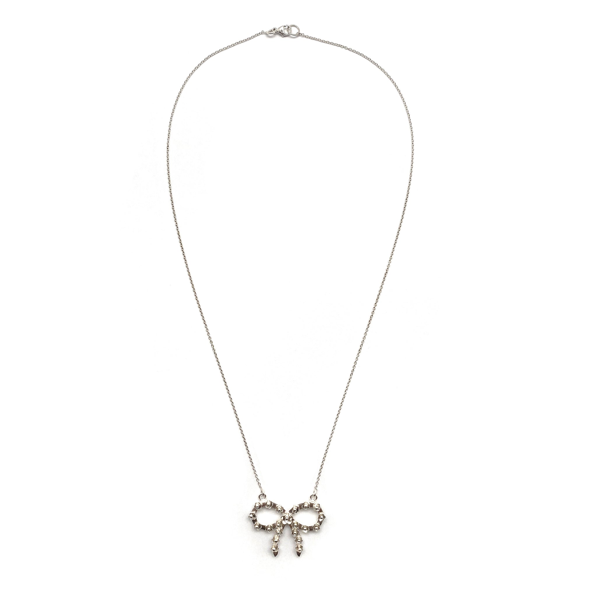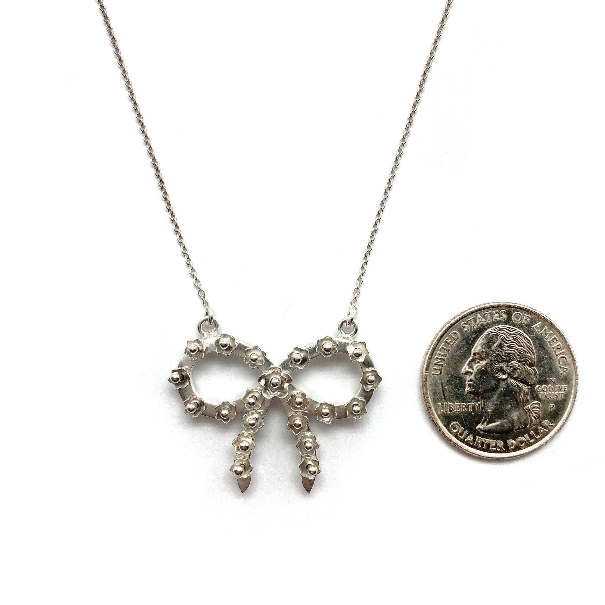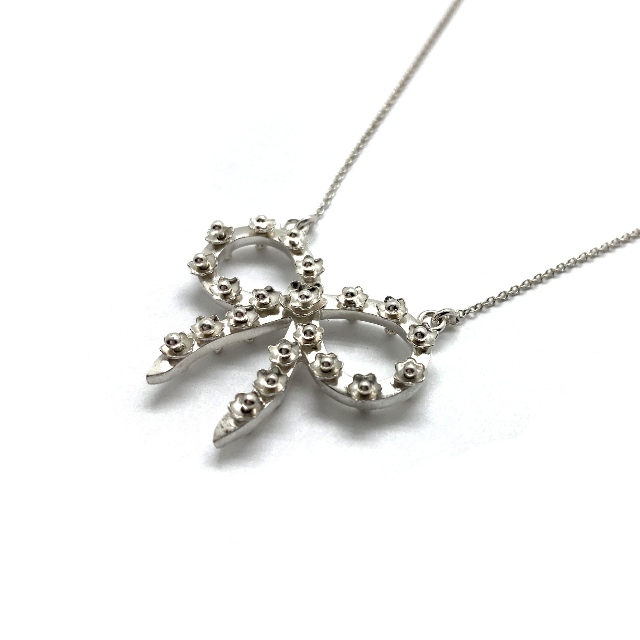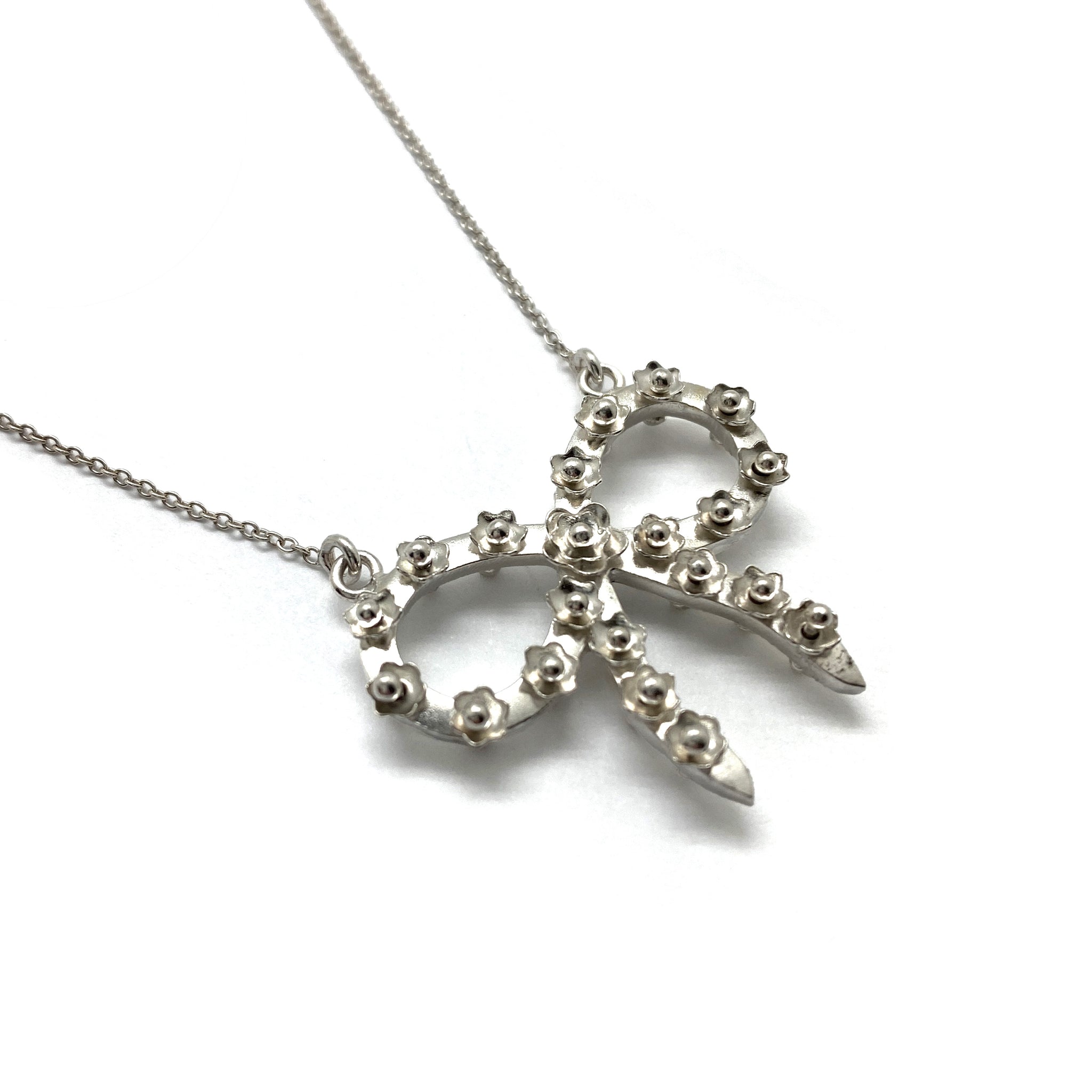 This sweet bow necklace from Liz Clark is adorned with flowers. Each of the sterling silver flowers spin for an added touch of high class craftsmanship.