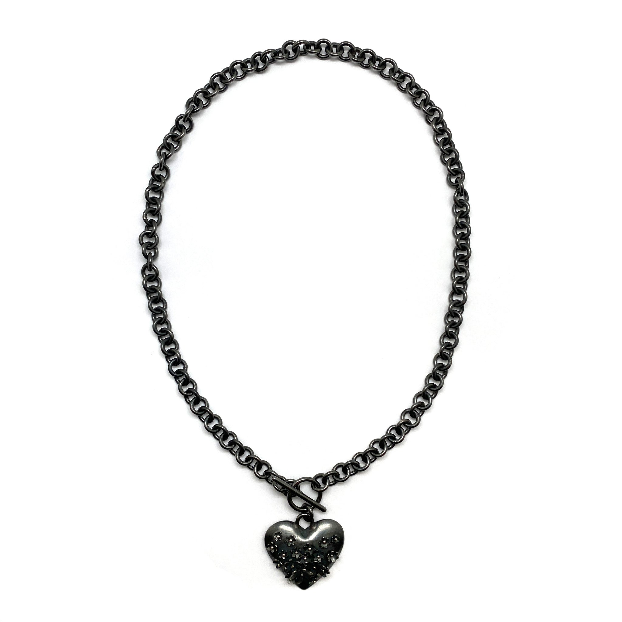 This dark, sterling silver necklace from Liz Clark is made with love. A hollow-form heart is adorned with flowers that spin and suspended from a handmade sterling silver chain.