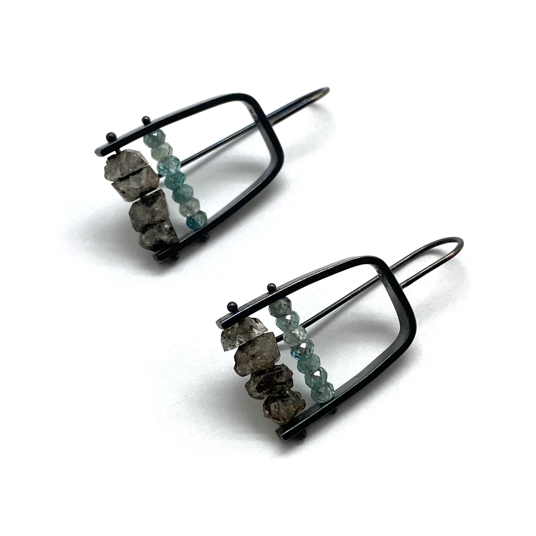 This pair from Ashka Dymel feature two rows of aquamarine and herkimer diamonds. The contrast of the oxidized sterling silver and stones make for an unforgettable pair.