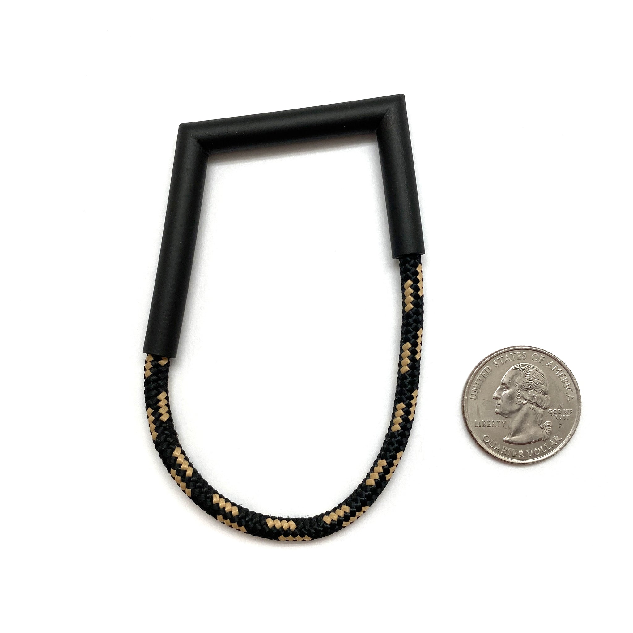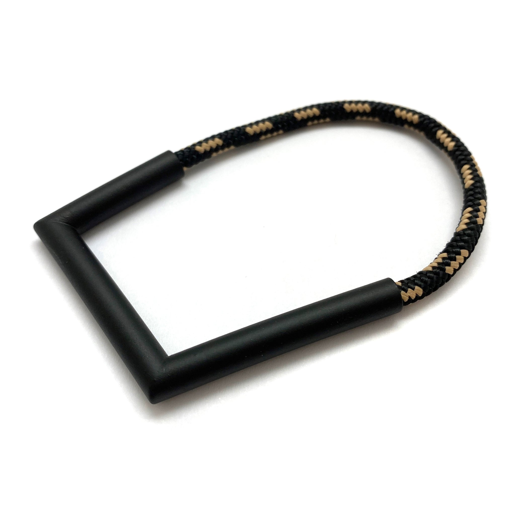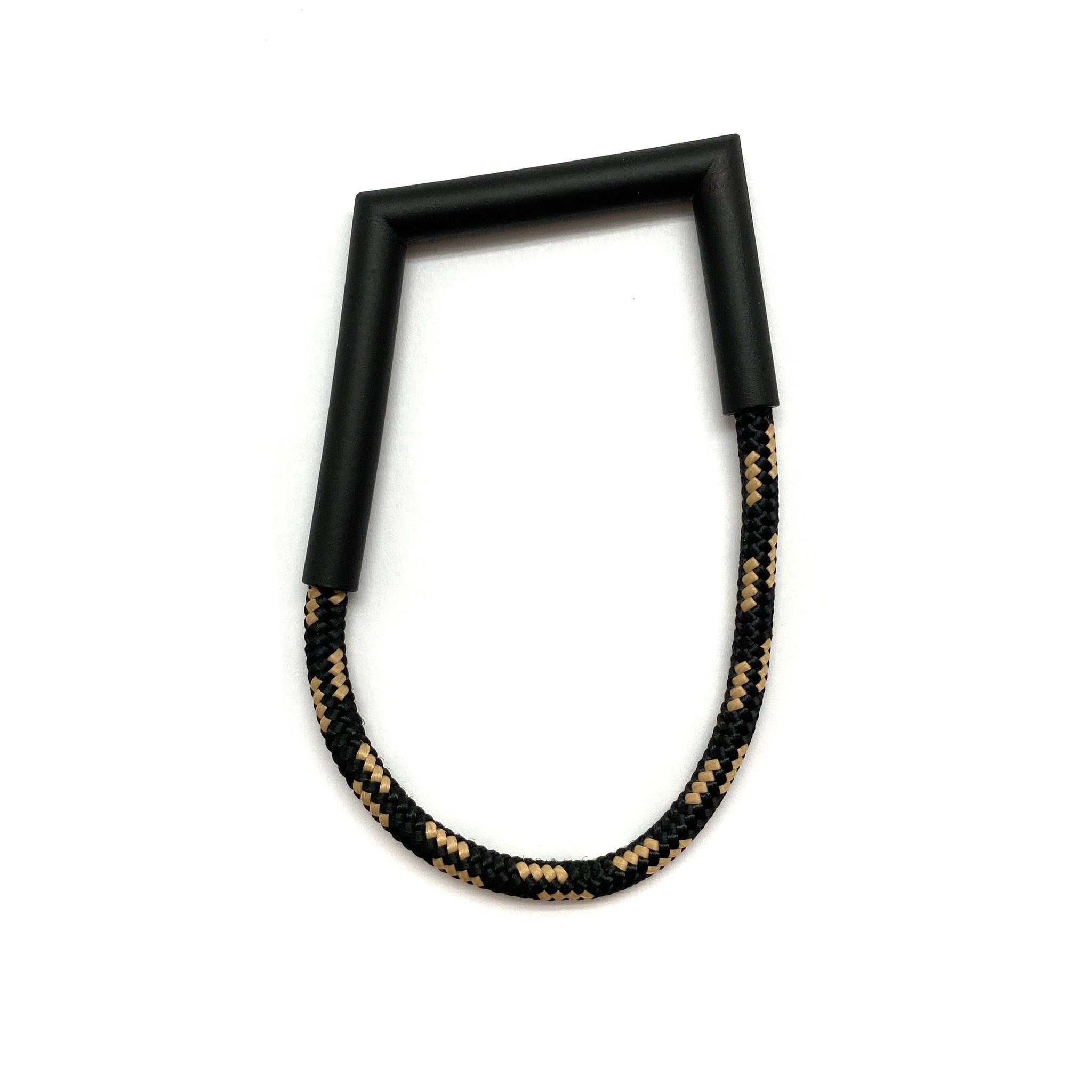 Unlike anything in your collection, this bracelet from Joanne Grimonprez mixes her signature, angular power coated copper with black and cream rope. While the bracelet is comfortable when worn, the rope does not have any stretch and must be slipped over the hand.