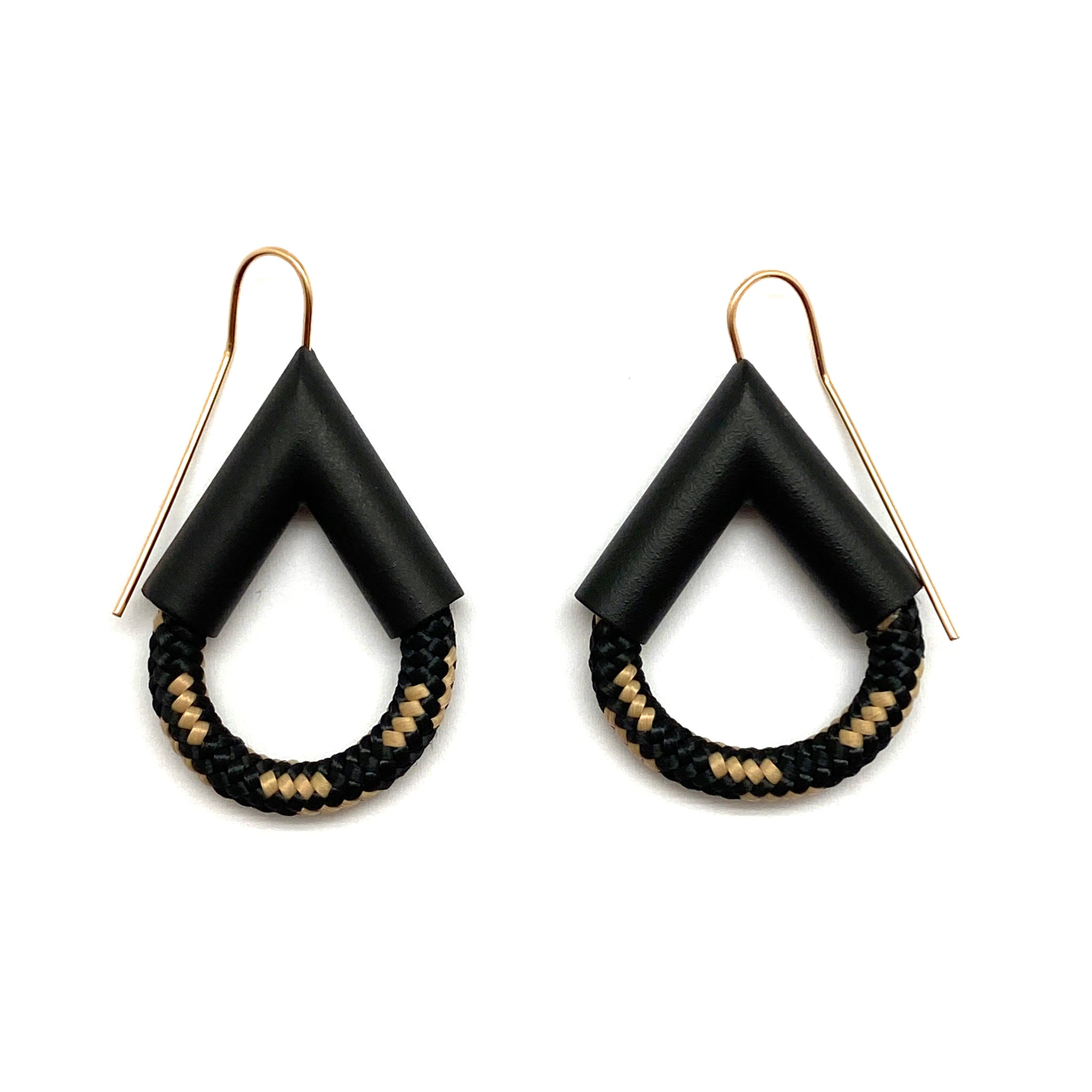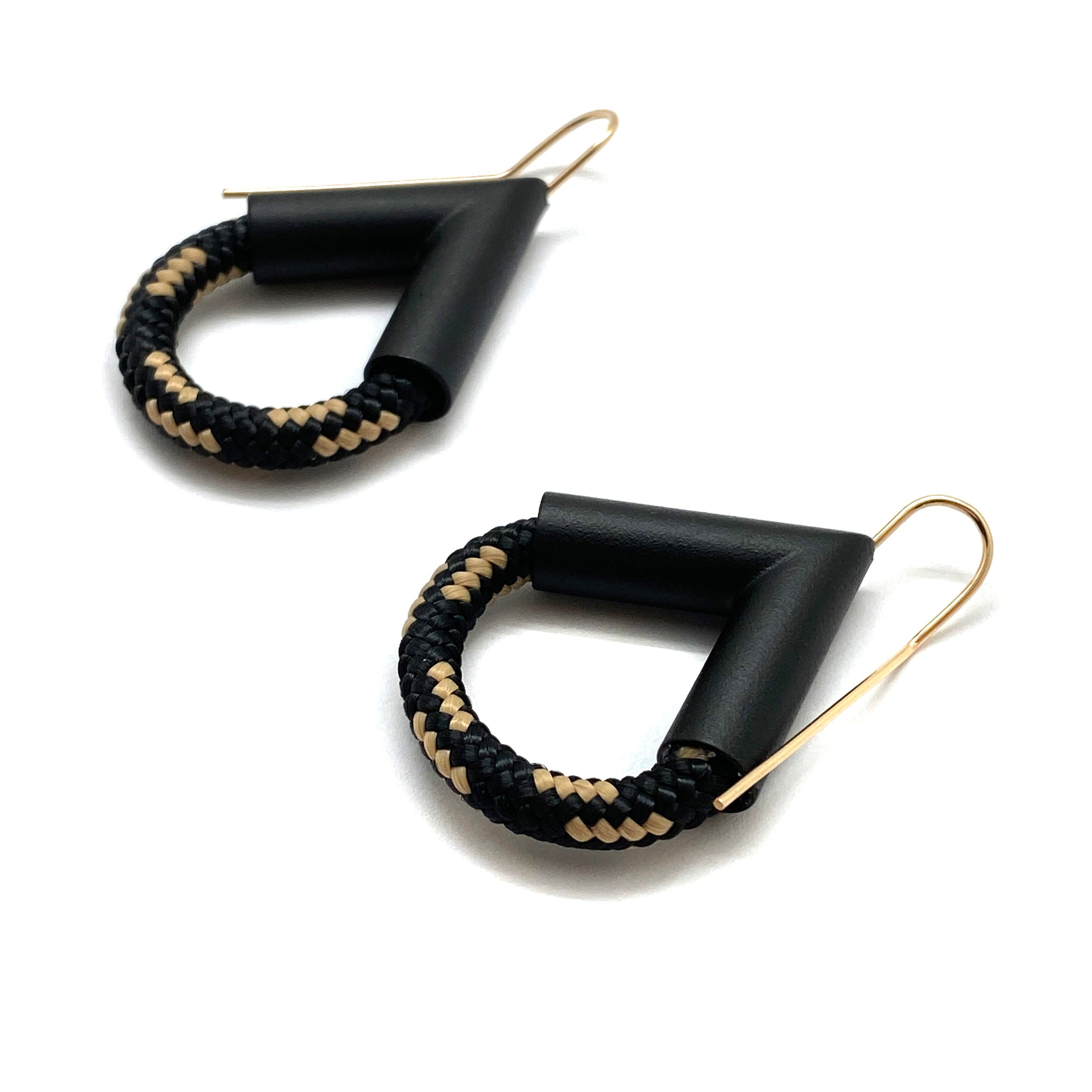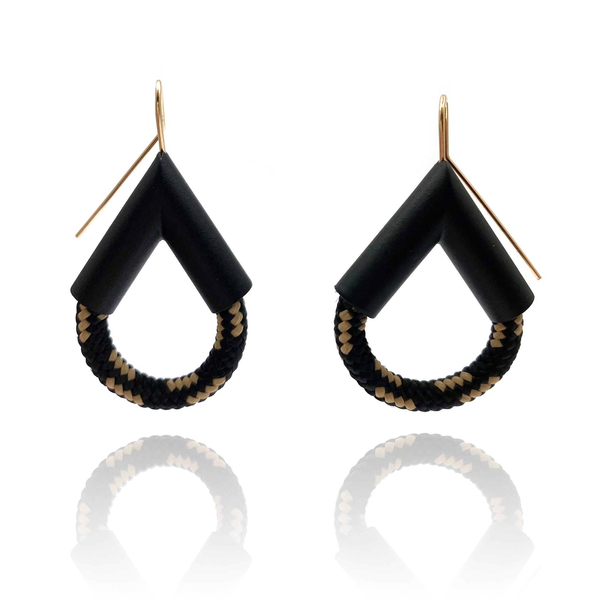These geometric earrings from Joanne Grimonprez effortlessly mix hard and soft. Black and cream rope swoop from Grimonprez's signature, angular powder coated copper on this statement pair.