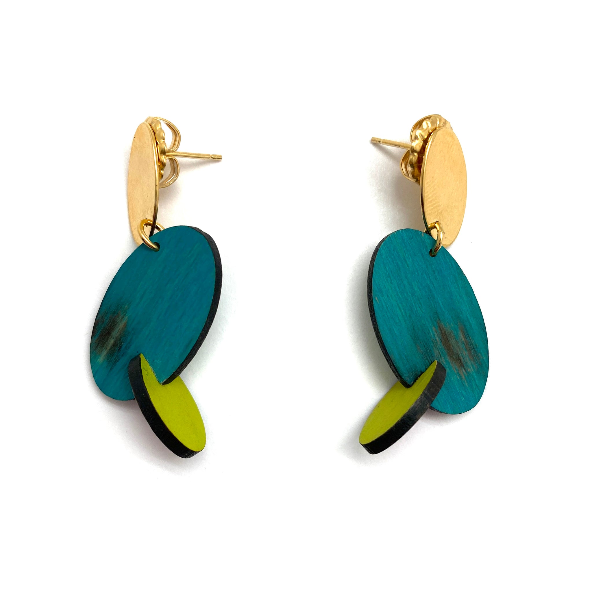 Suspended from oval gold vermeil posts, these dimensional earrings are made with brightly painted wood. This lightweight pair are ready to add pops of multi-color to any outfit!