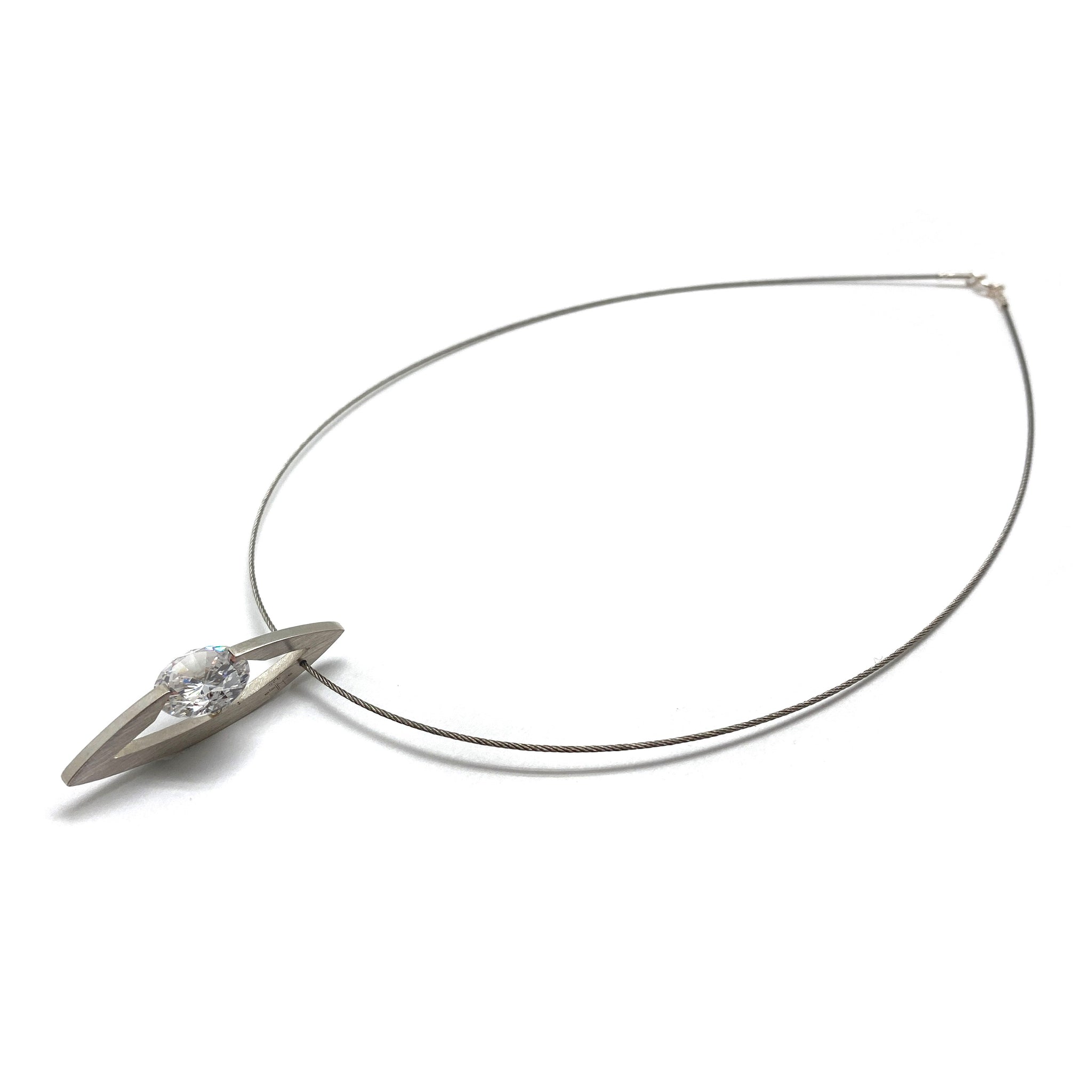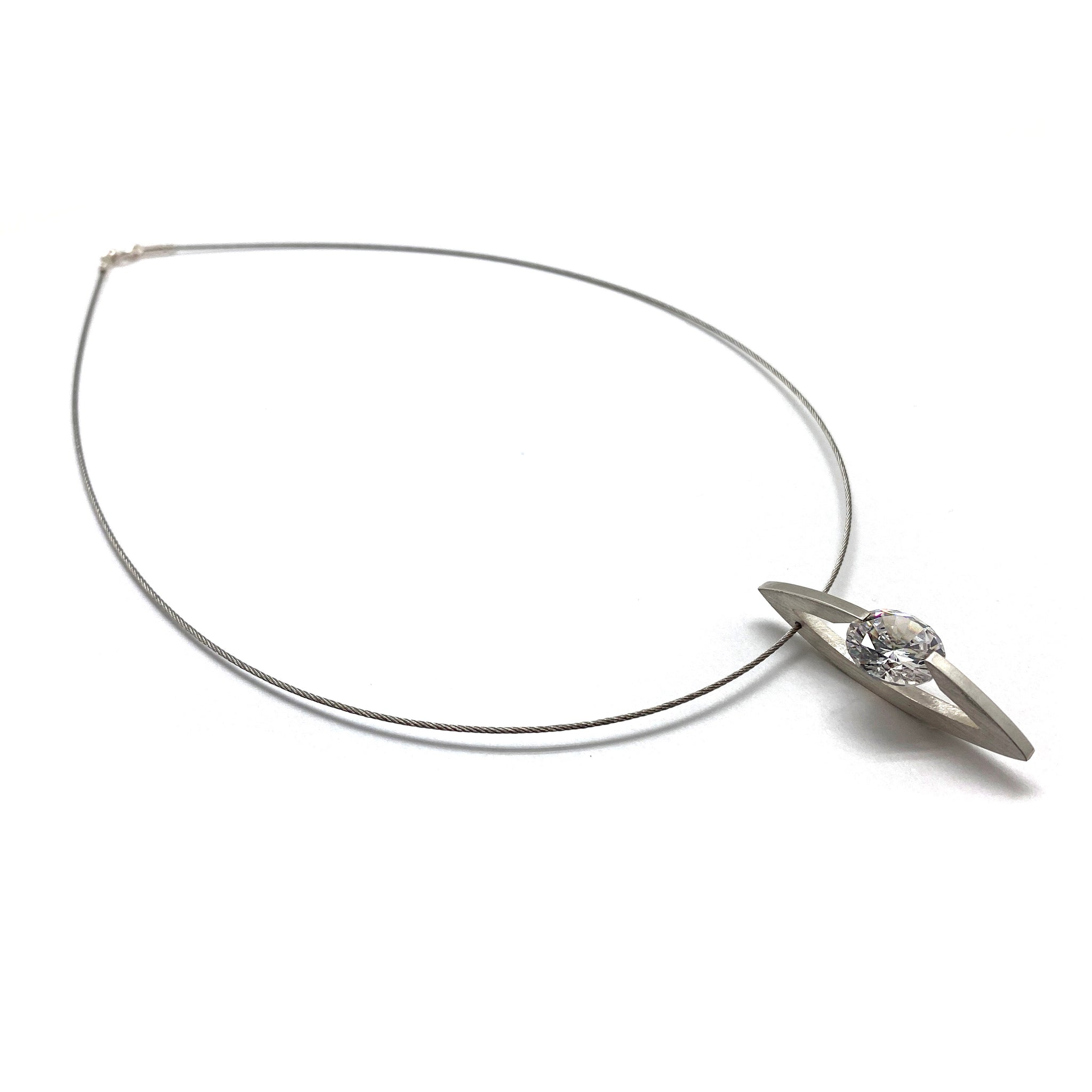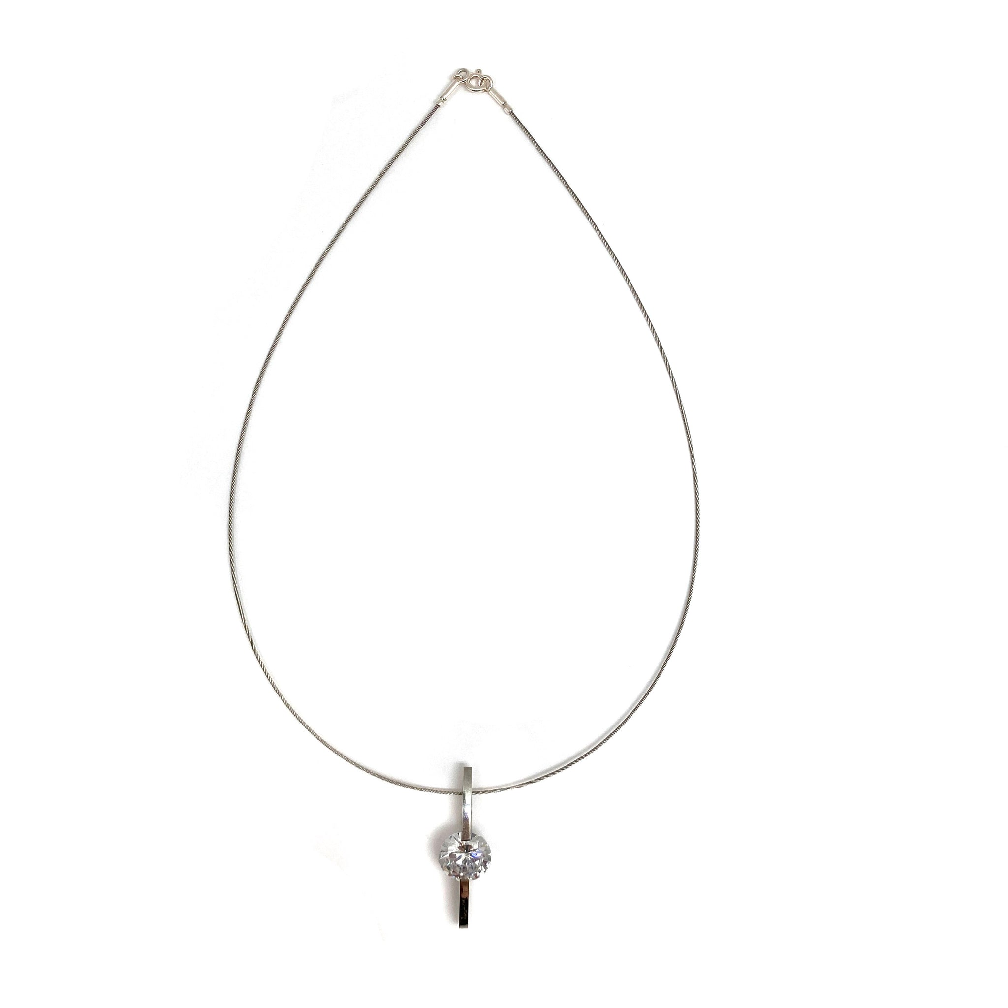 This oversized CZ is a knock out! Uniquely set in sterling silver and suspended from a stainless steel cable, this pendant necklace can elevate a casual outfit or dress up your next night out.