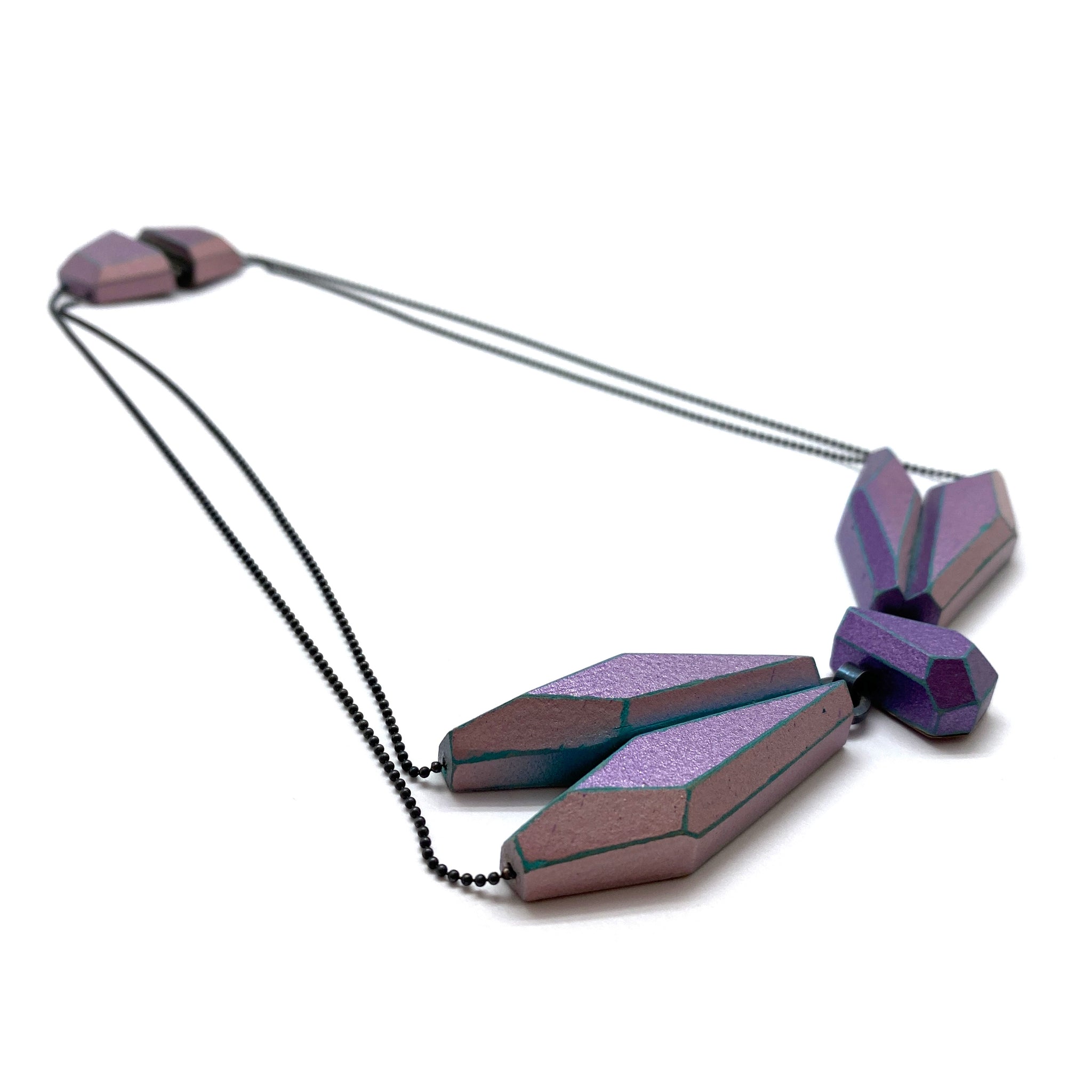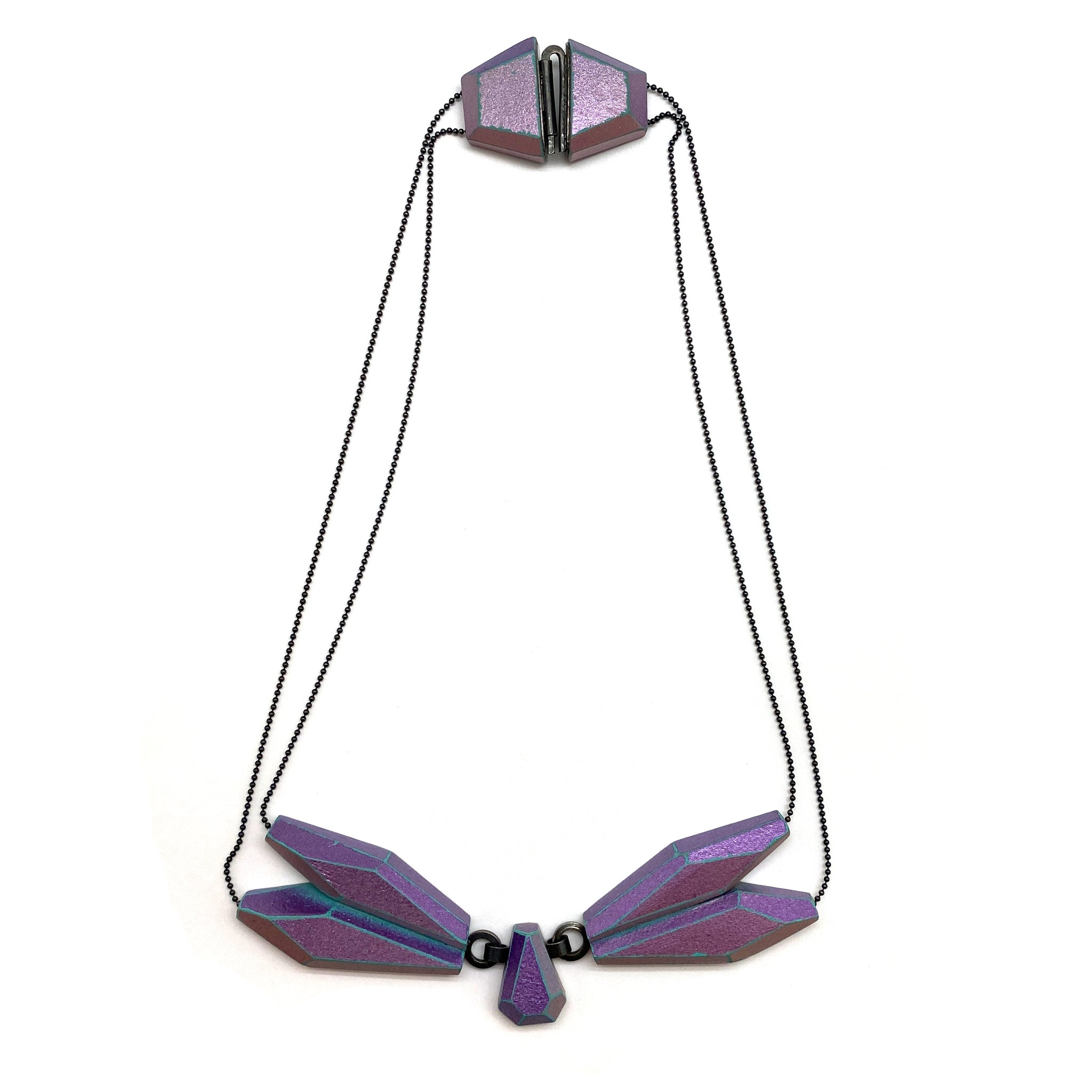 The Chromotopia from Eva Burton is a fun shake up of the pendant necklace. Best worn with a tank top or a crew neck tee shirt, the two ball chains lay flatly for a layered look in addition to the bright, purple pendant.