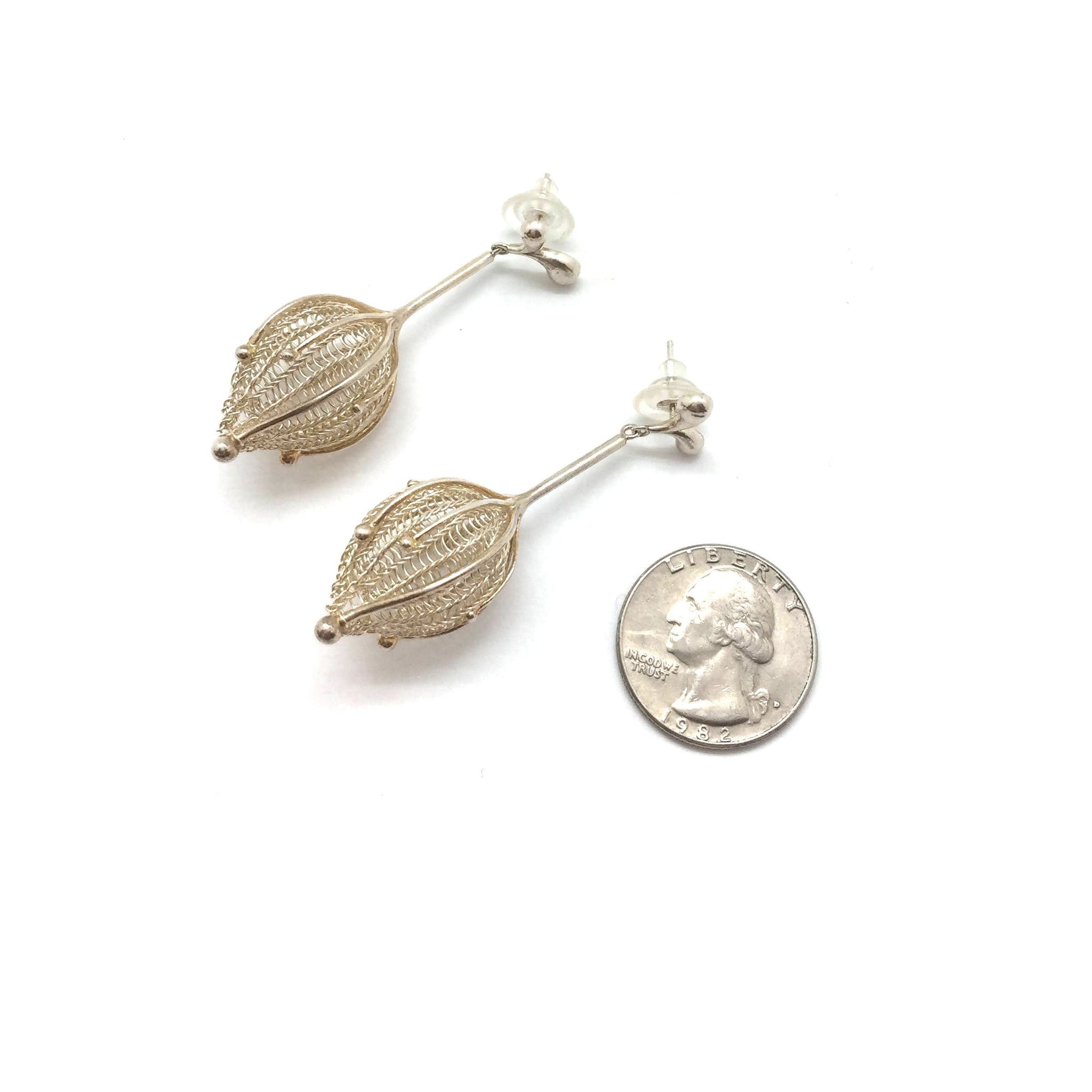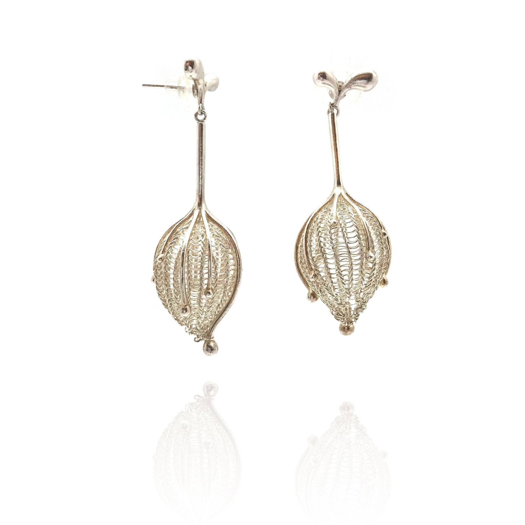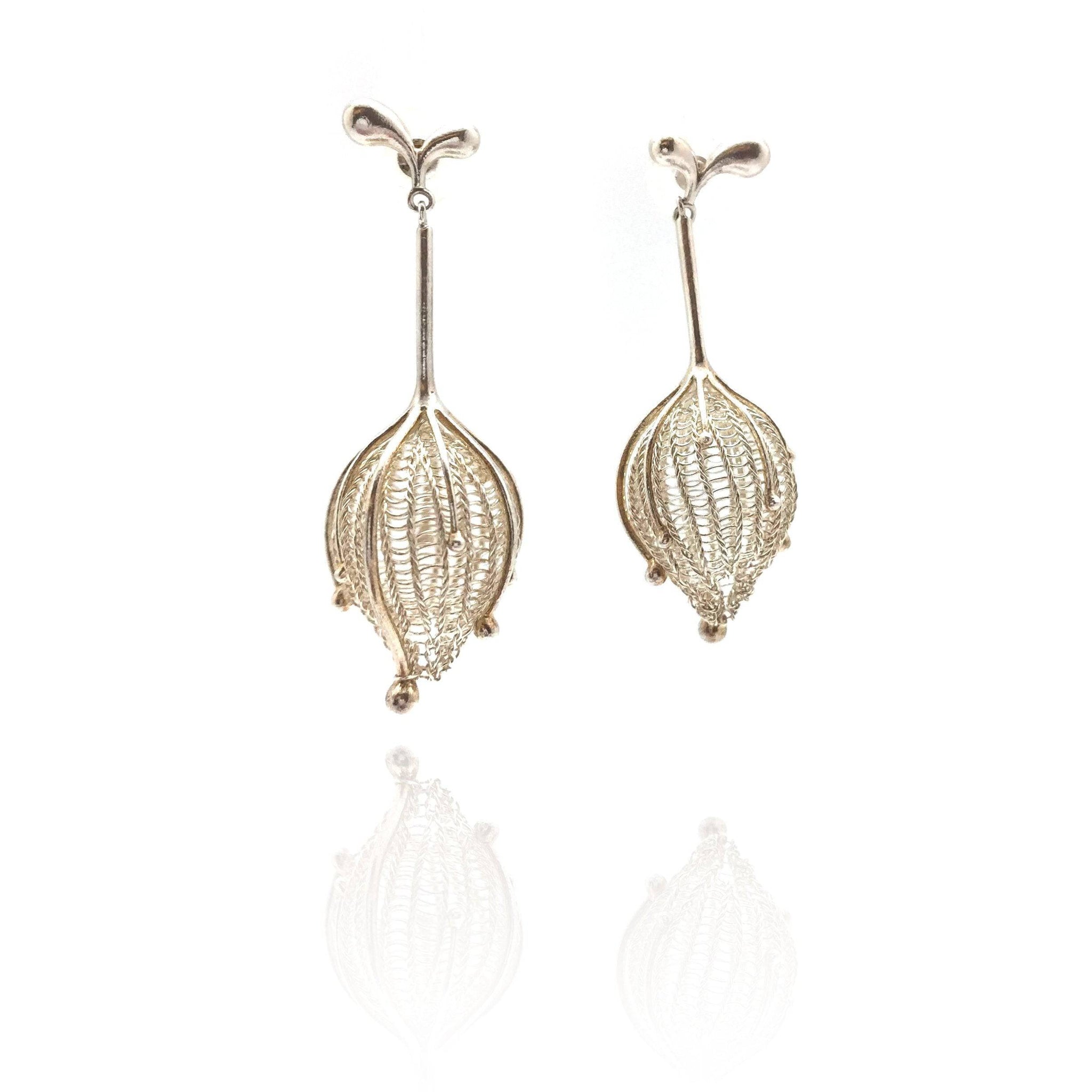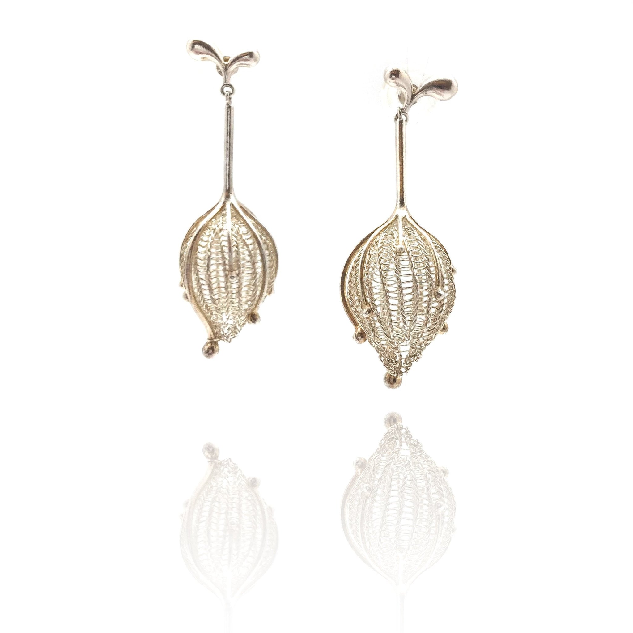 Reminiscent of dew drops, this pair by Sowon Joo are effortlessly elegant. Made with her signature crocheted sterling silver wire and with sterling silver accents, these earrings are asymmetrical.