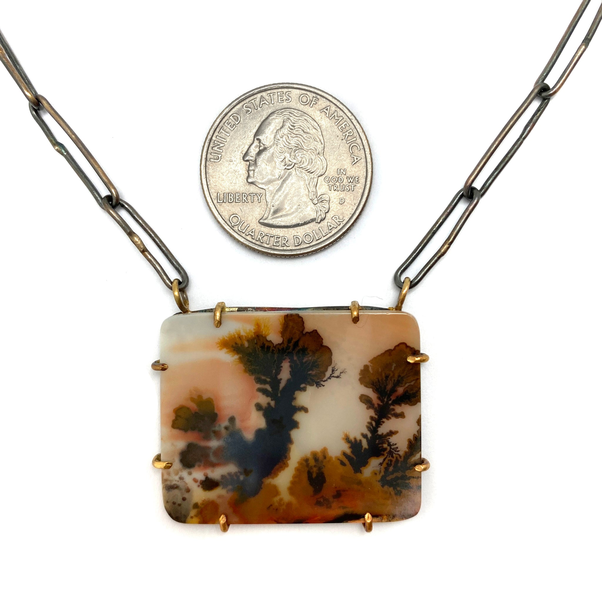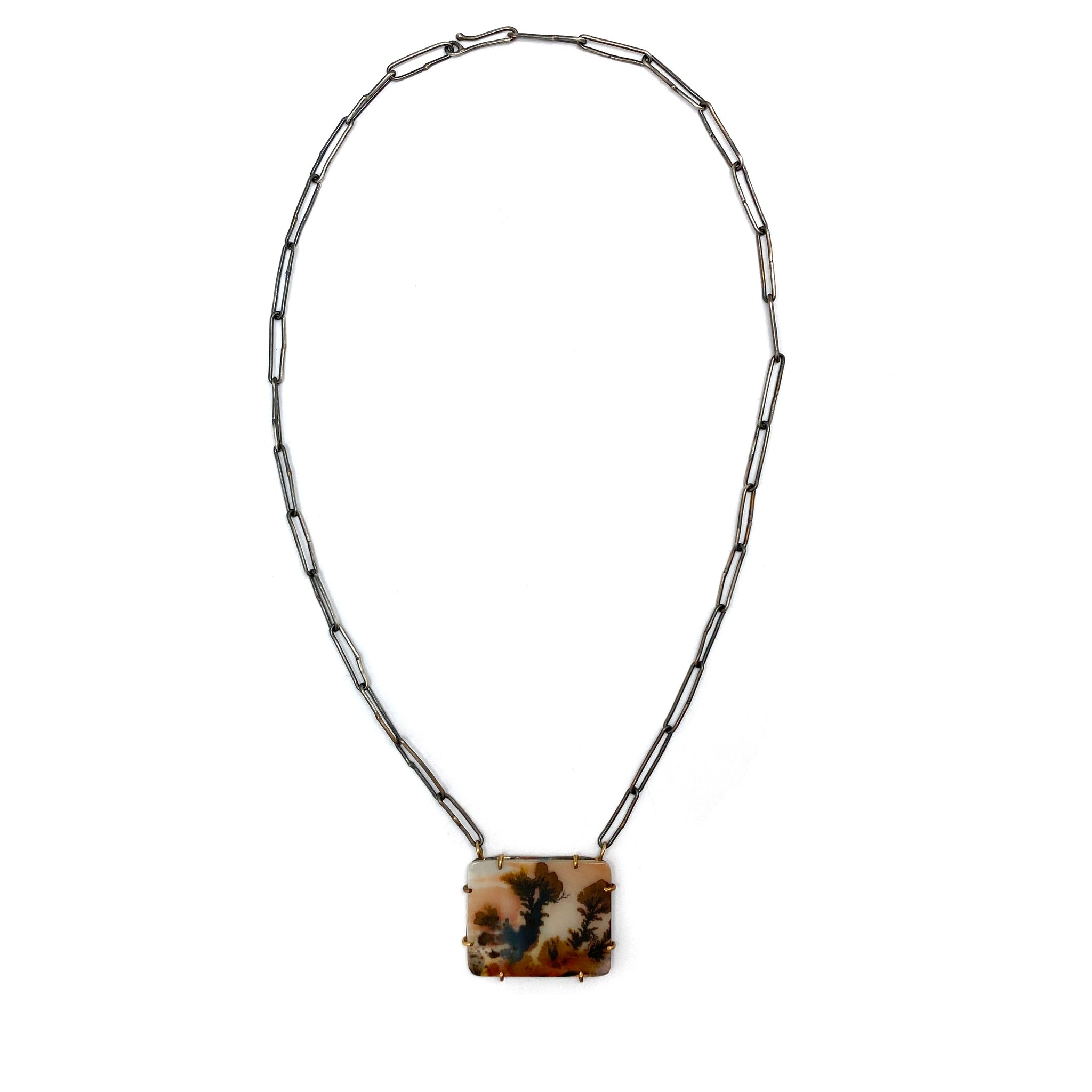 Suspended from a handmade, oxidized sterling silver chain with a hook closure, this dendritic agate necklace is one of a kind. Set with 18k prongs, this piece of agate has a beautiful warmth.
