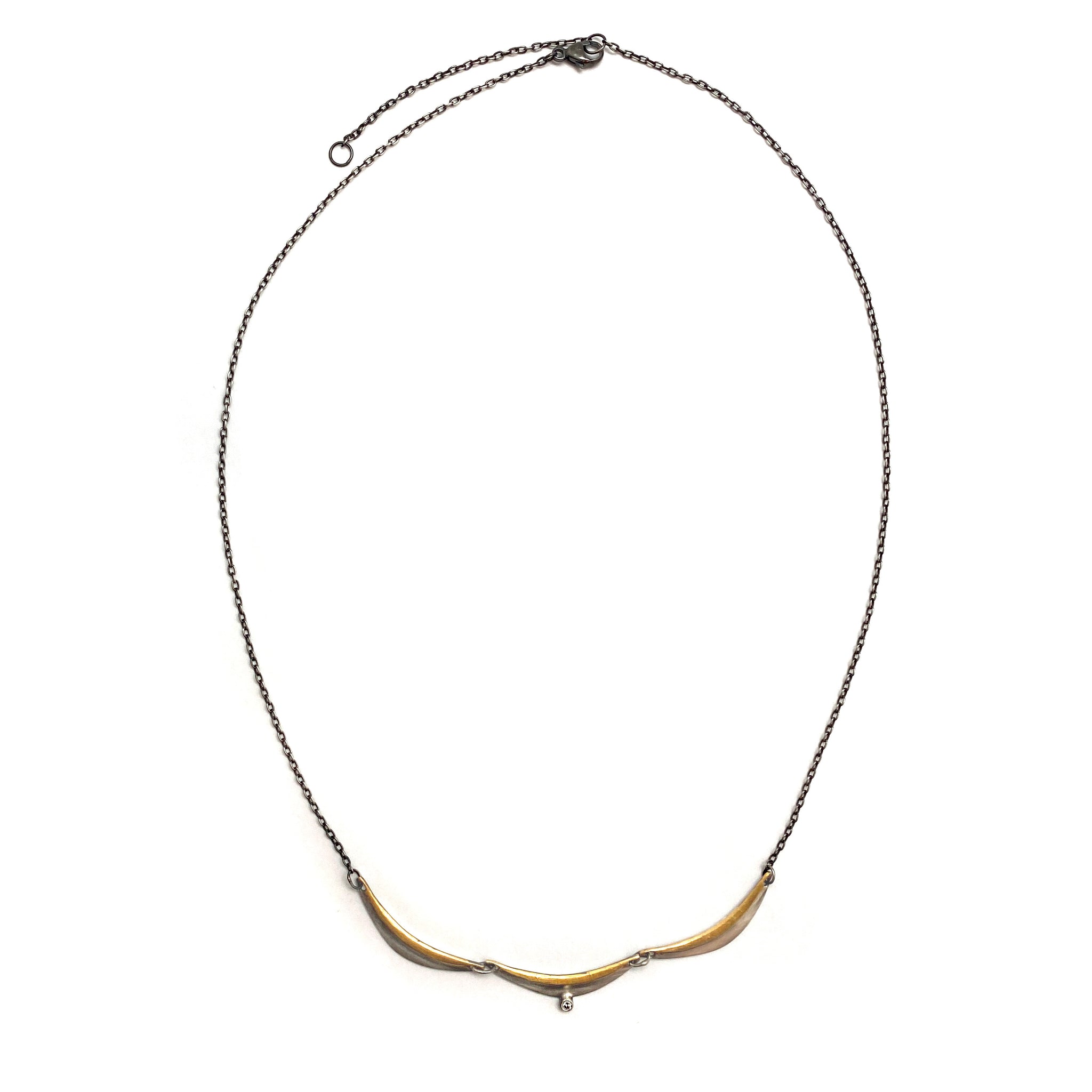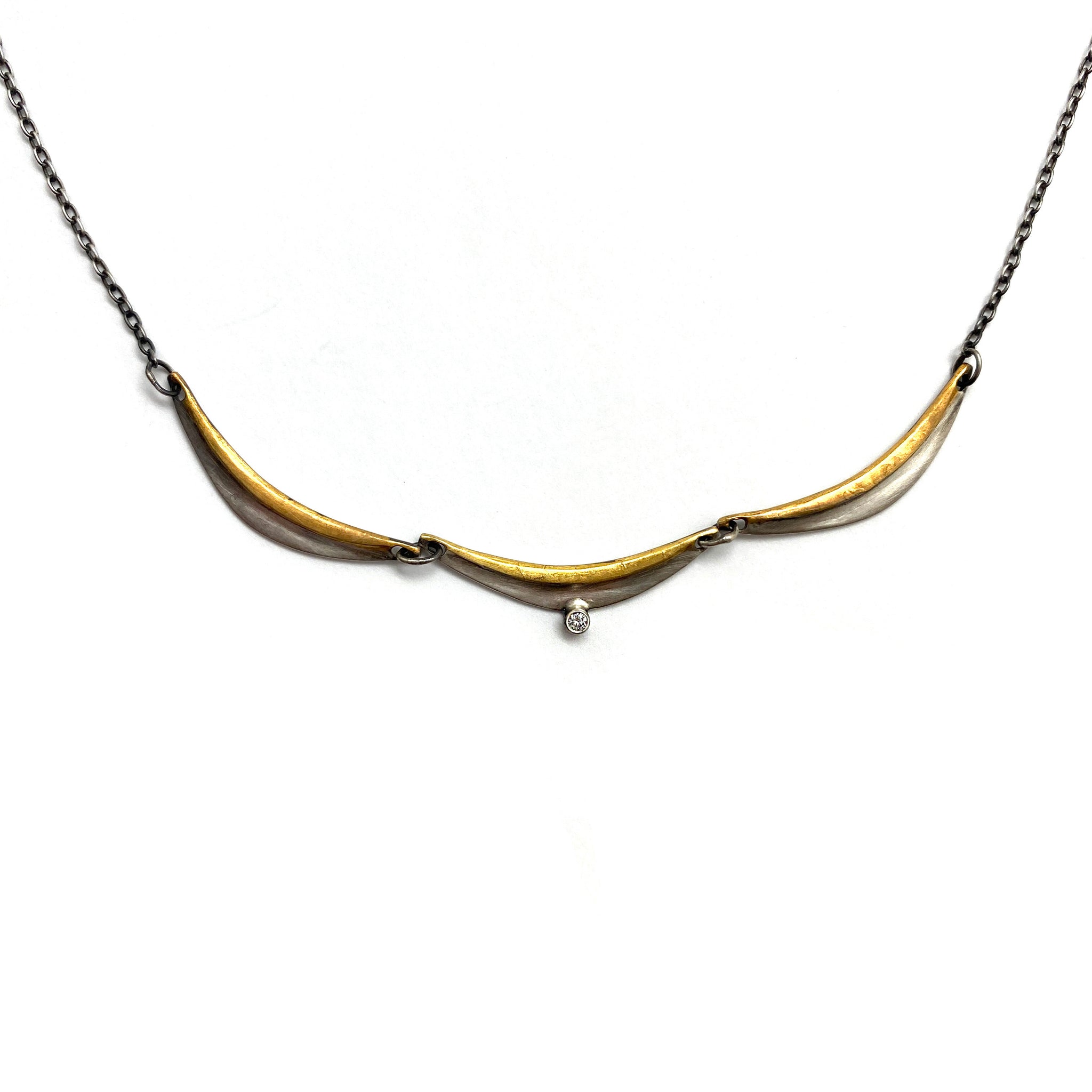 This tiered necklace is perfect for every day. With a single, shining diamond and a mix of sterling silver and 24k gold keum-boo, this mixed metal piece can be worn solo or stun in an existing necklace stack.