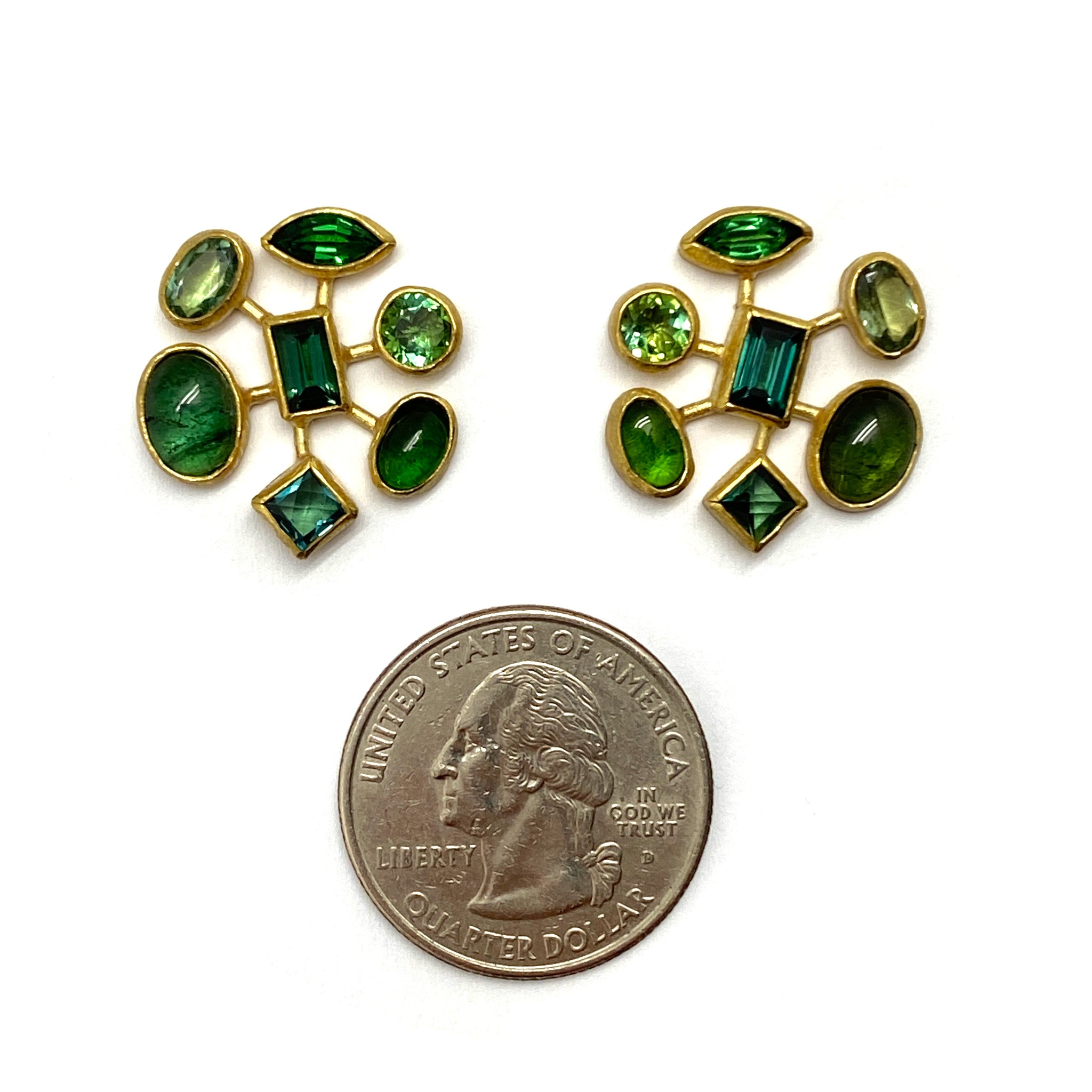 Made with gorgeous green tourmalines set in 18k and 22k gold, this pair by Petra Class are unforgettable. These post back earrings are finished with omega backs for ultimate comfort and security. Effortlessly pair these statement studs with Petra's Green Tourmaline and Gold Necklace.