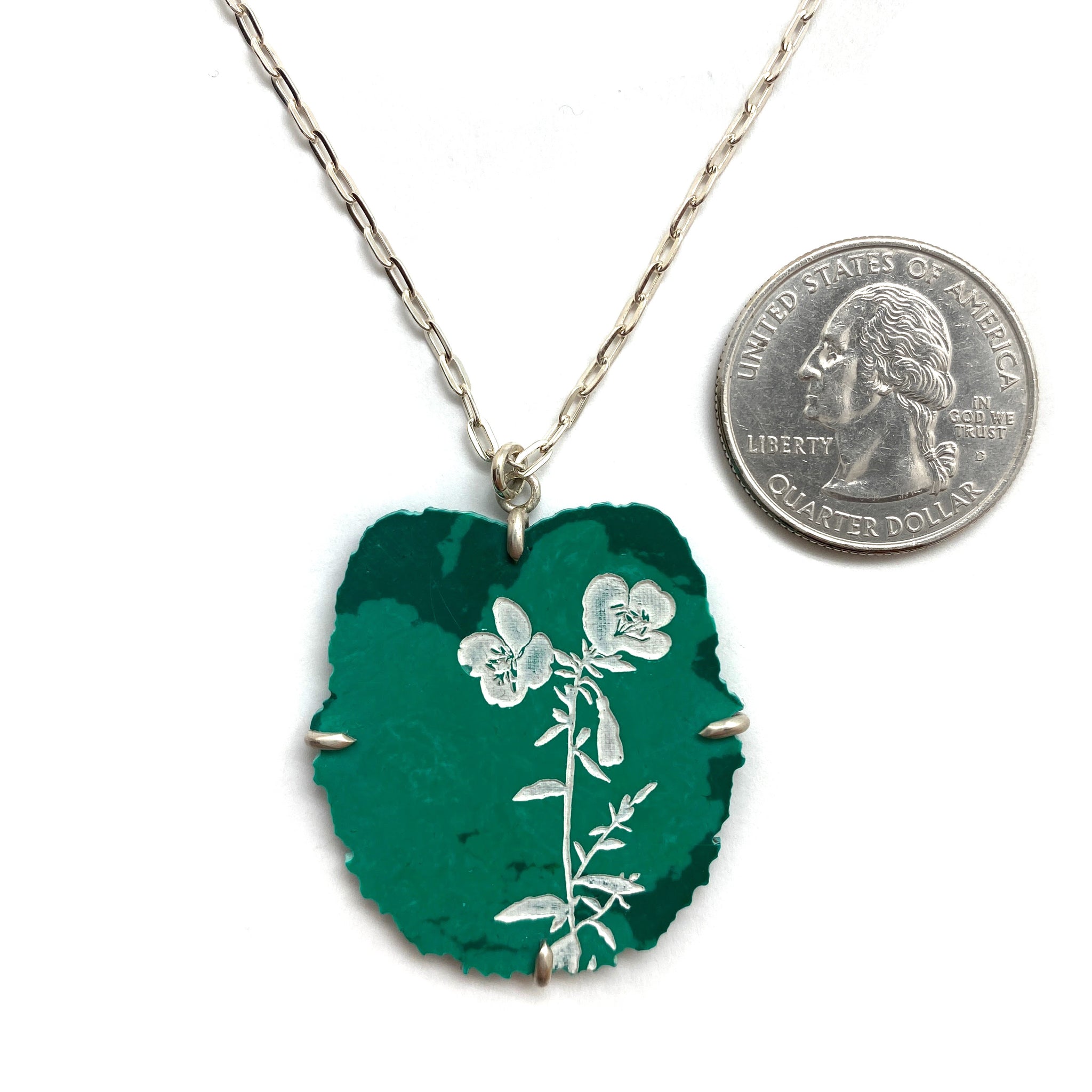 Suspended from a bright sterling silver chain sways an ethically sourced green malachite. Finished with Kelly Jean Conroy's signature floral etchings, this necklace will pop with even the simplest of outfits.