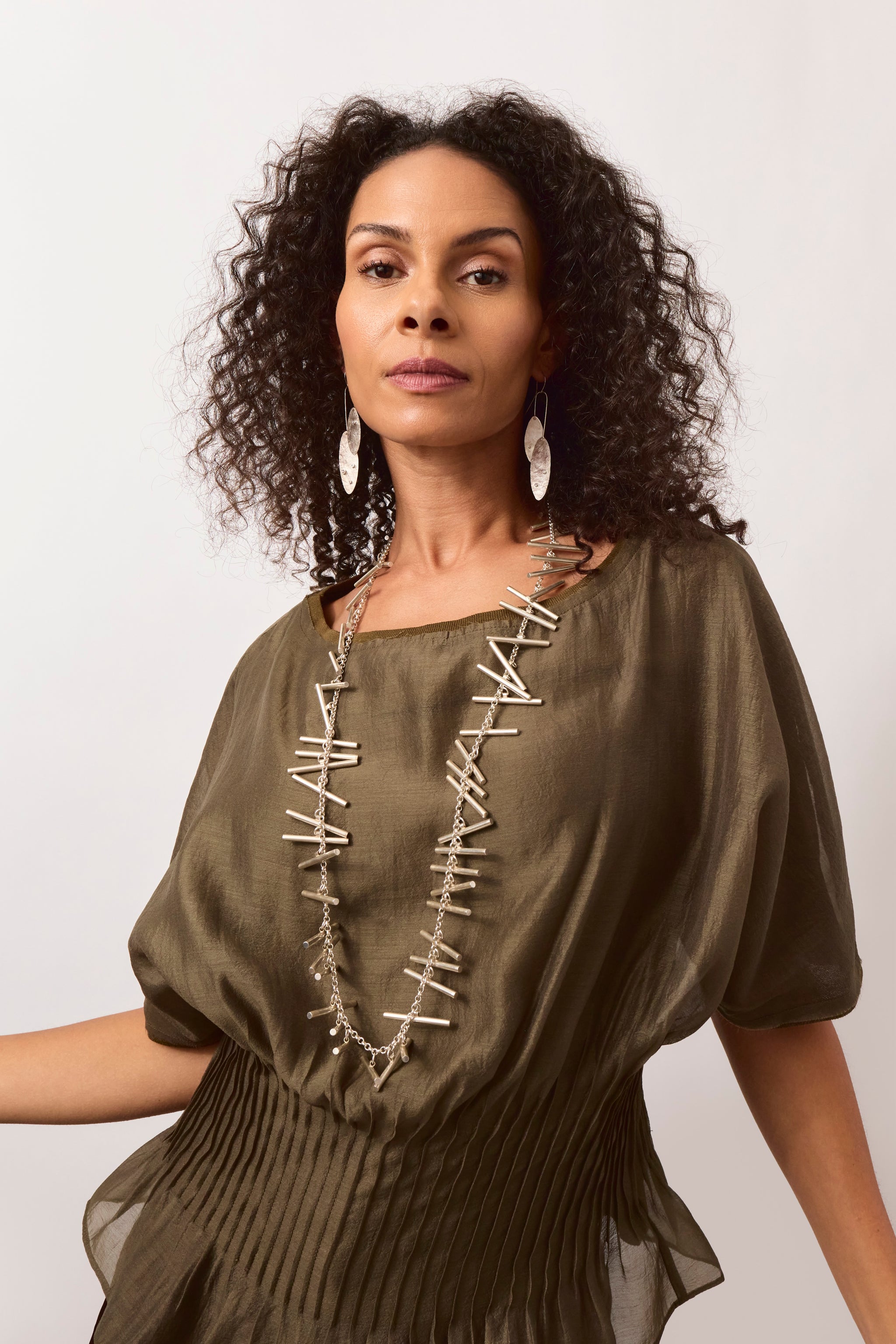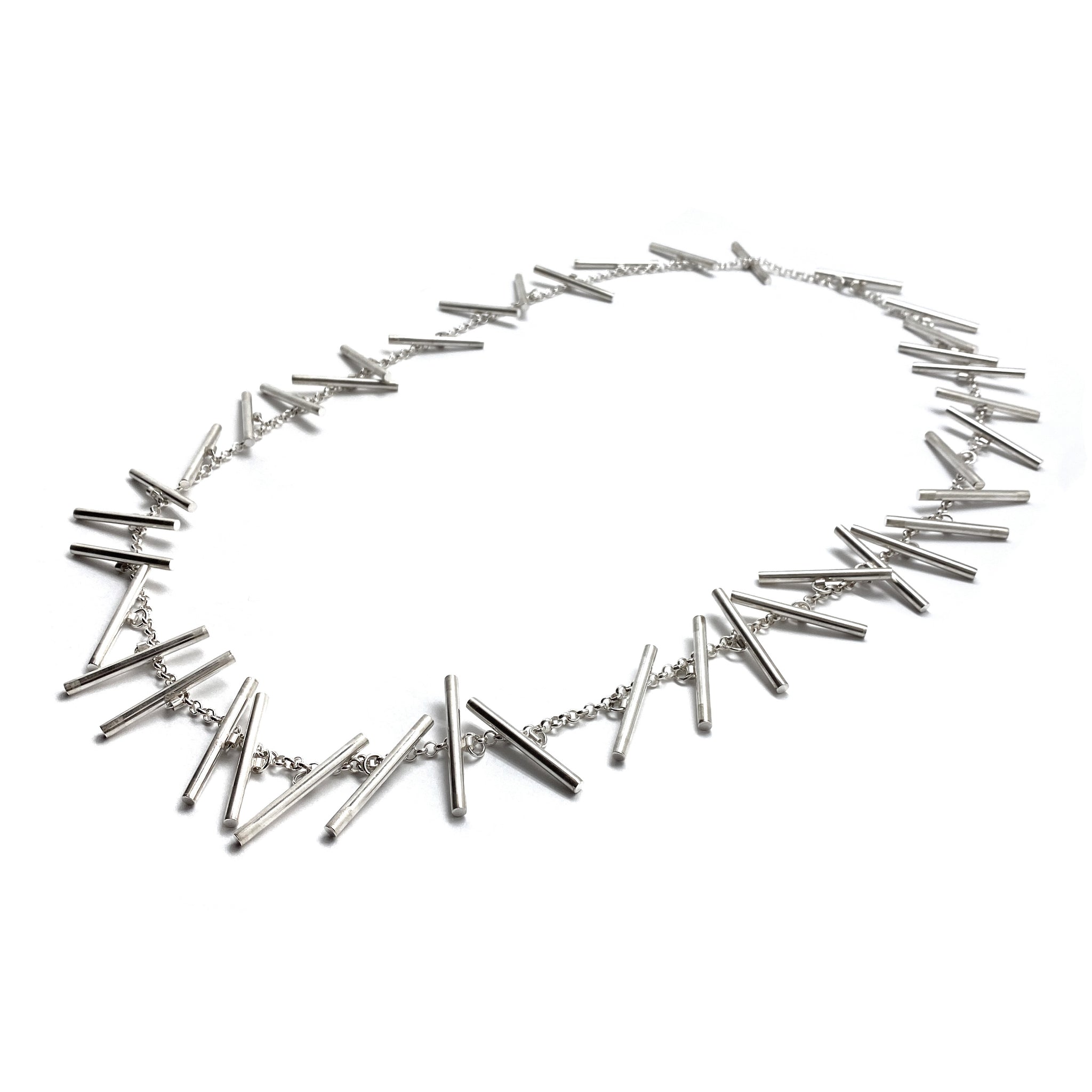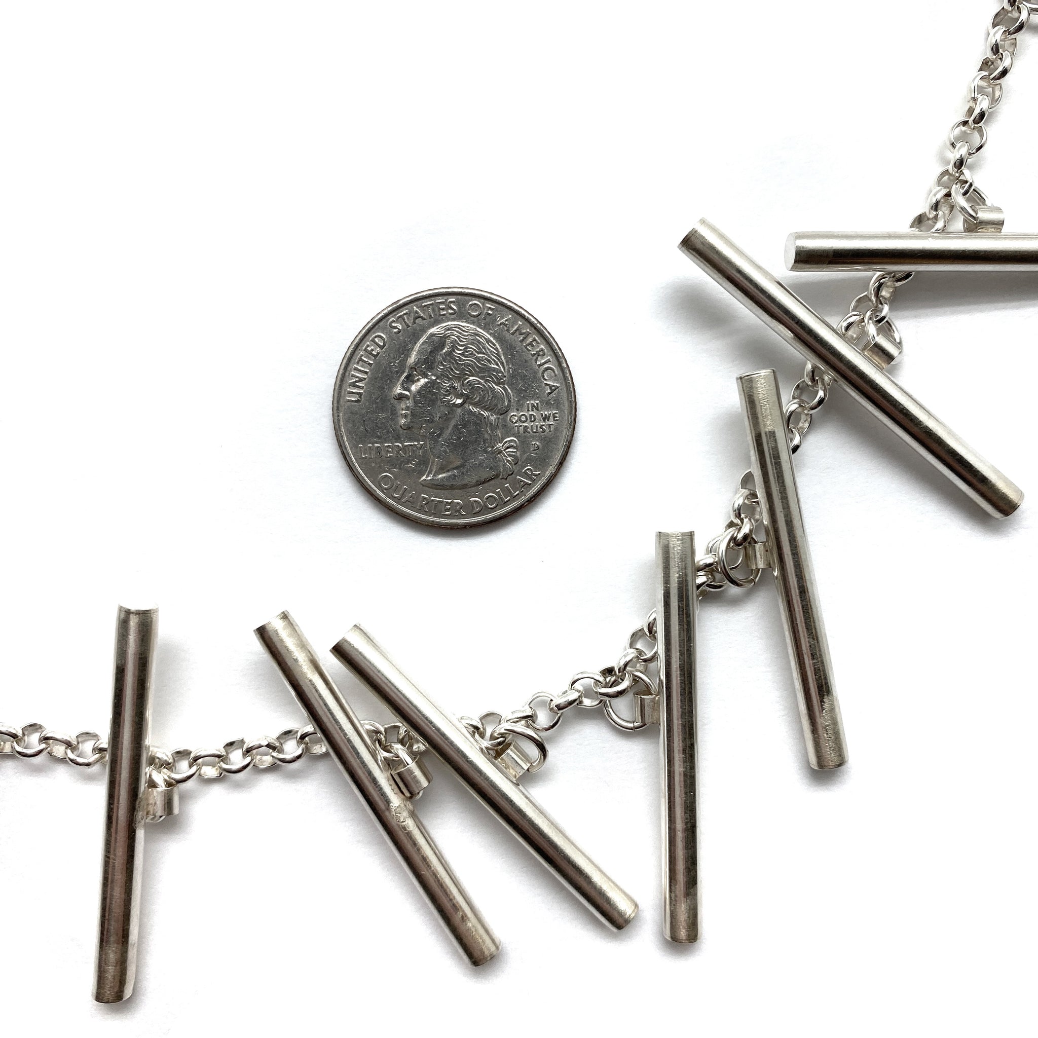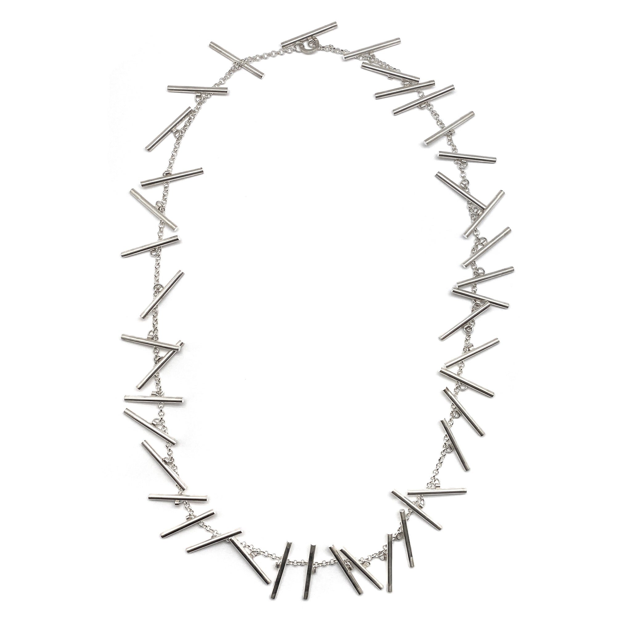 Made with sterling silver bars on a long chain, this necklace is an easy to wear every day statement. This piece can effortlessly add a bright pop to any outfit.