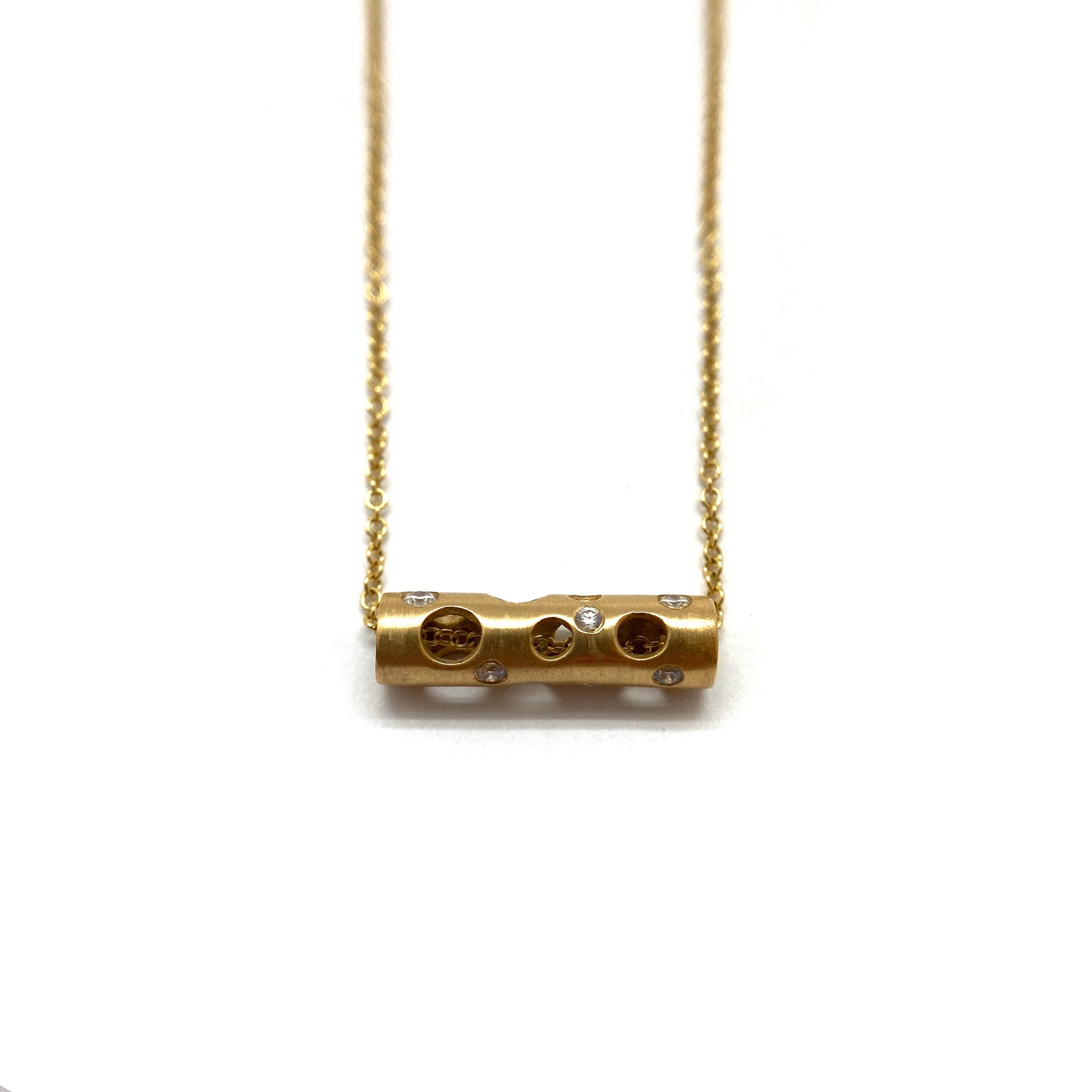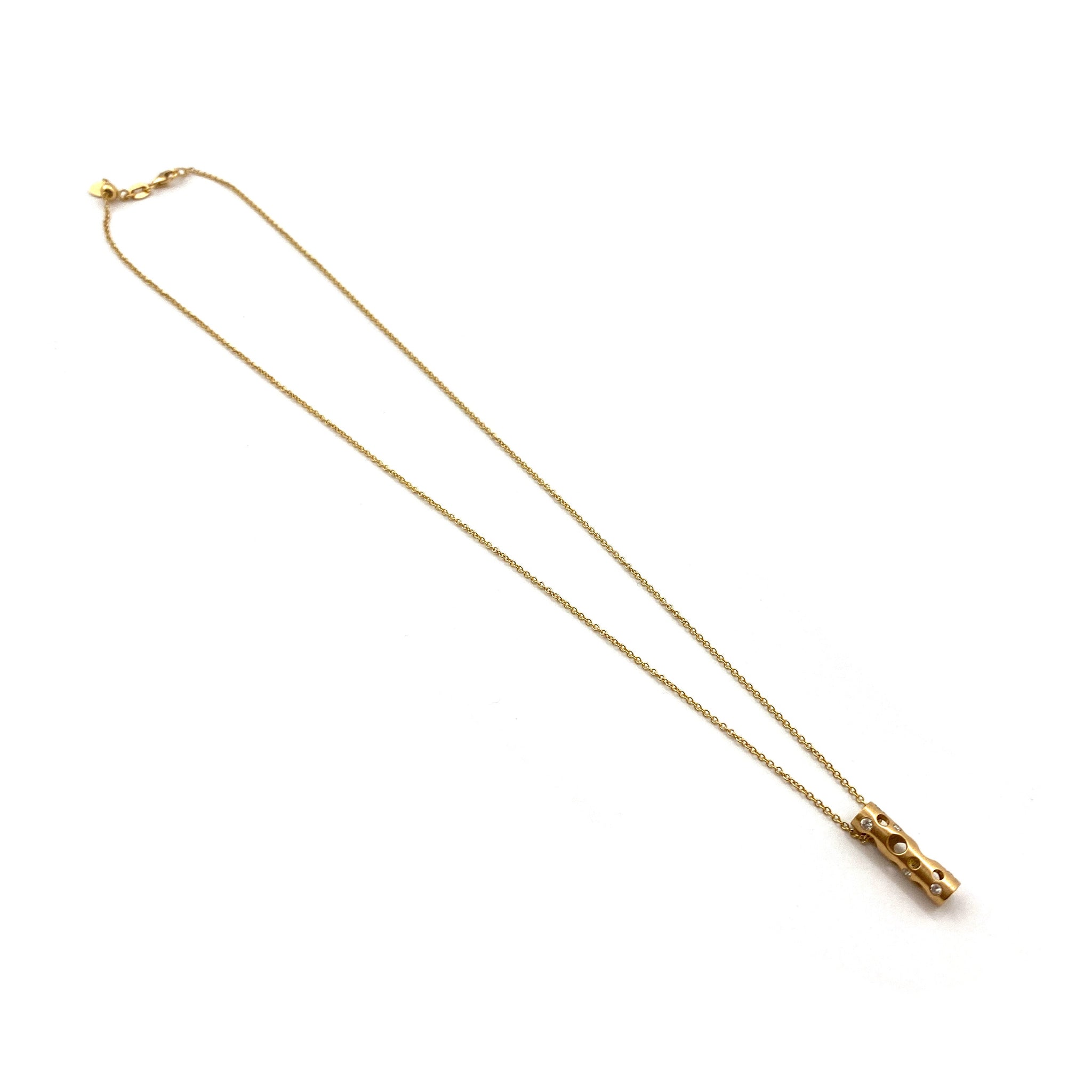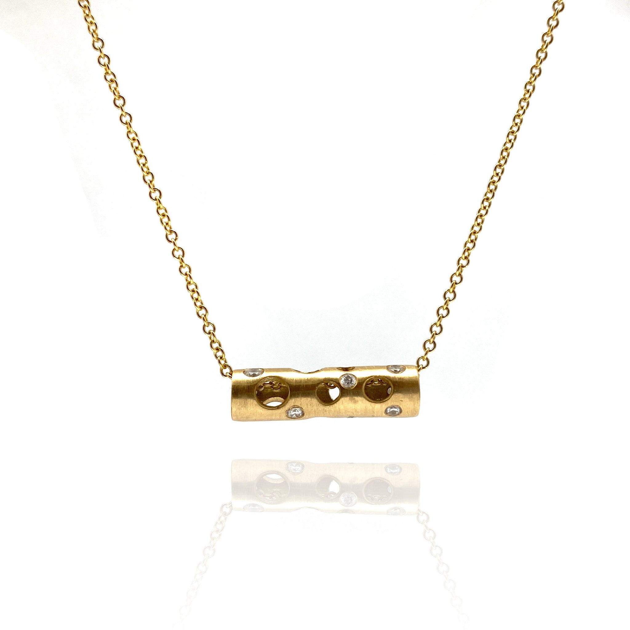 In her signature style, Dana Bronfman plays with positive and negative space. This necklace in 18k gold has several diamonds sprinkled in here and there, adding touches of sparkle. The pendant can be worn vertically or horizontally. This petite pendant is great for every day.