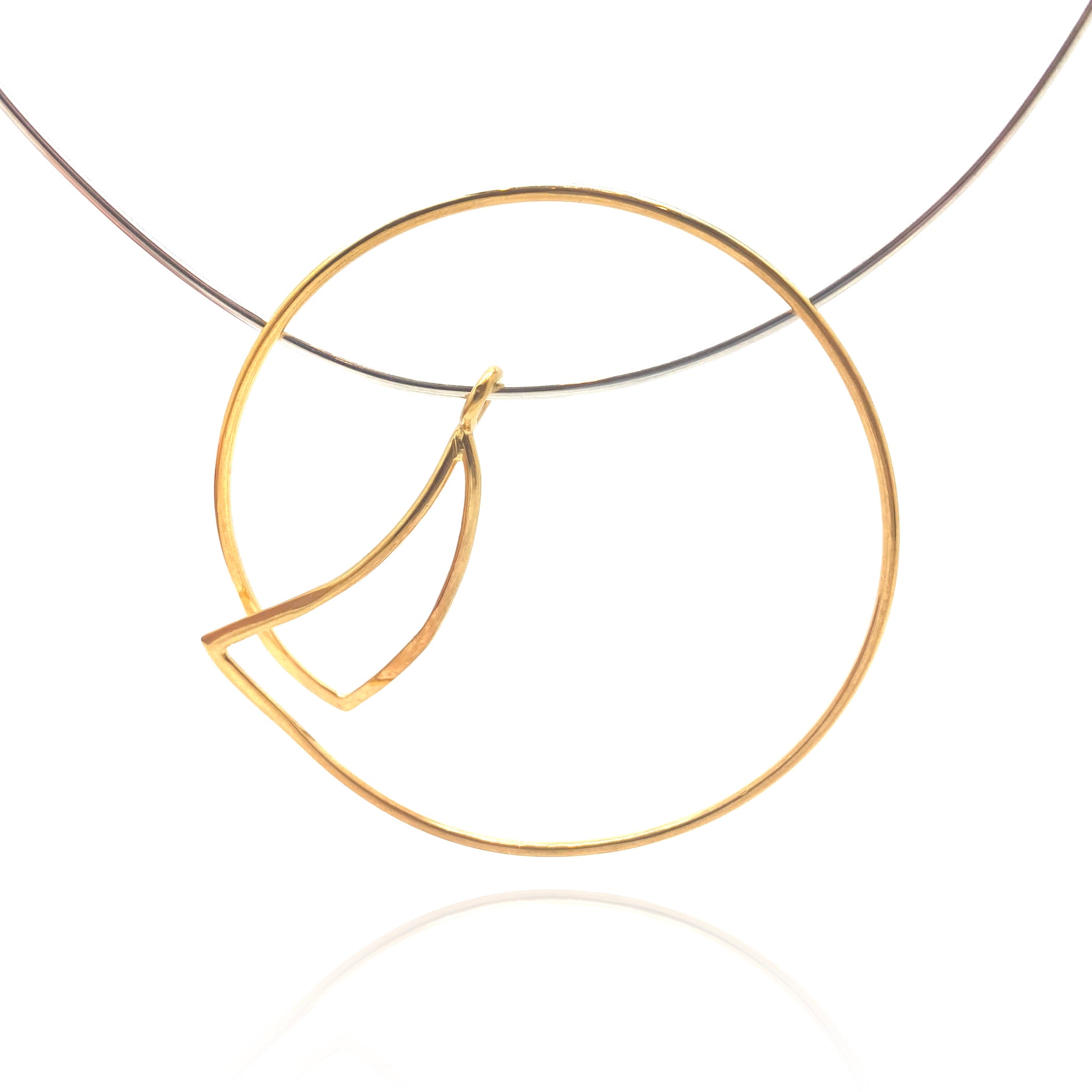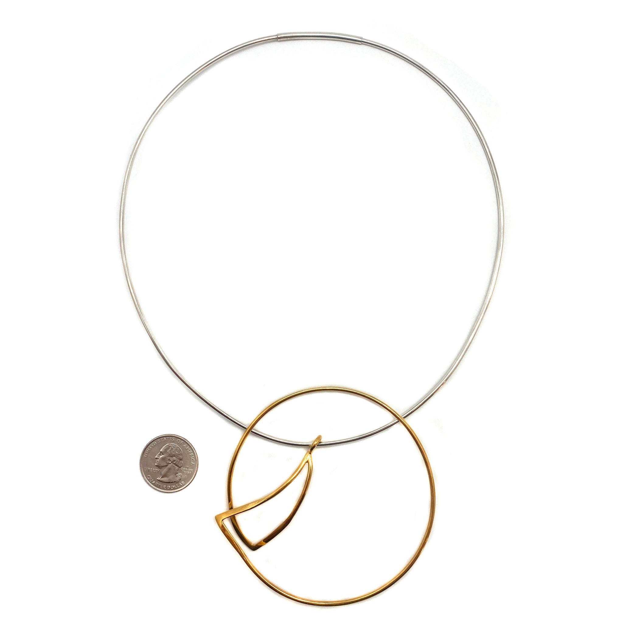 This oversized pendant necklace mixes bright sterling silver and gold vermeil. The twisted, sculptural gold vermeil pendant is suspended from a thick sterling silver wire that is finished with a secure tube setting.