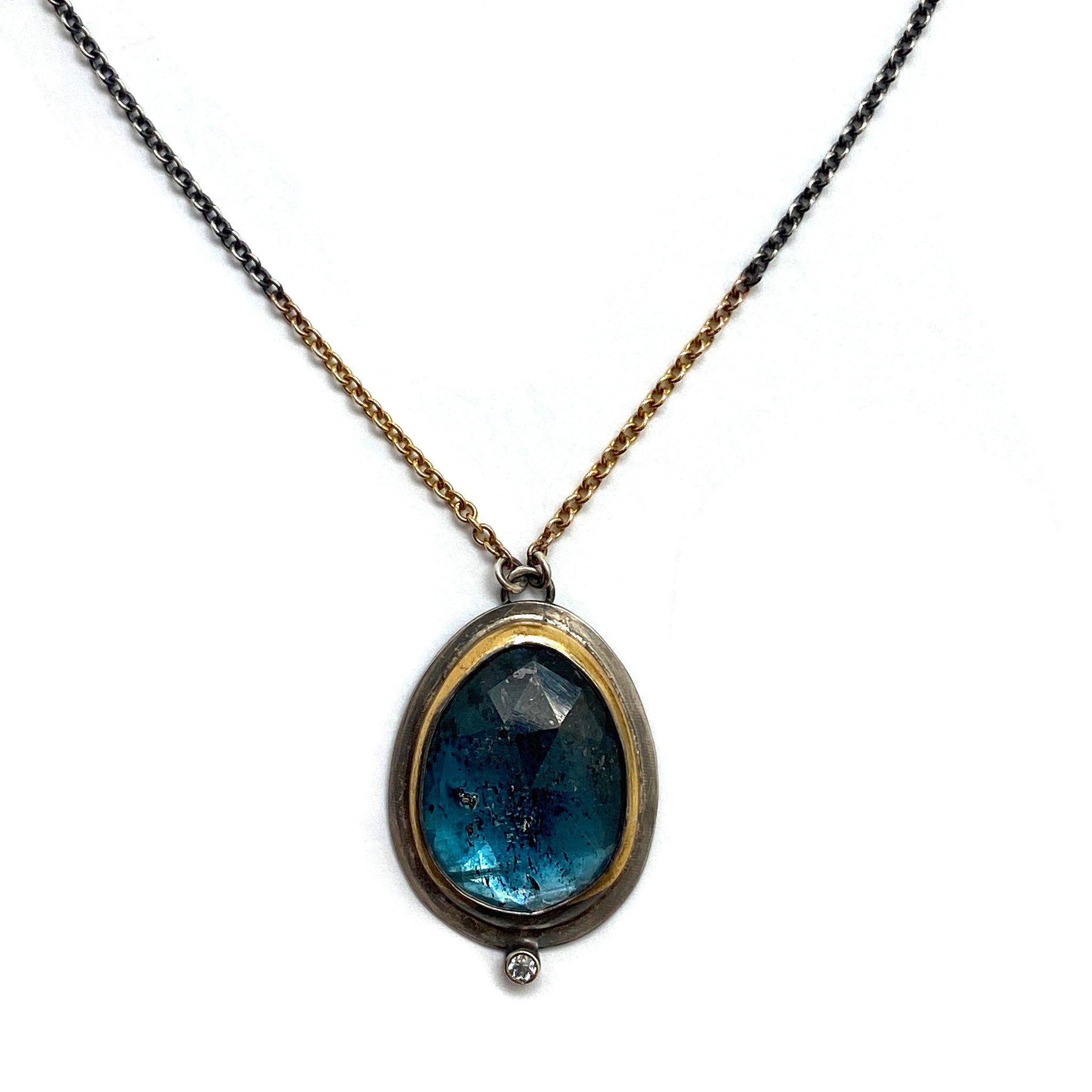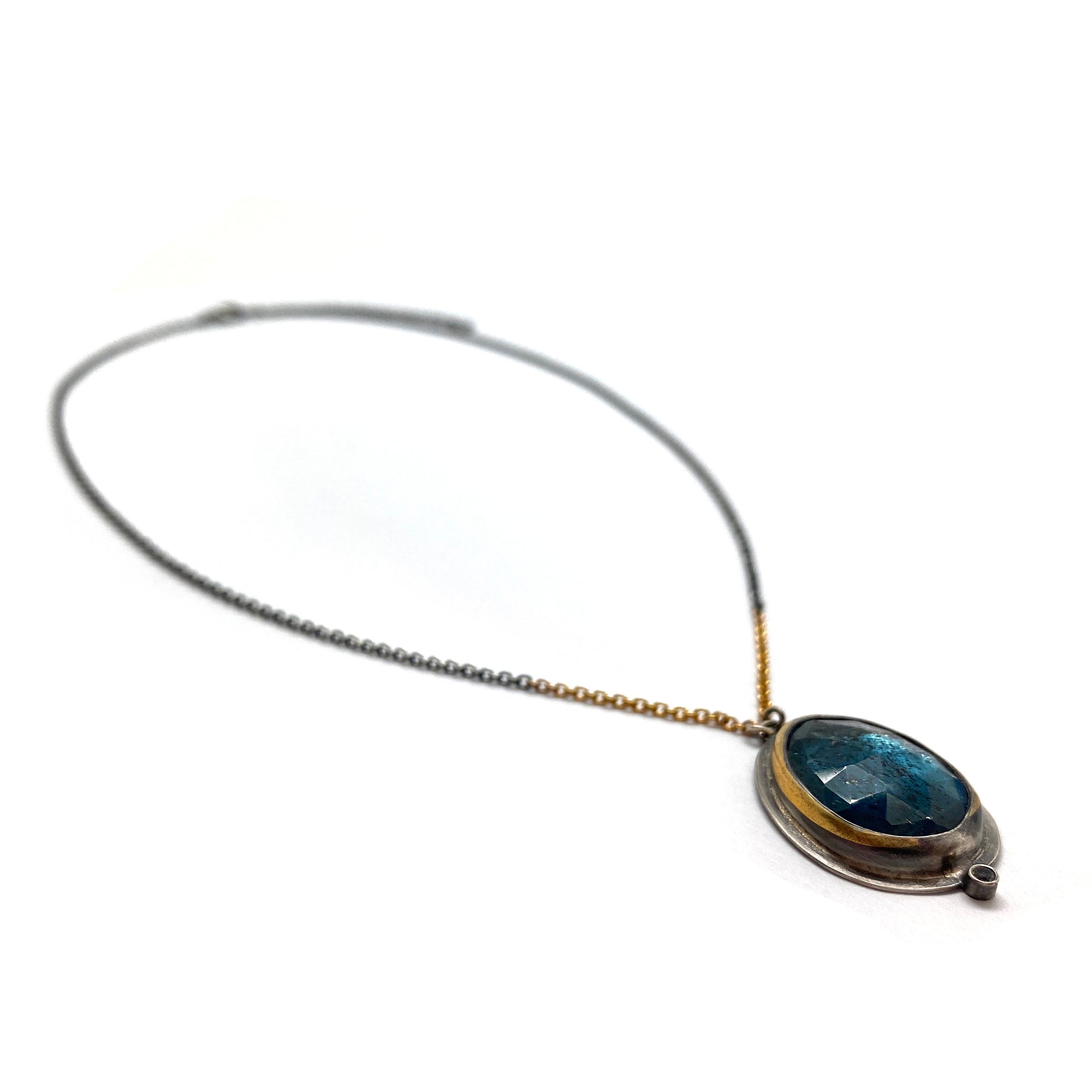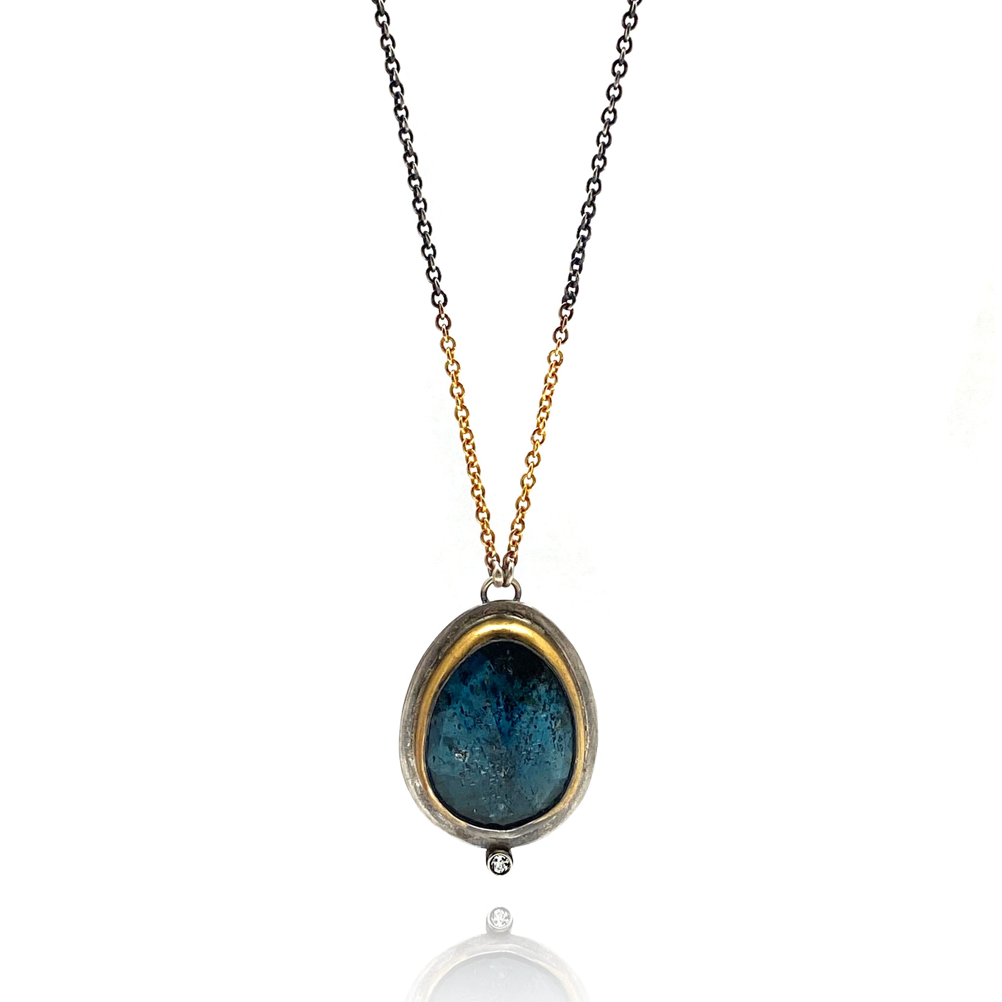 Suspended from oxidized sterling silver with accents of 24k gold, this magnificent pendant from Austin Titus stars a moss kyanite. The blue stone is set in oxidized sterling silver and 24k gold keum-boo and is accented with a white topaz.