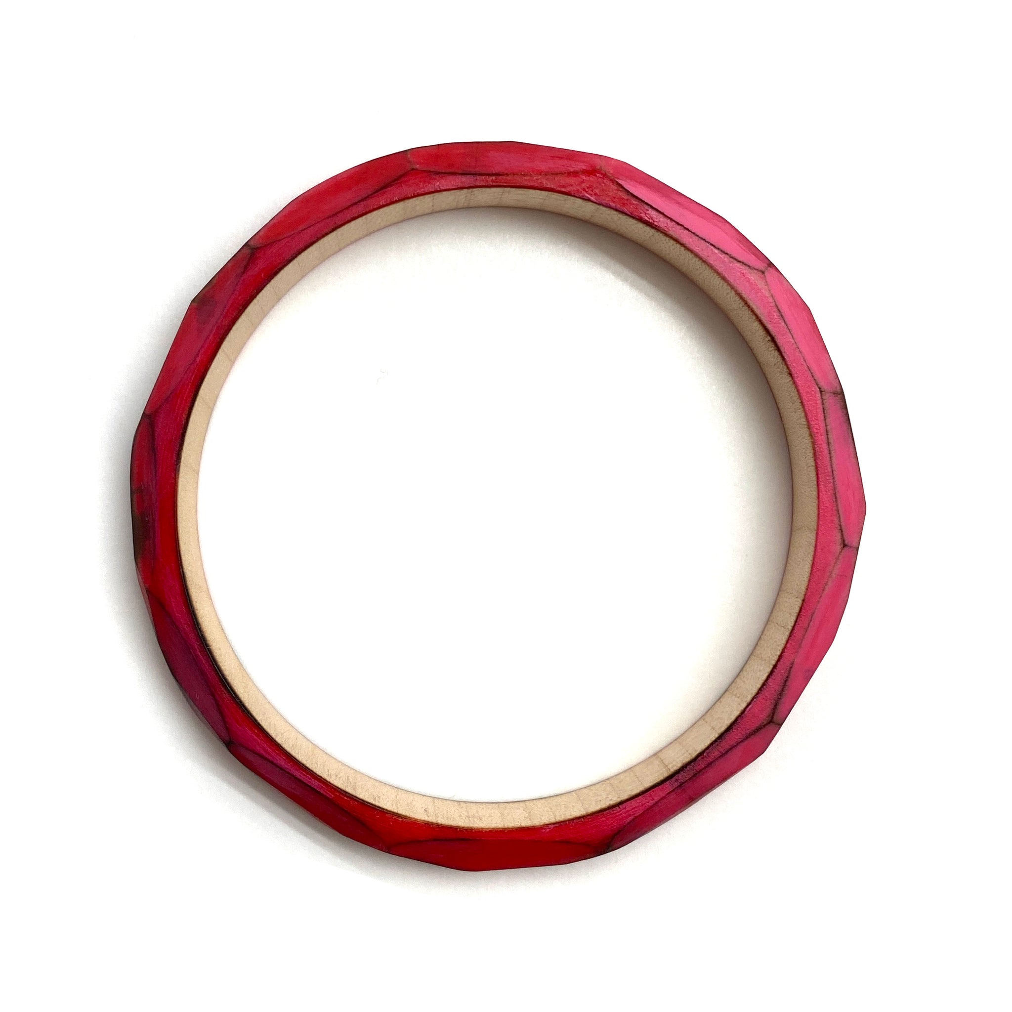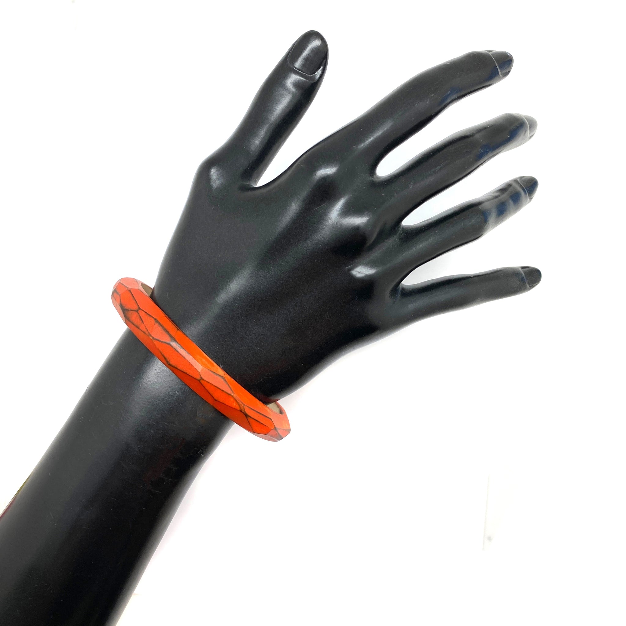 Made with painted and carved wood, this bangle is lightweight and comfortable for all day wear. This orange bracelet can pop on it's own but why not get the whole colorful set?