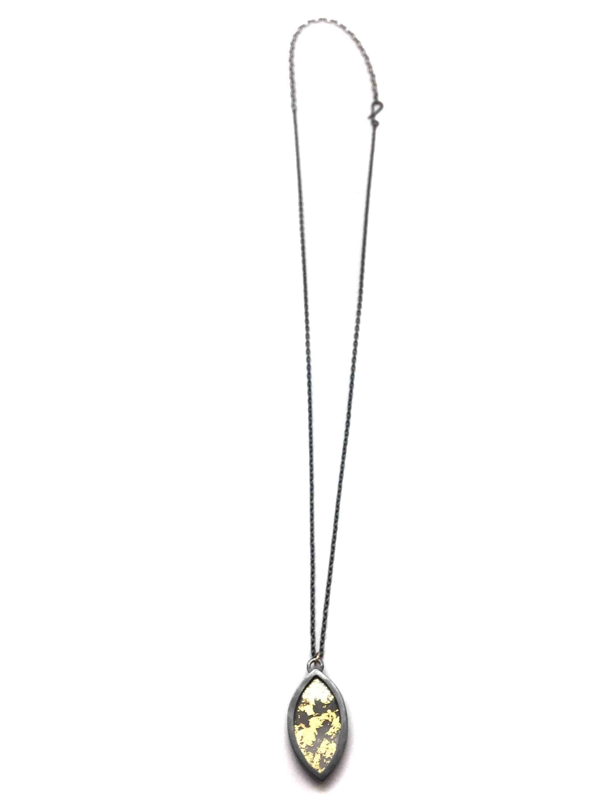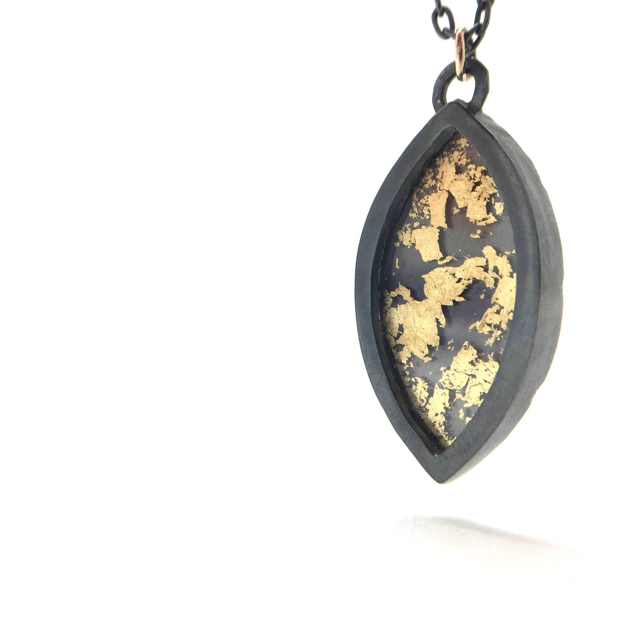 Oxidized sterling silver pendant with 23k gold encased between layers of clear polycarbonate and oxidized sterling silver.